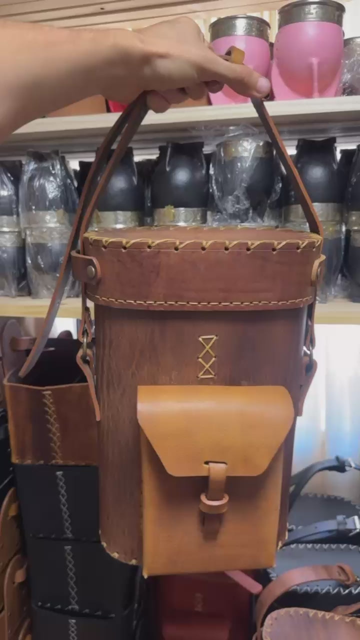 Bolso matero de cuero rígido. En su interior puedes ingresar un termo de 1.5 a 1.6 metros aproximadamente, al costado puedes también agregar tu mate imperial grande , yerbero de cuero , bombillon , azucarero y otros artículos que desees.