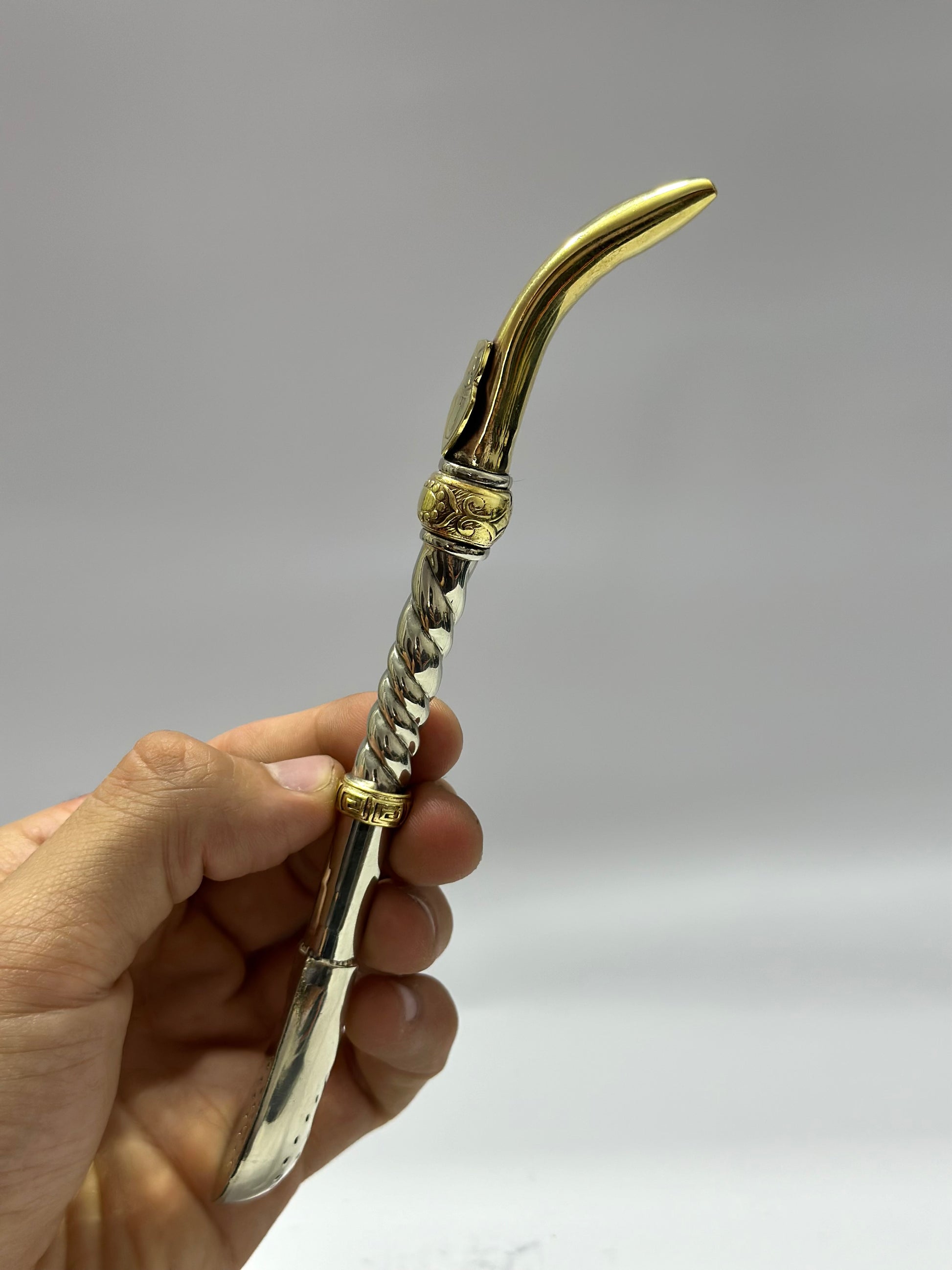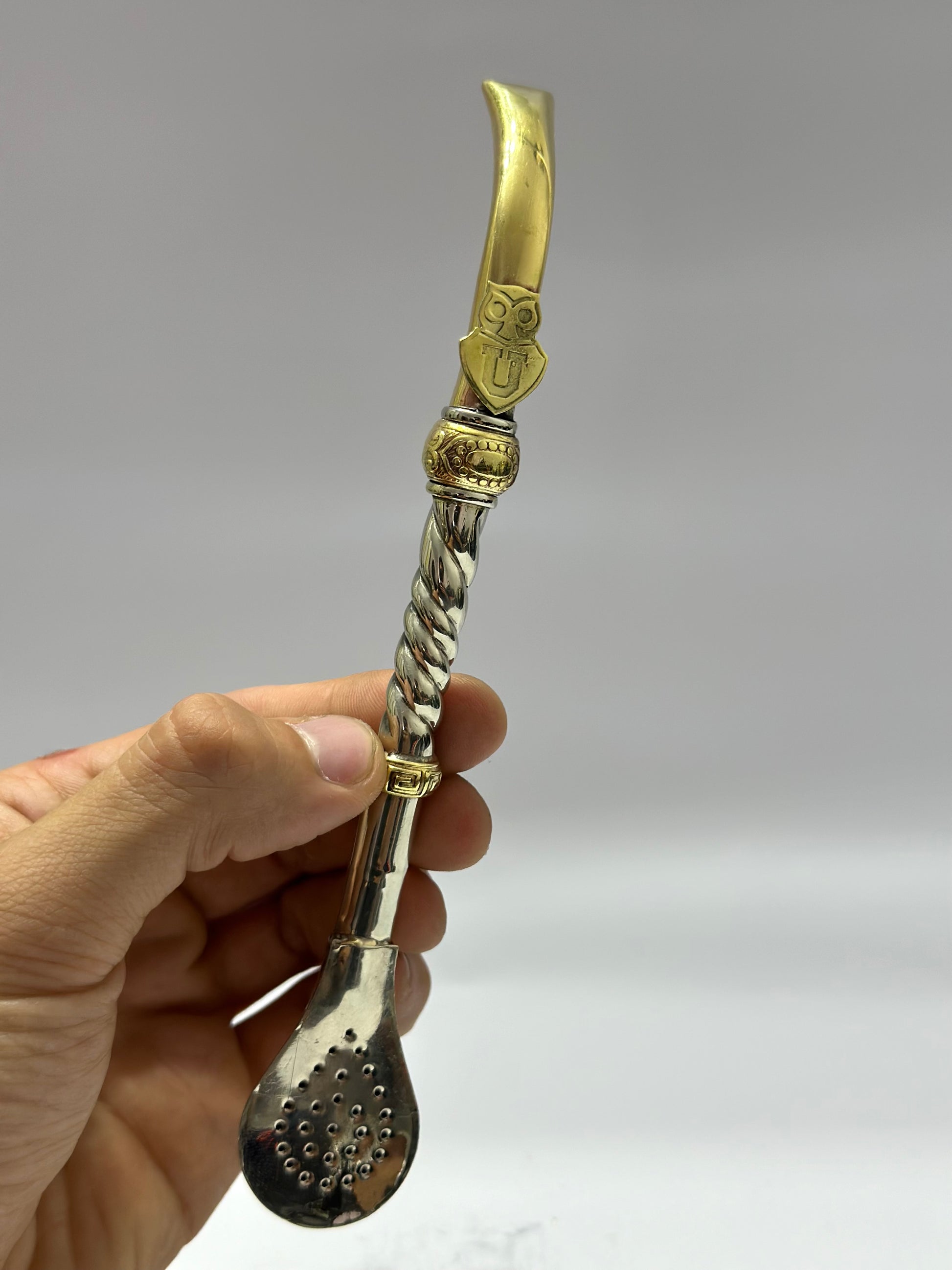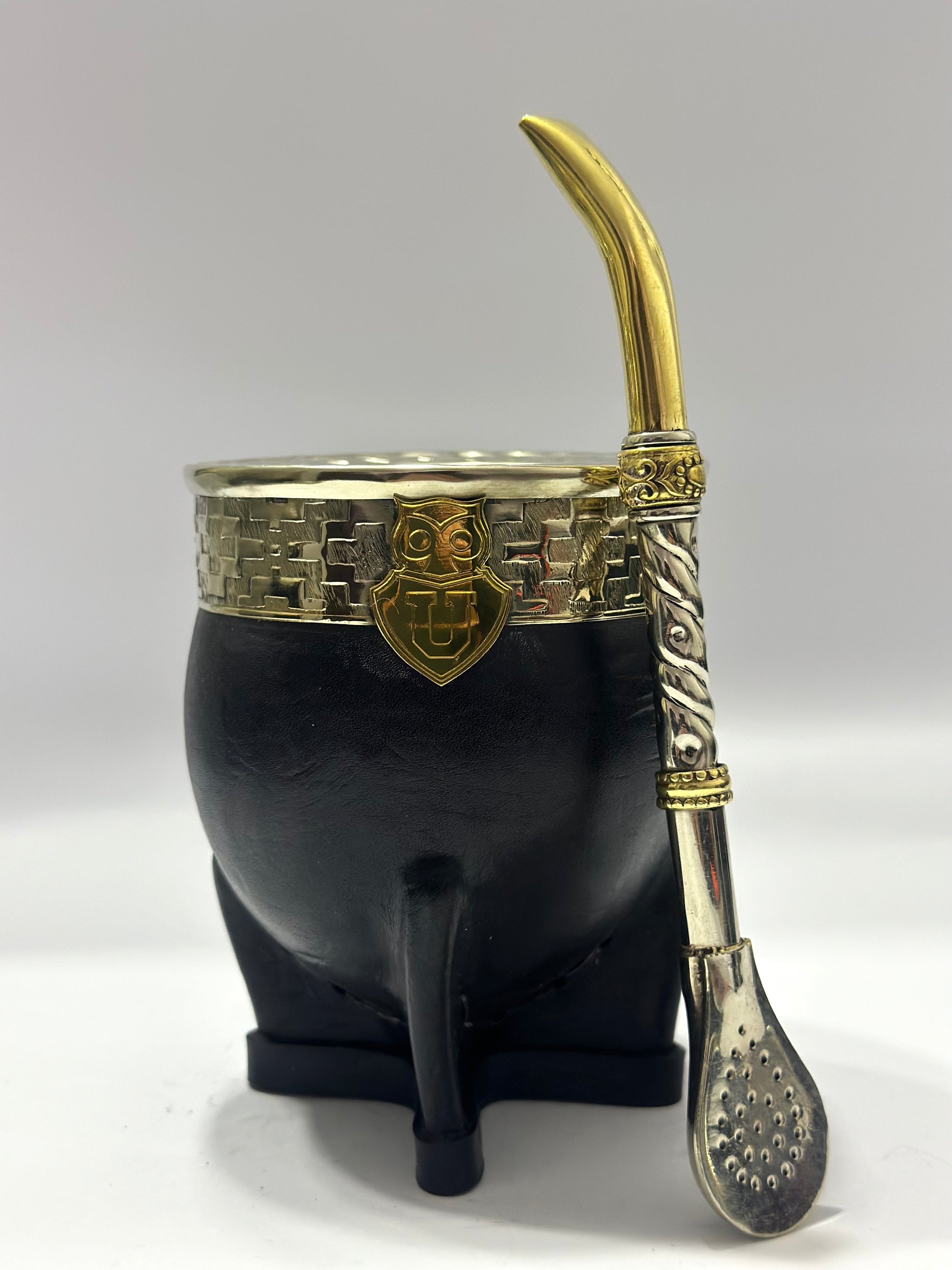 Bombillon Premium de alpaca maciza con centro cincelado, además cuenta con dos dijes extras en bronce y punta pico de loro , donde se puede observar el aplique en bronce de la Universidad de Chile, equipo de fútbol Chileno.
