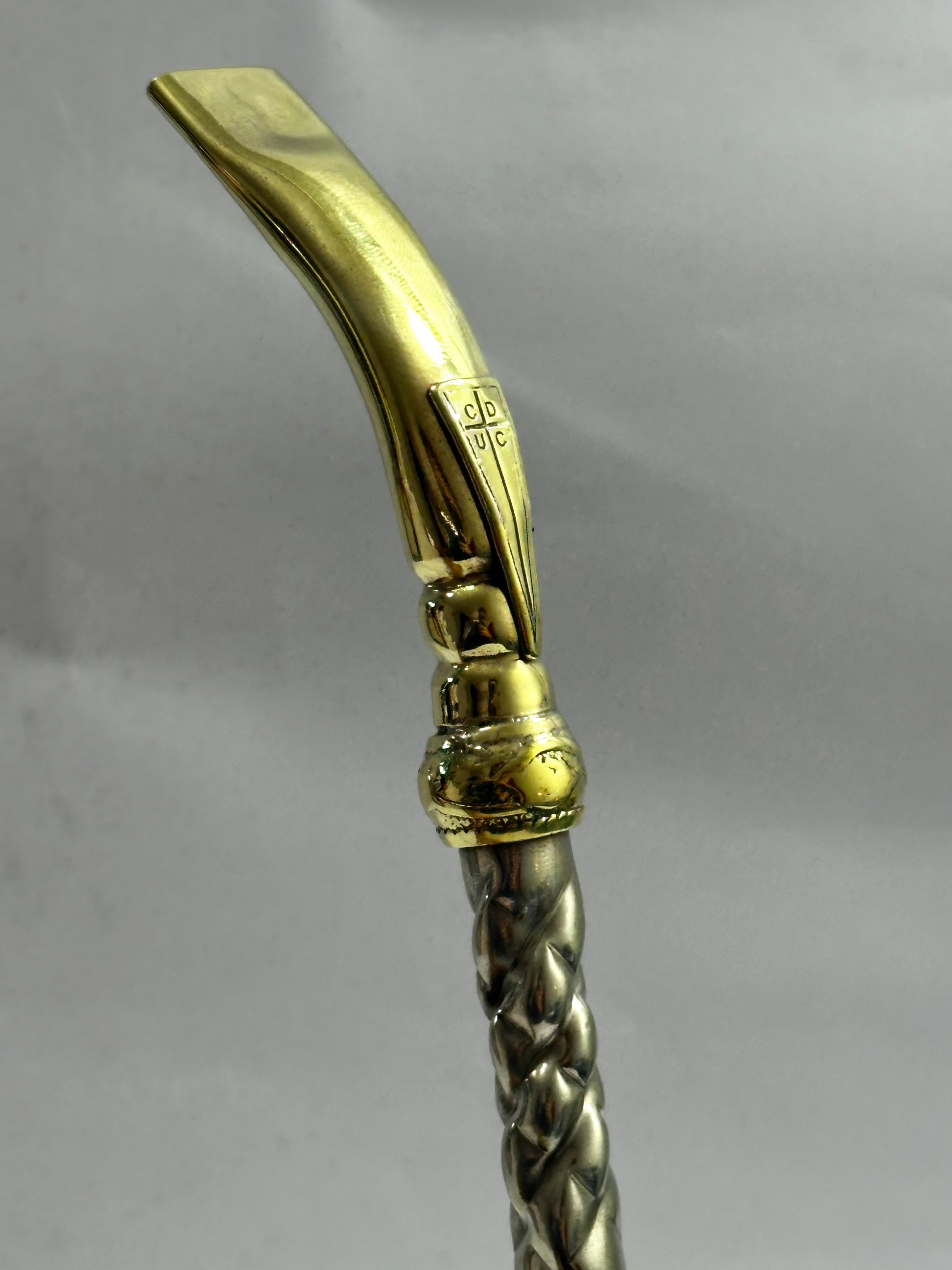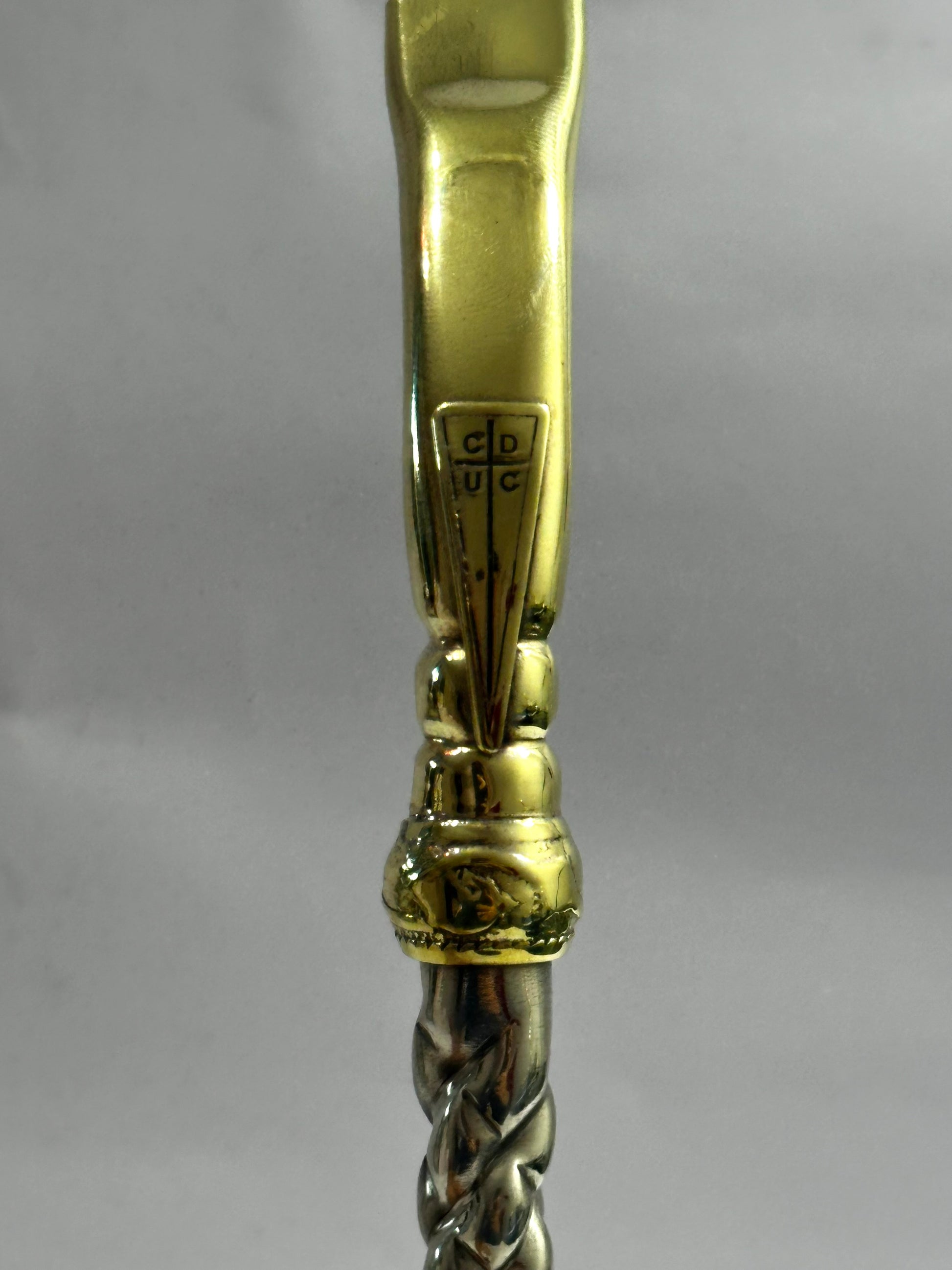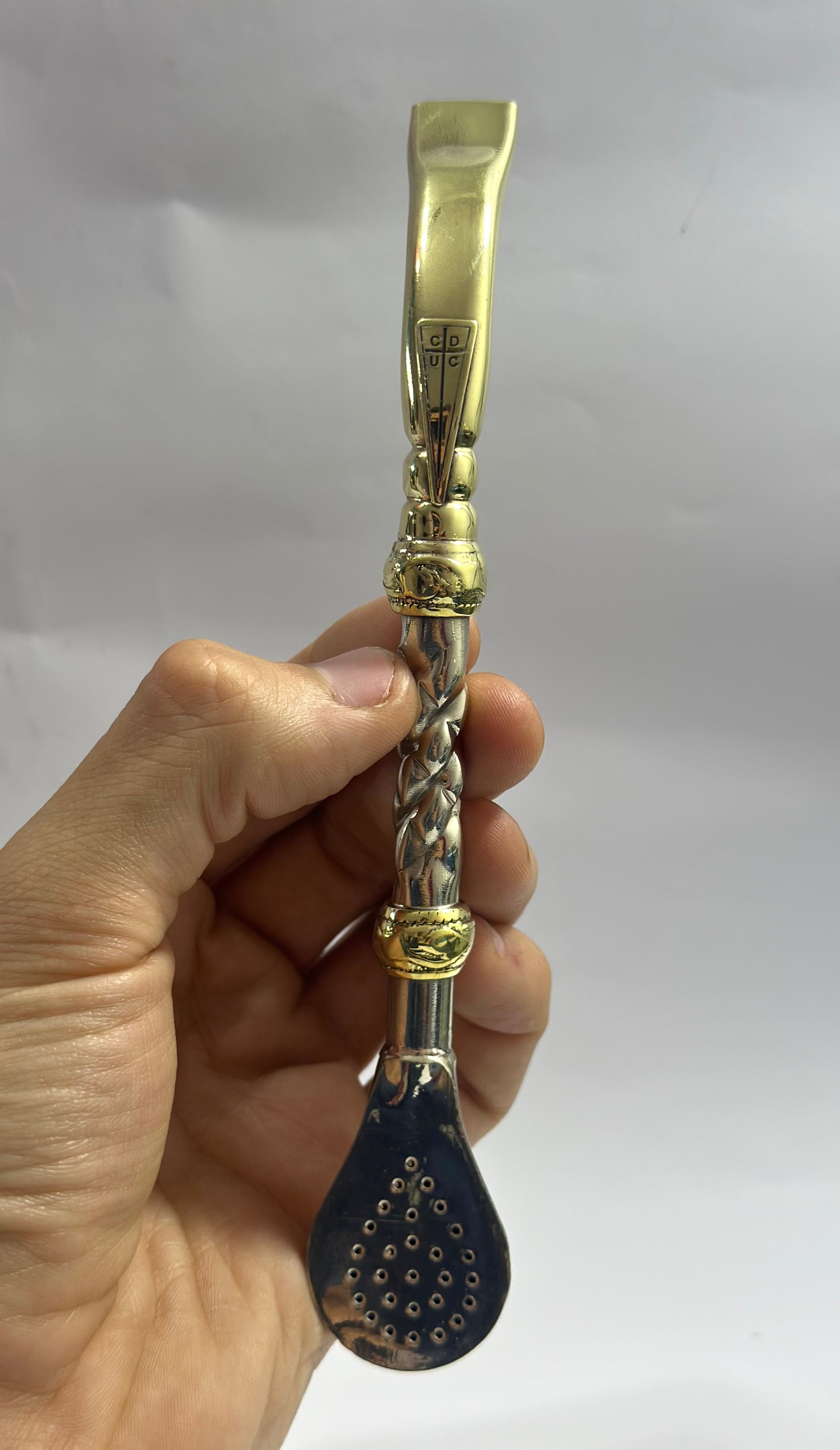Bombillon Premium de alpaca maciza con centro cincelado, además cuenta con dos dijes extras en bronce y punta pico de loro , donde se puede observar el aplique en bronce de la Universidad Católica , equipo de fútbol Chileno.