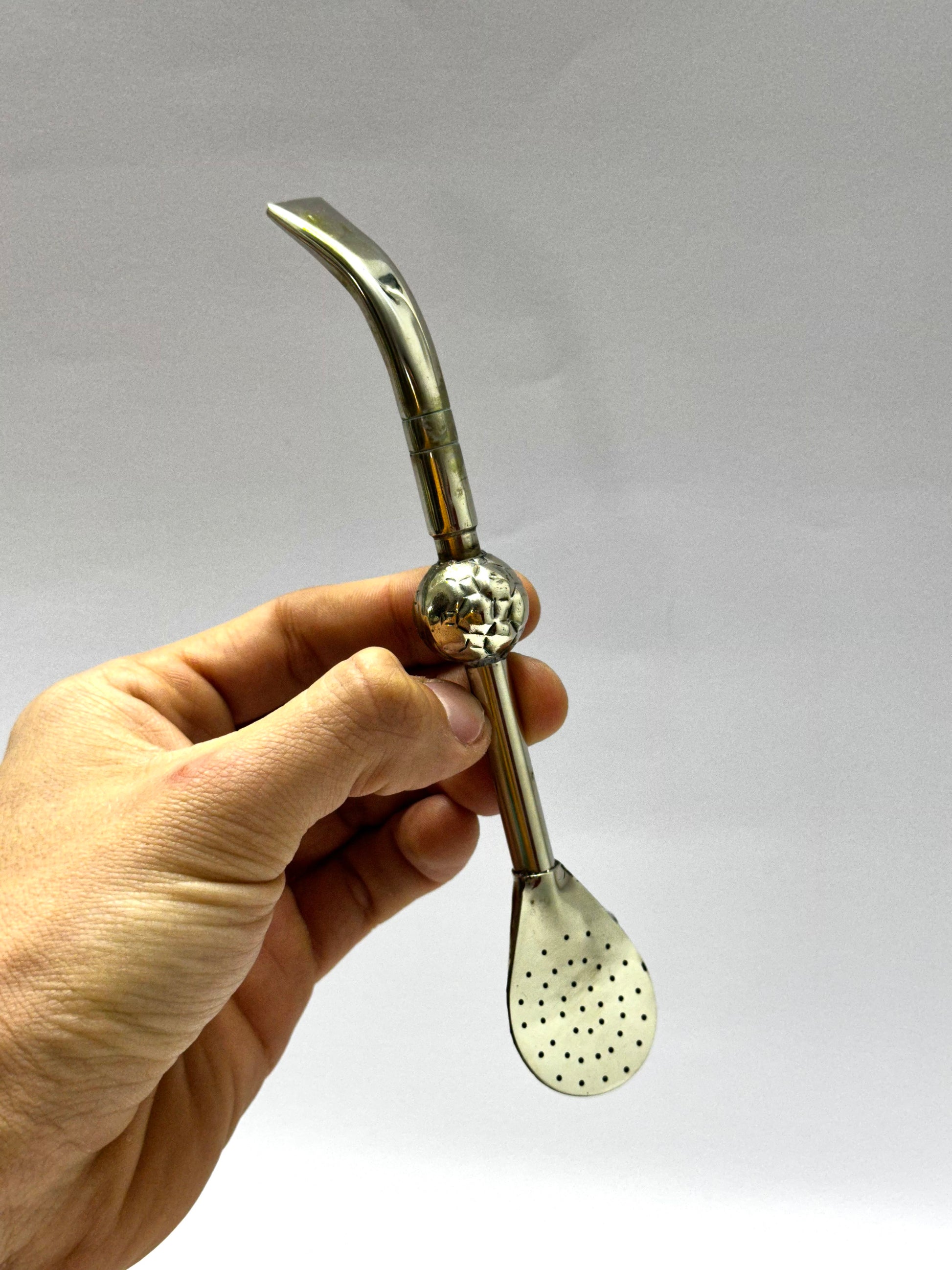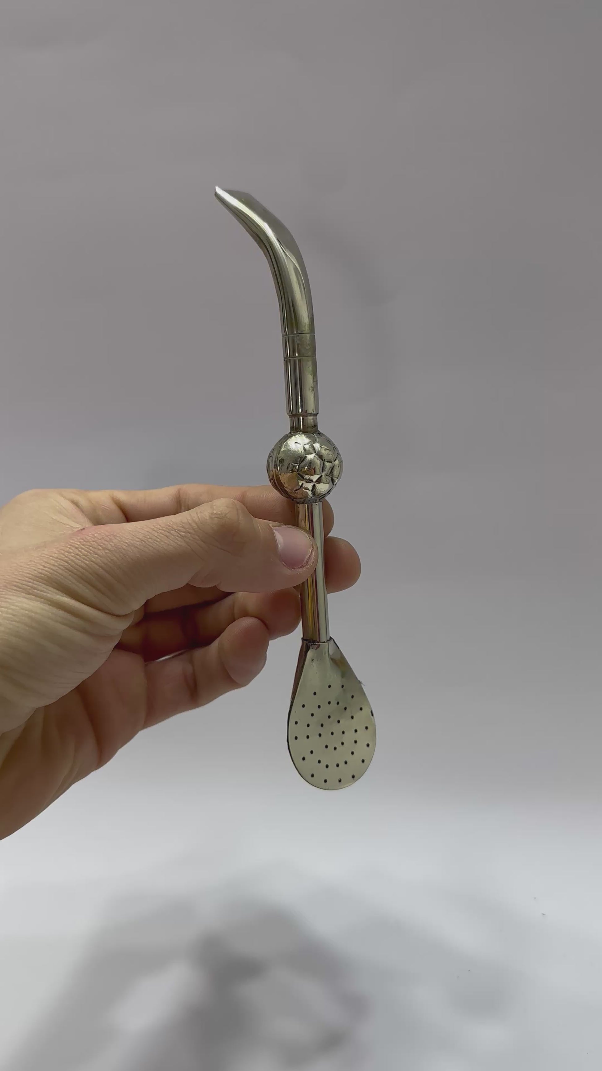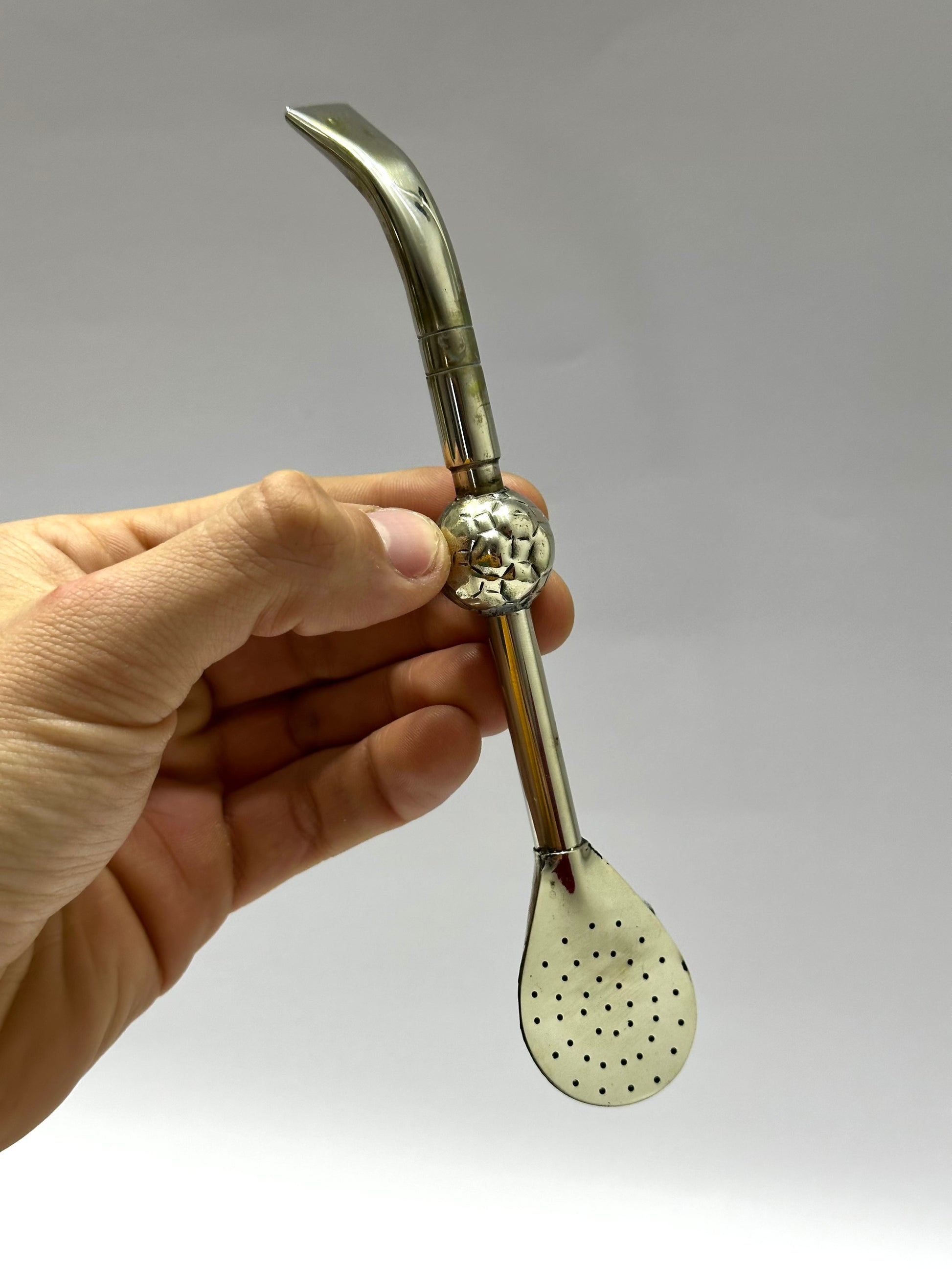 Bombillon Artesanal fabricado completamente en alpaca , con la particular de tener un balón de fútbol en el centro de este. Es de carácter uruguayo , diseñado para mateadas con yerba mate de molienda fina como Baldo, Canarias, esmeralda , Sara , entre otras. También para molienda gruesa de palo.