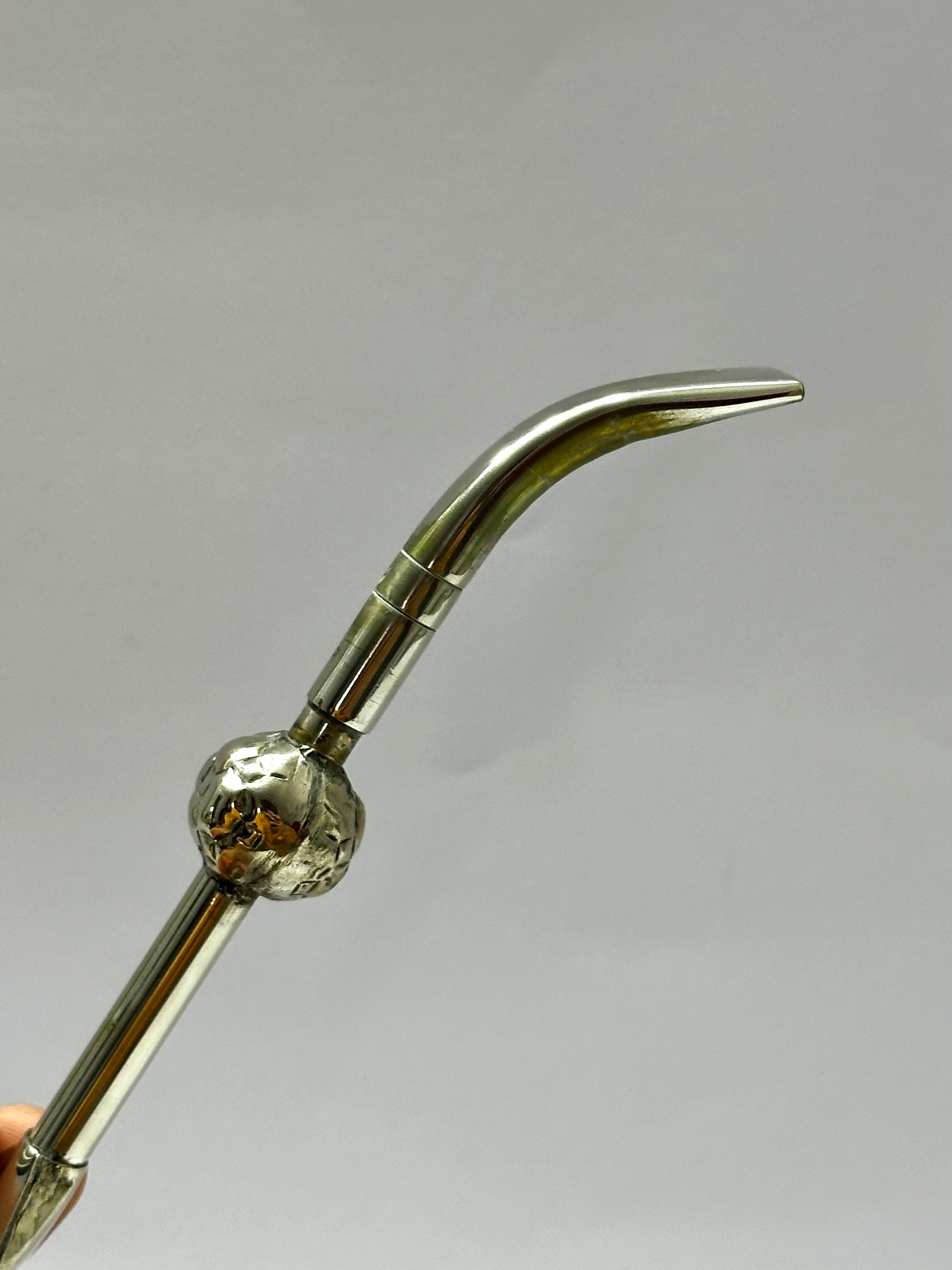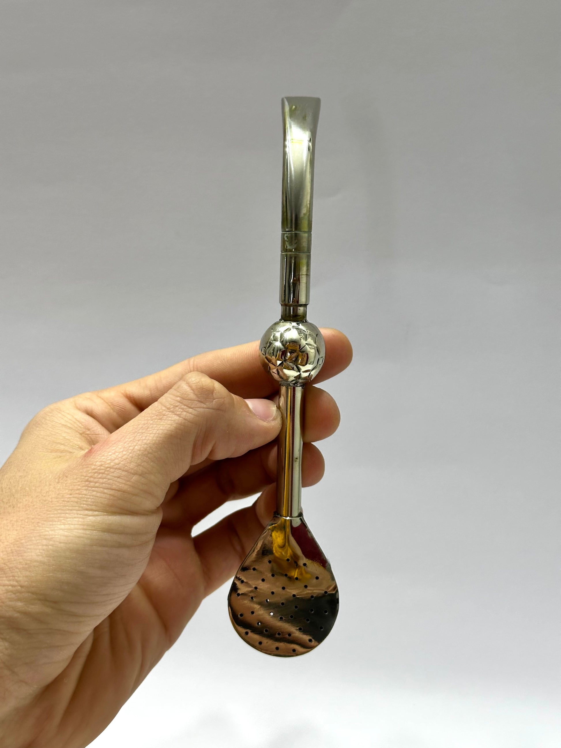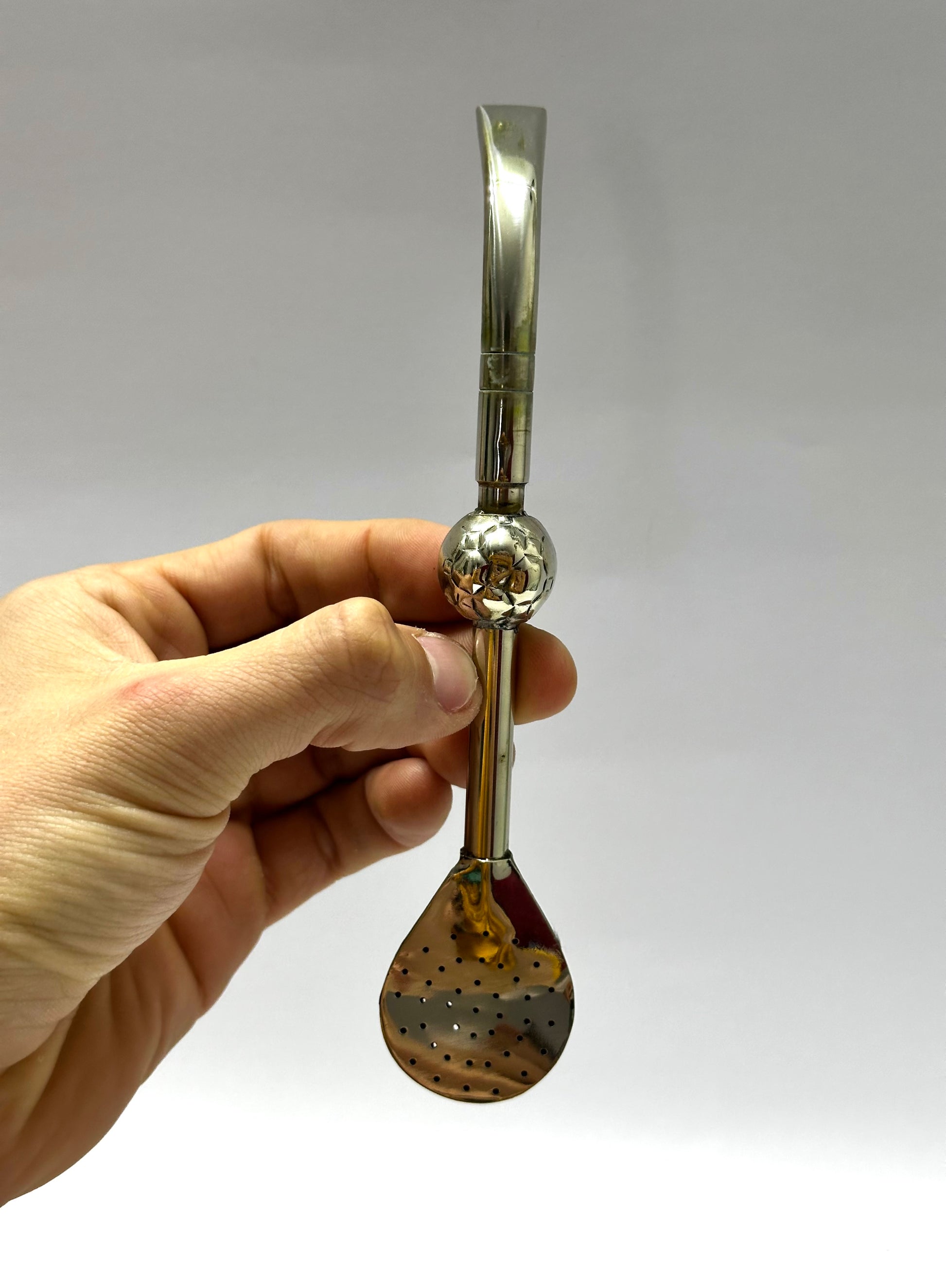 Bombillon Artesanal fabricado completamente en alpaca , con la particular de tener un balón de fútbol en el centro de este. Es de carácter uruguayo , diseñado para mateadas con yerba mate de molienda fina como Baldo, Canarias, esmeralda , Sara , entre otras. También para molienda gruesa de palo.
