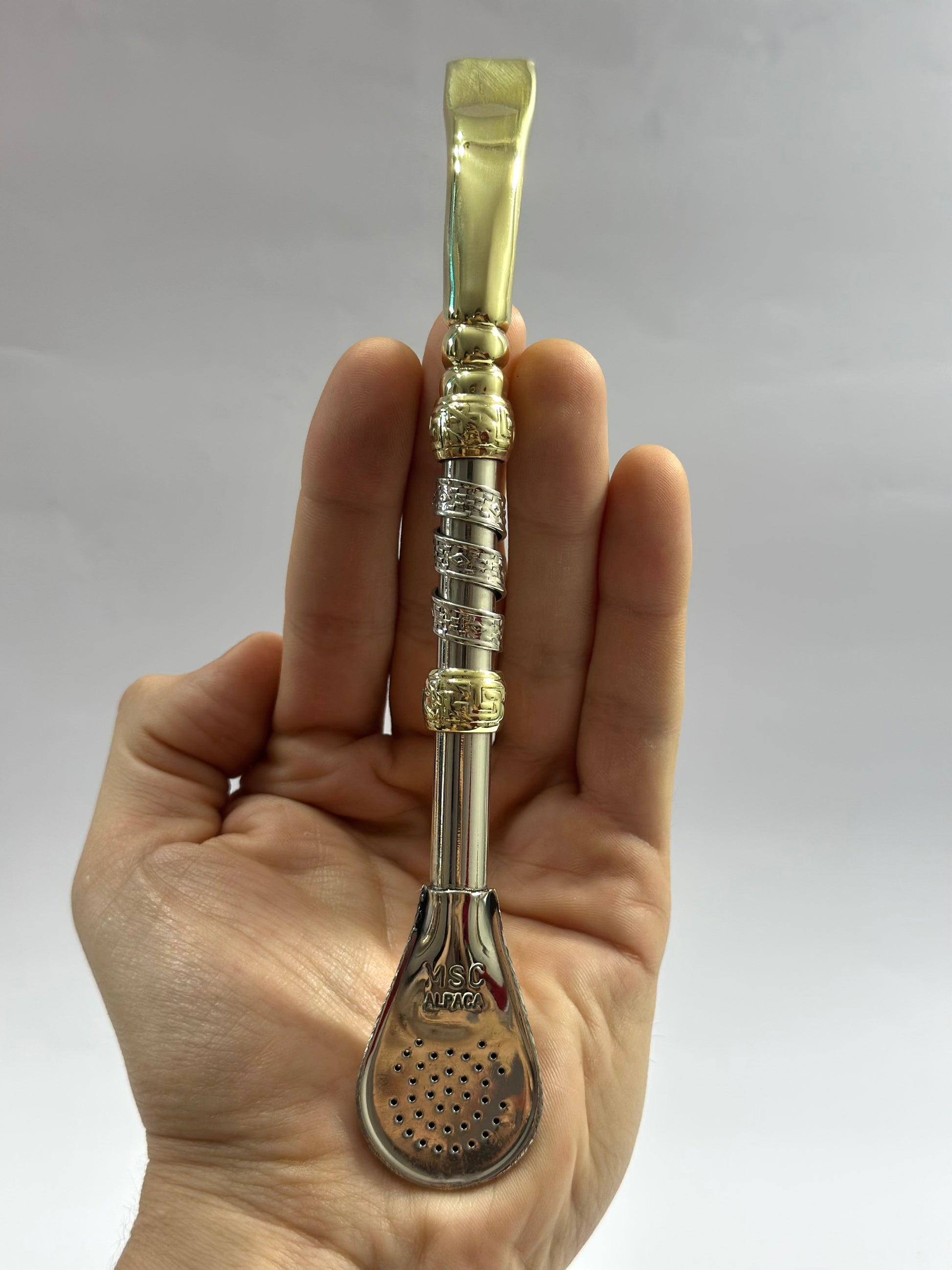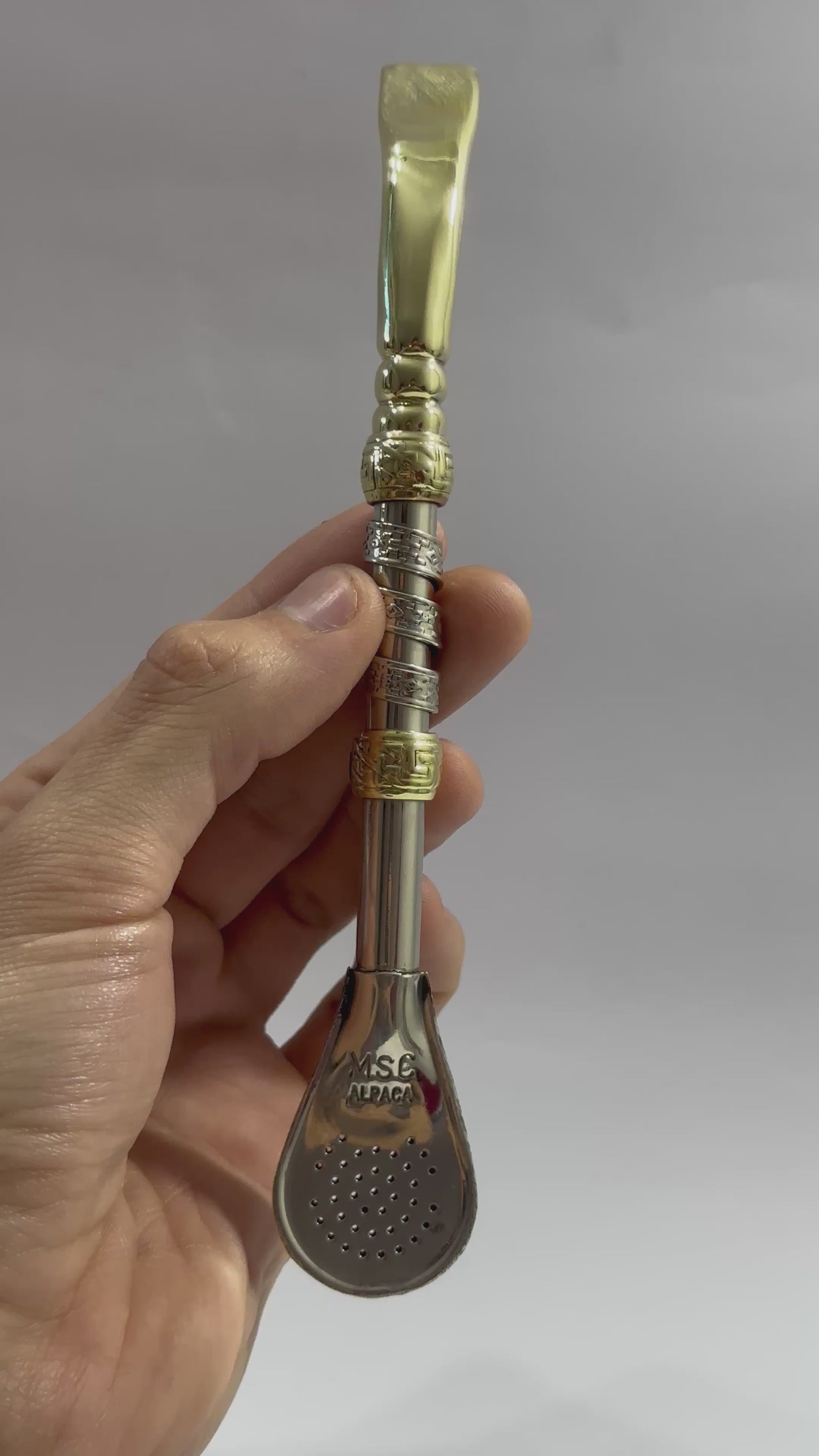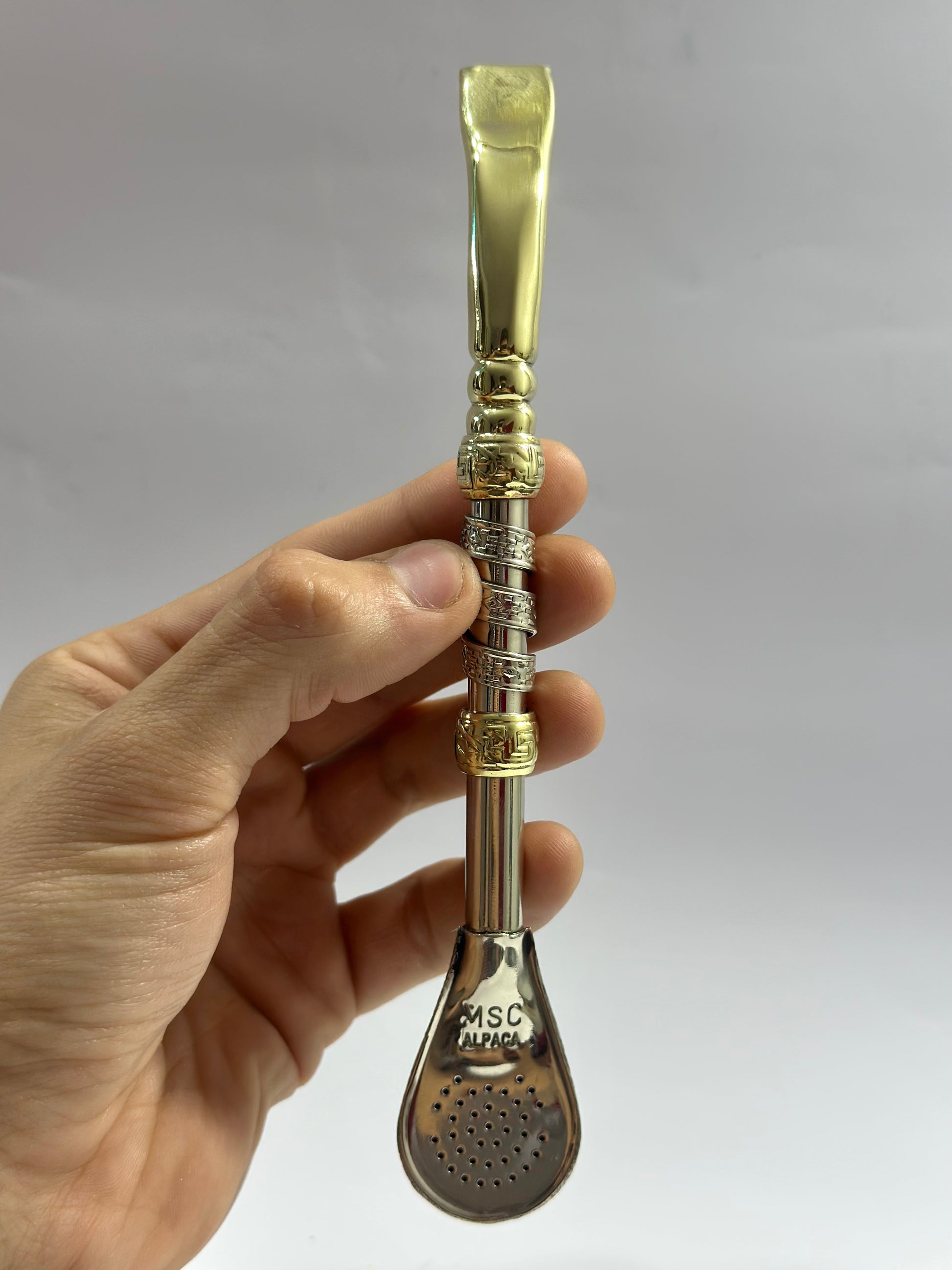 Bombillon de Alpaca maciza con pico curvo en bronce , toda su estructura está fabricada en Alpaca como también la punta que está fabricada en Bronce, la particularidad de este bombillon Artesanal es el “camino del Inca” adherido a su estructura está fabricada, brindando ese detalle único a esta artesanía, su filtro es argentino y esta confeccionado también en alpaca soldado en plata a la estructura, para que sea eterno .