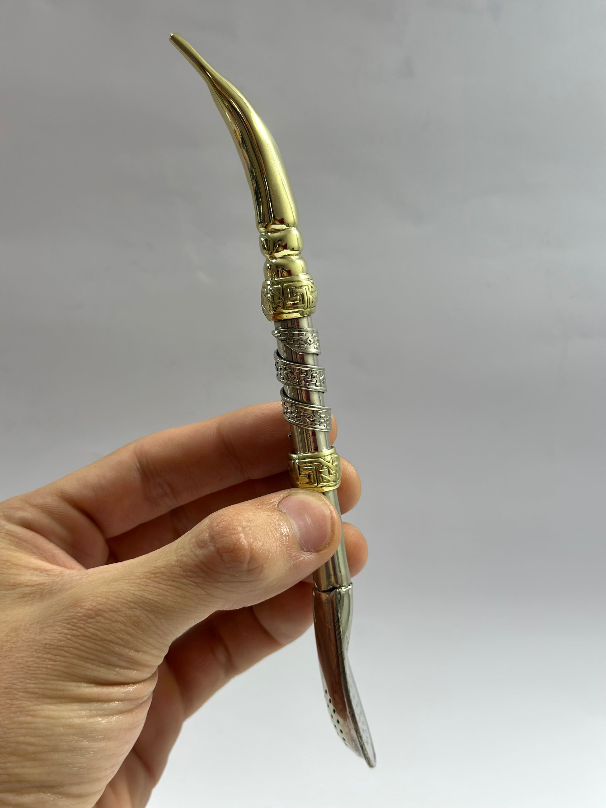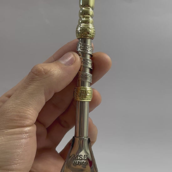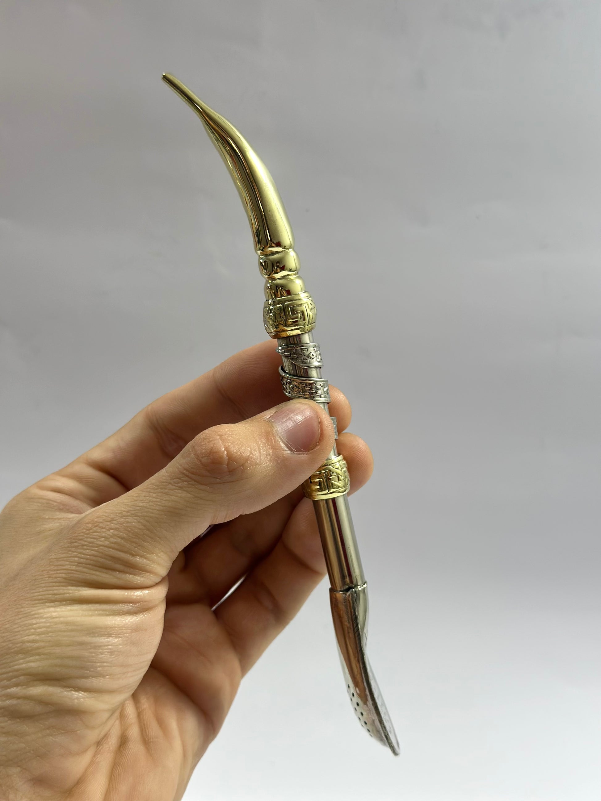 Bombillon de Alpaca maciza con pico curvo en bronce , toda su estructura está fabricada en Alpaca como también la punta que está fabricada en Bronce, la particularidad de este bombillon Artesanal es el “camino del Inca” adherido a su estructura está fabricada, brindando ese detalle único a esta artesanía, su filtro es argentino y esta confeccionado también en alpaca soldado en plata a la estructura, para que sea eterno .