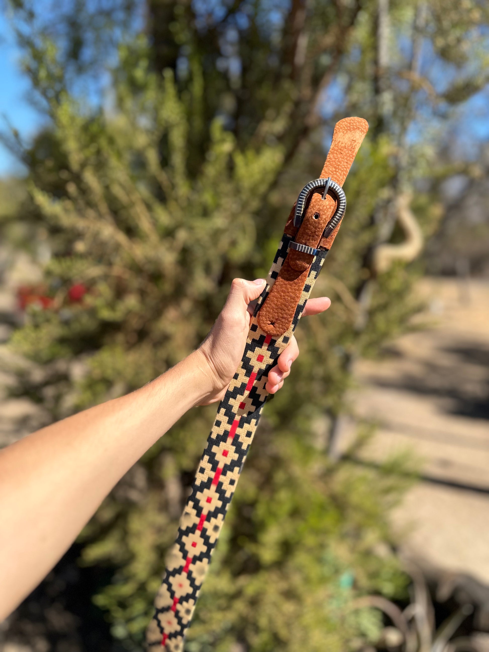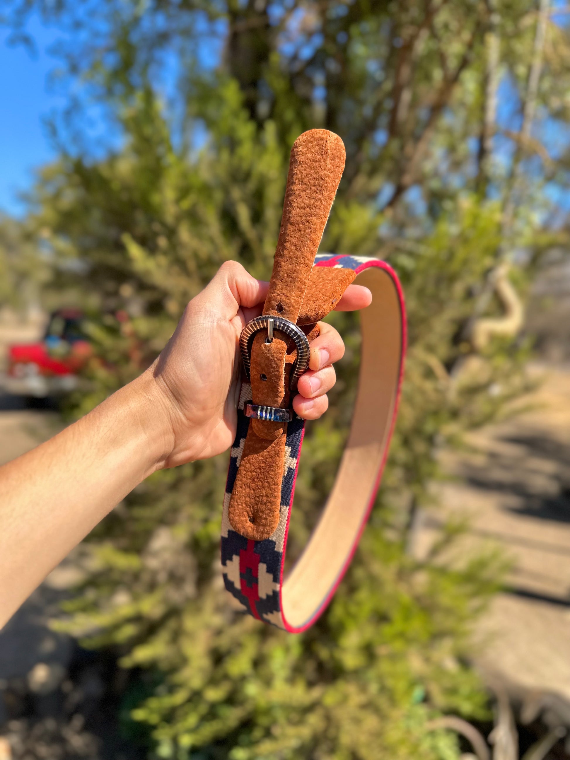 Cinturón de cuero con manto pampa en el centro, además viene con hebilla chapeada y las puntillas vienen fabricadas en cuero carpincho de selección, este cinturón tiene una medida de 106 cm de punta a punta .