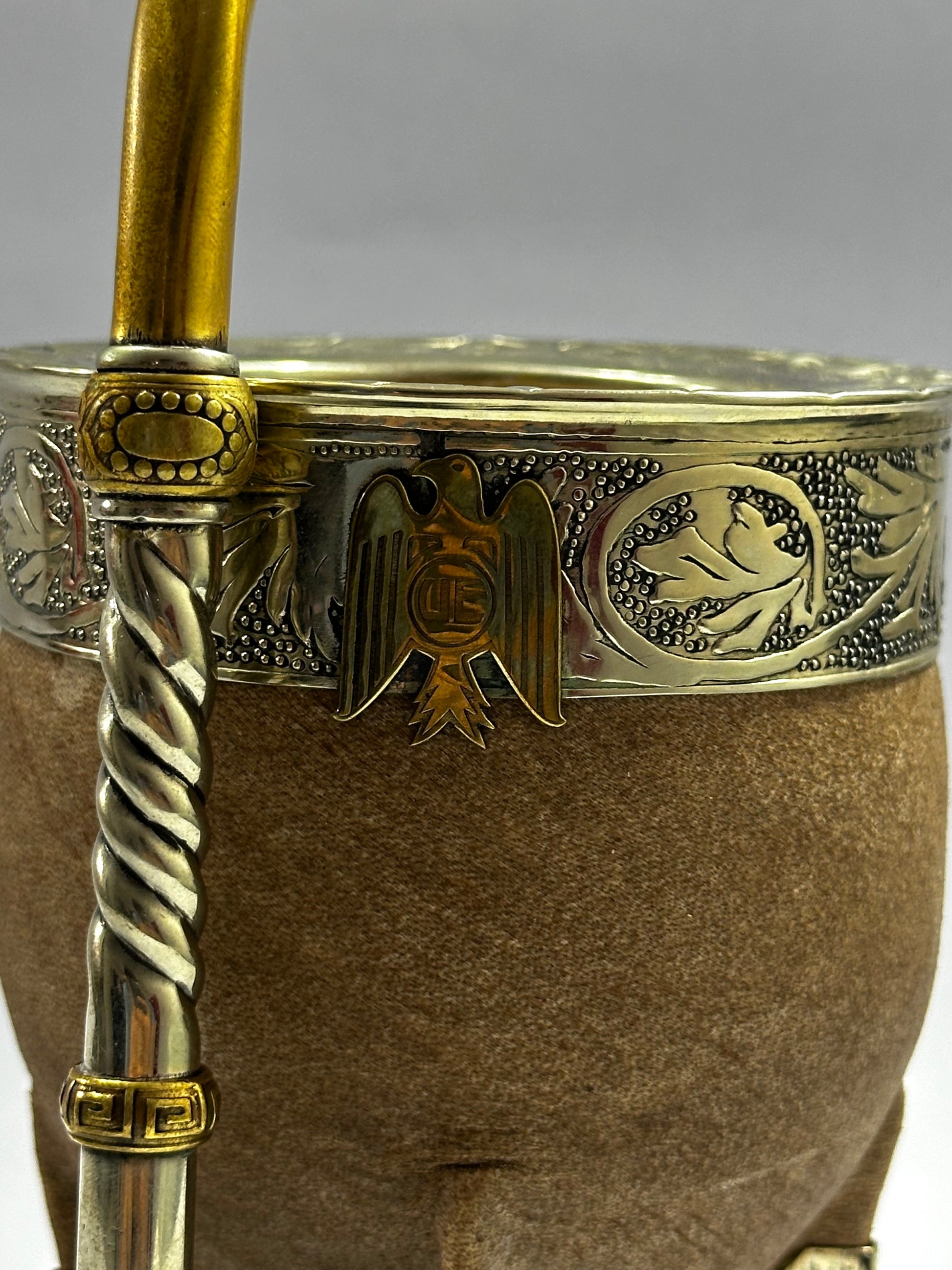 Mate imperial Premium trabajado en cuero crudo con virola de alpaca cincelada, este modelo se destaca por su base completa reforzada en alpaca y esferas en bronce. Además cuenta con un personalizado del escudo del club de Fútbol Unión española .