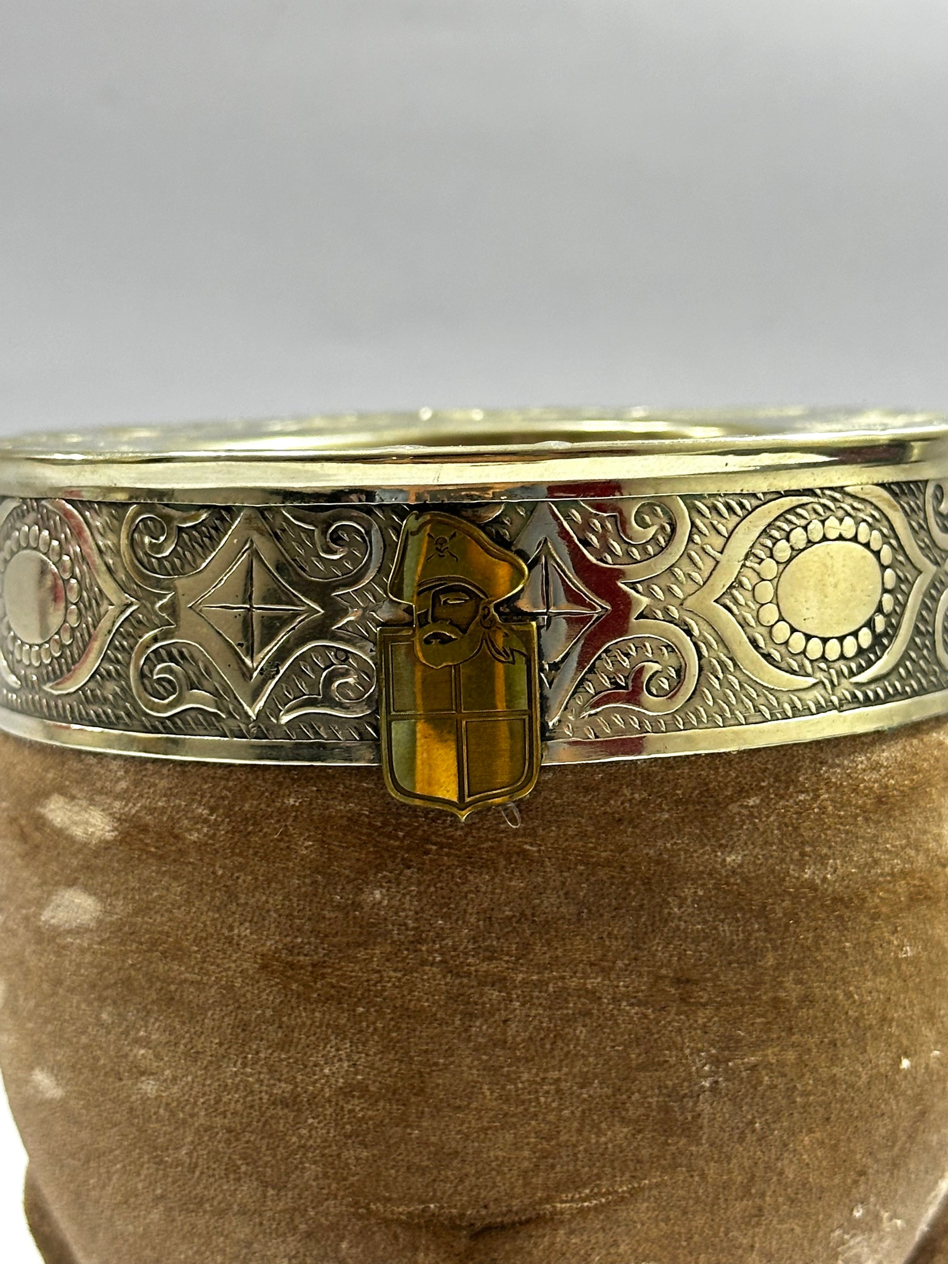 Mate imperial Premium trabajado en cuero crudo con virola de alpaca cincelada, este modelo se destaca por su base completa reforzada en alpaca y esferas en bronce. Además cuenta con un personalizado del escudo del club de Fútbol Coquimbo Unido.