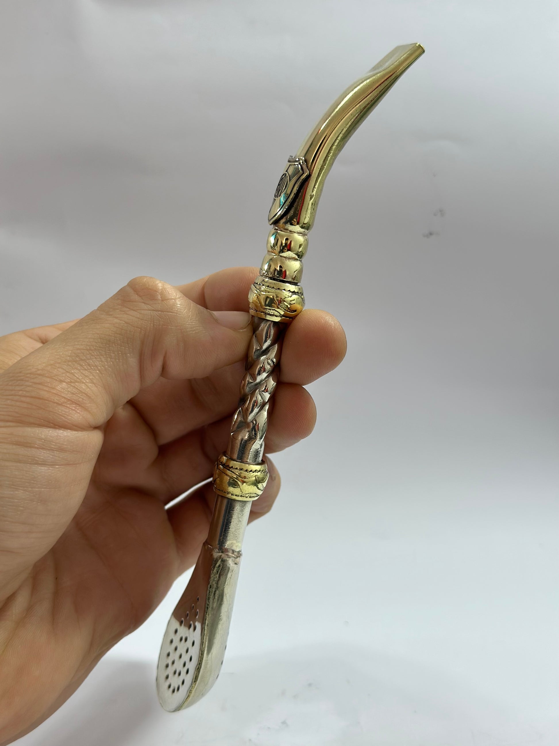 Mate imperial de calabaza con virola de alpaca cincelada, y trabajado en cuero Bi-Color , haciendo referencia a los colores de la institución del Club Atlético River Plate, a su vez en el frontis del fleje de alpaca está soldado a su estructura el logo del Club, con soldadura de plata en particular para brindar durabilidad y a su vez elegancia a un trabajo tan delicado como este. Este conjunto incluye nuestro bombillon artesanal de alpaca trenzada pico de loro en bronce, también con el logo del Club Atlético River Plate.