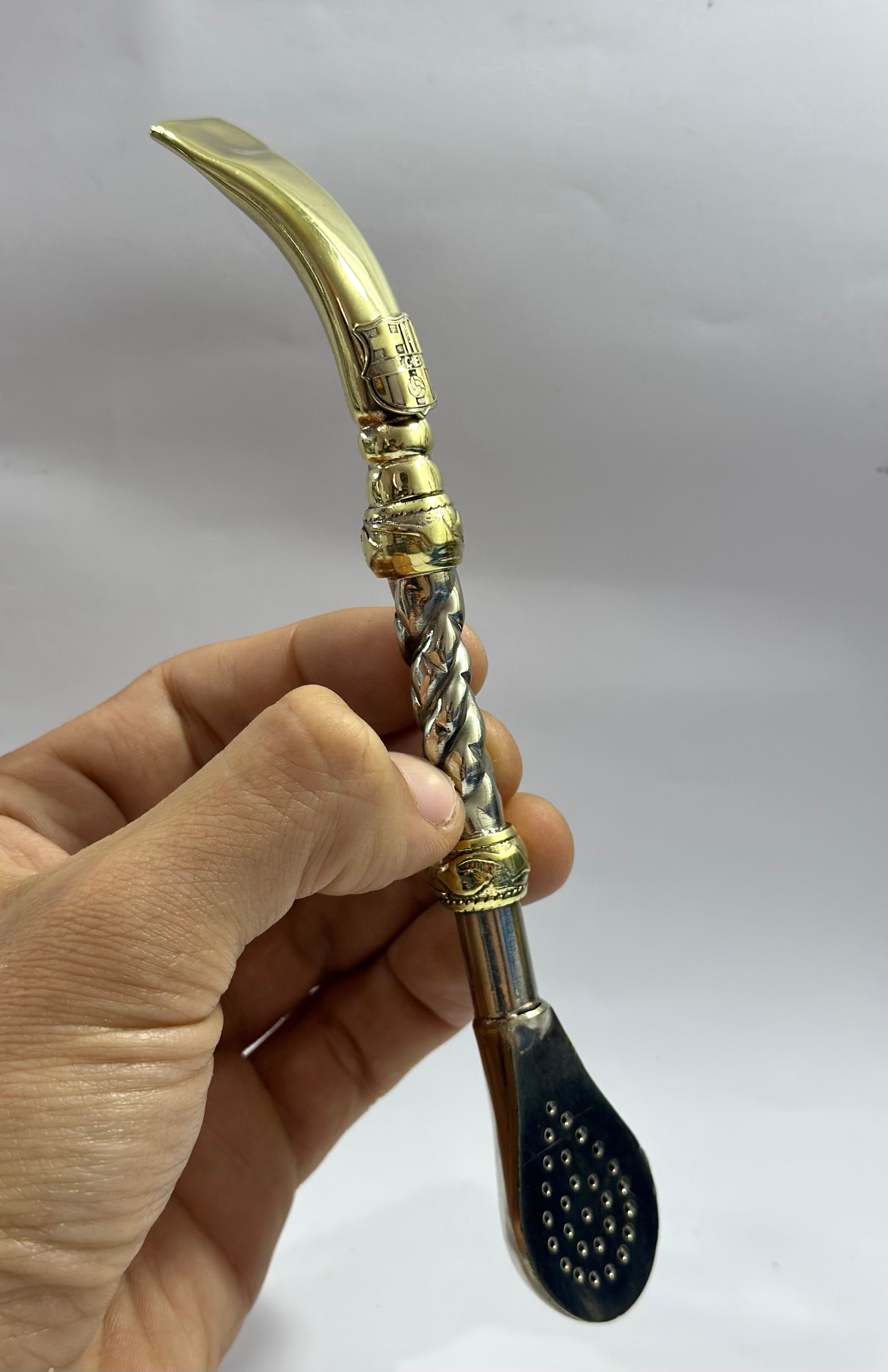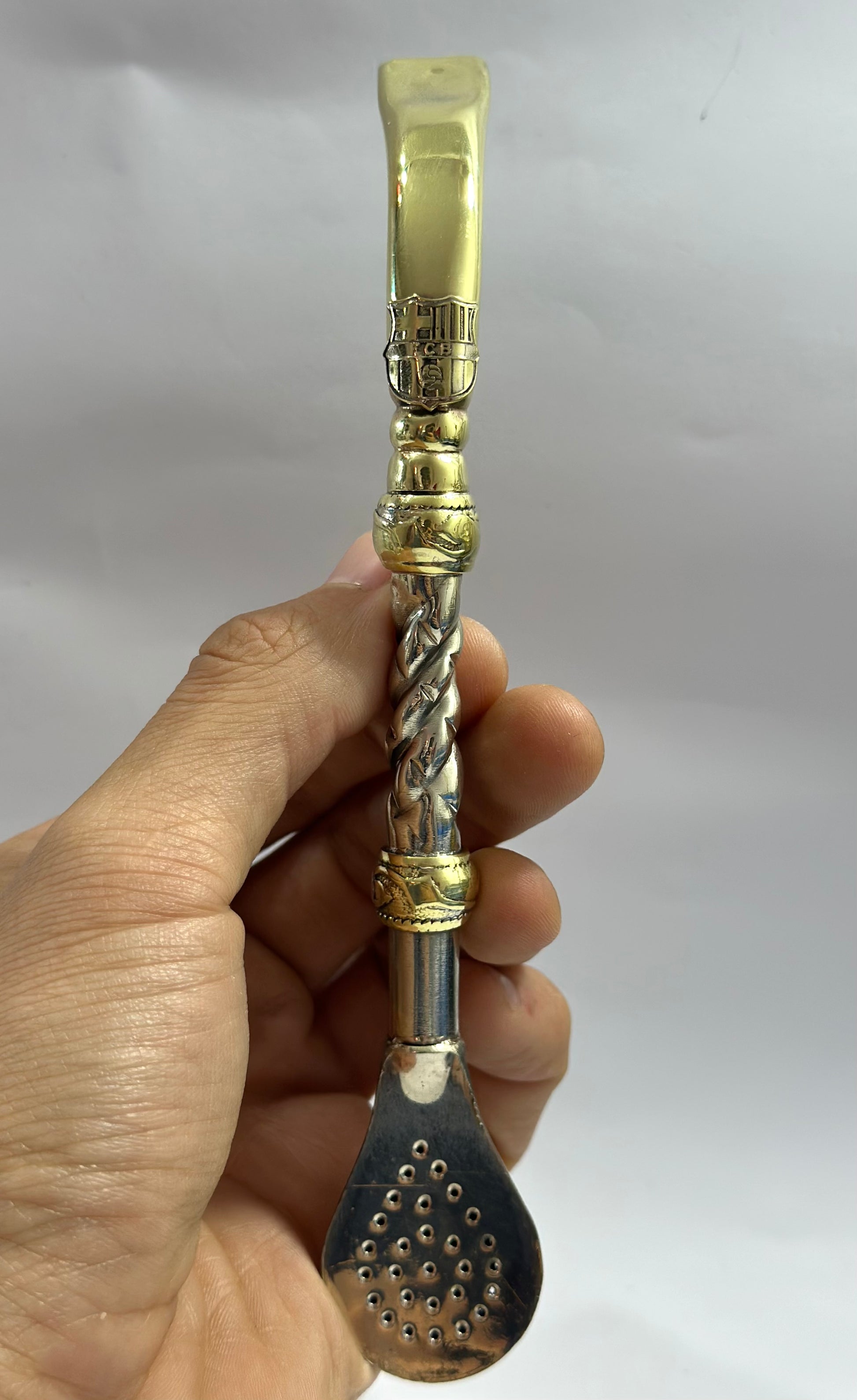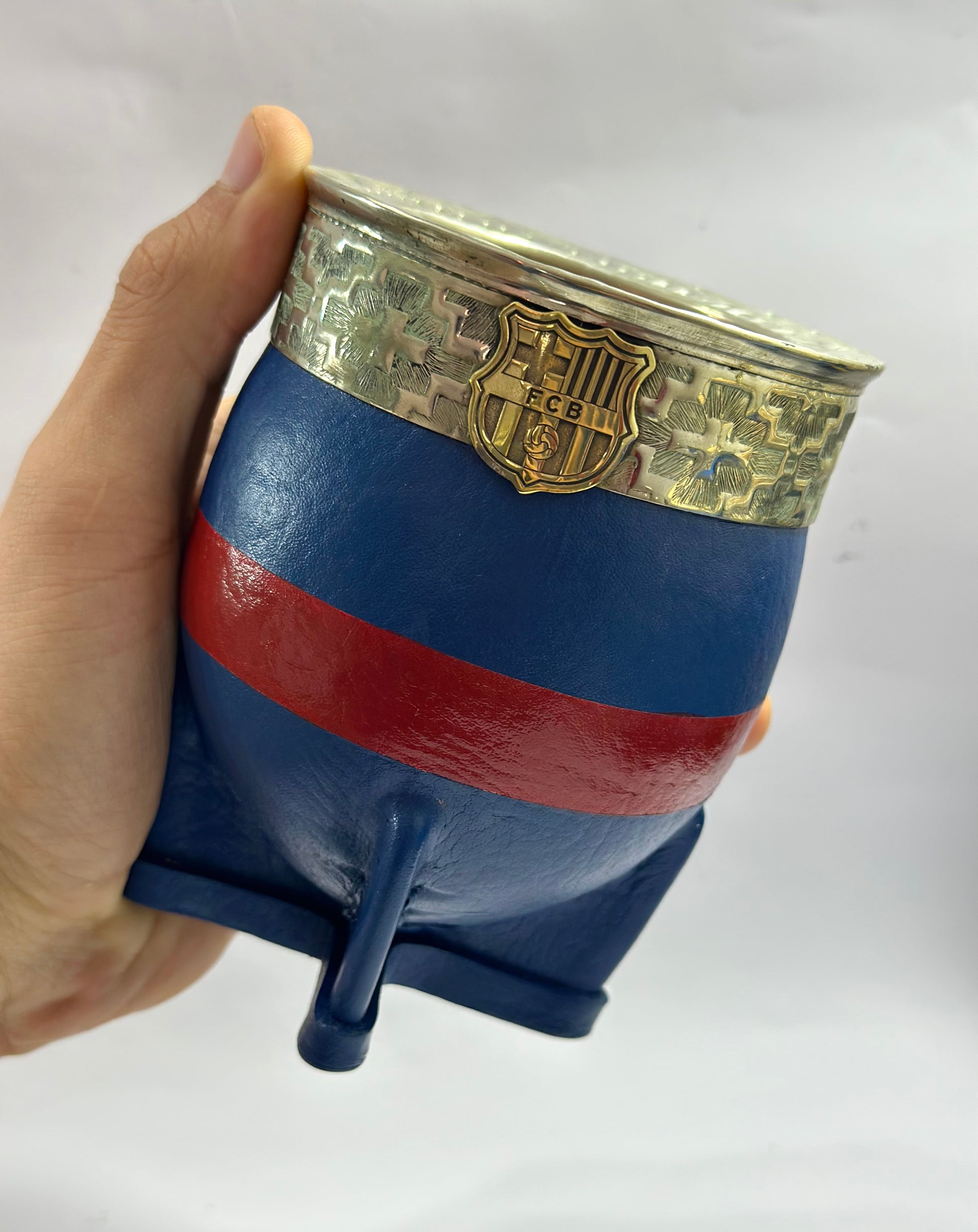 Mate imperial de calabaza con virola de alpaca cincelada, y trabajado en cuero Bi-Color , haciendo referencia a los colores de la institución del Club Barcelona de España , a su vez en el frontis del fleje de alpaca está soldado a su estructura el logo del Club de fútbol, con soldadura de plata en particular para brindar durabilidad y a su vez elegancia a un trabajo tan delicado como este. Este conjunto incluye nuestro bombillon artesanal de alpaca trenzada pico de loro en bronce, también con el logo de la institución.