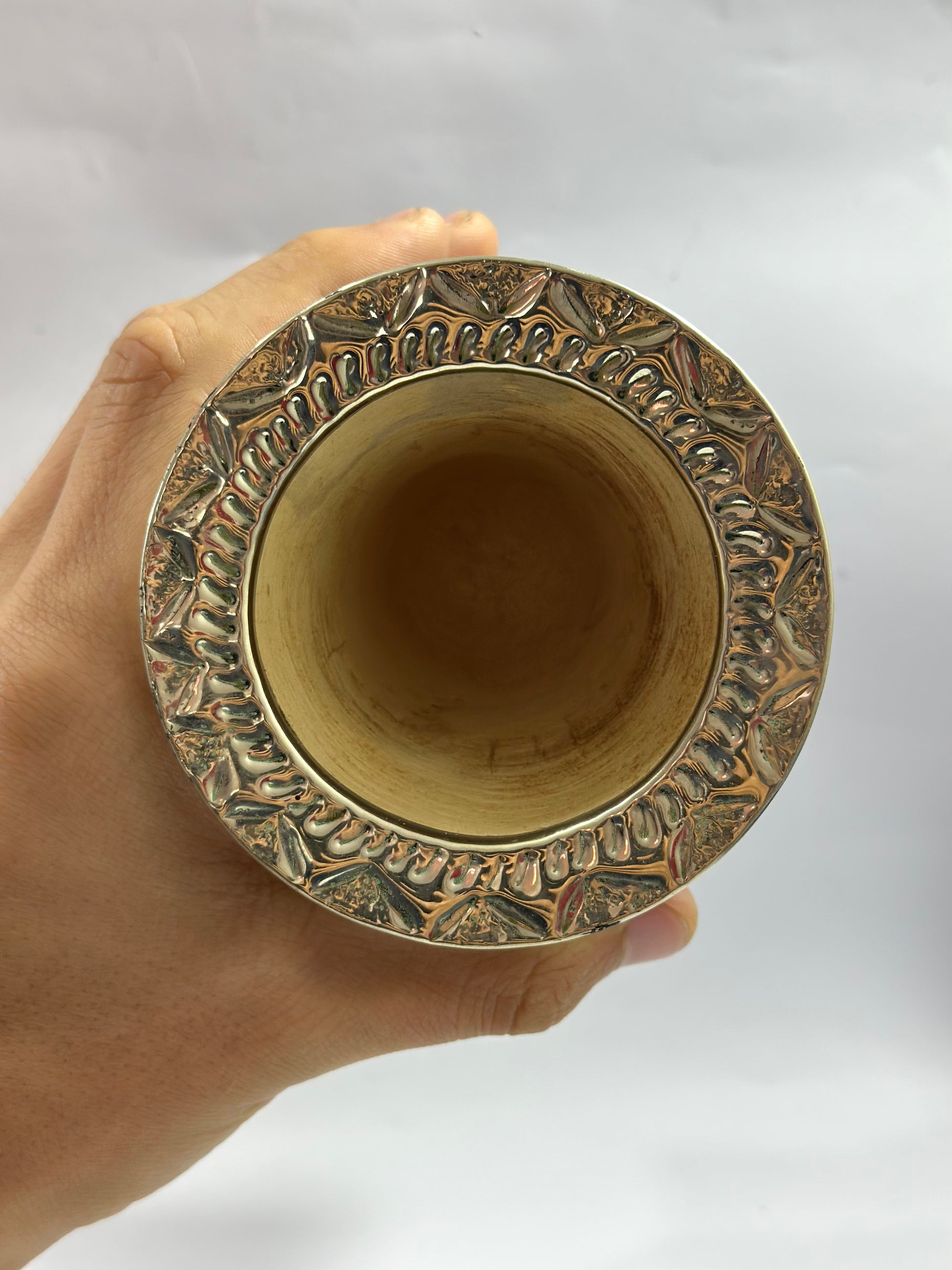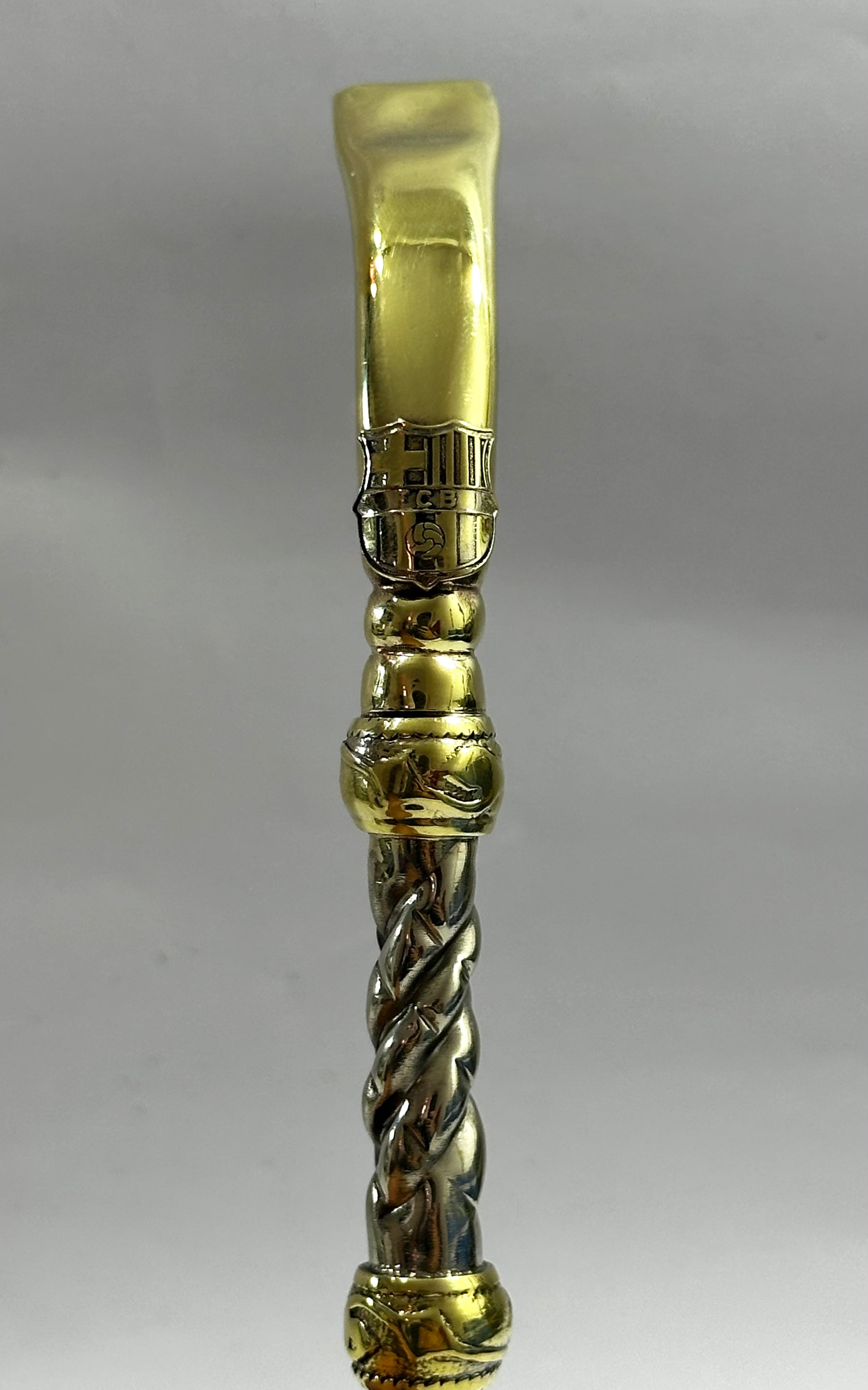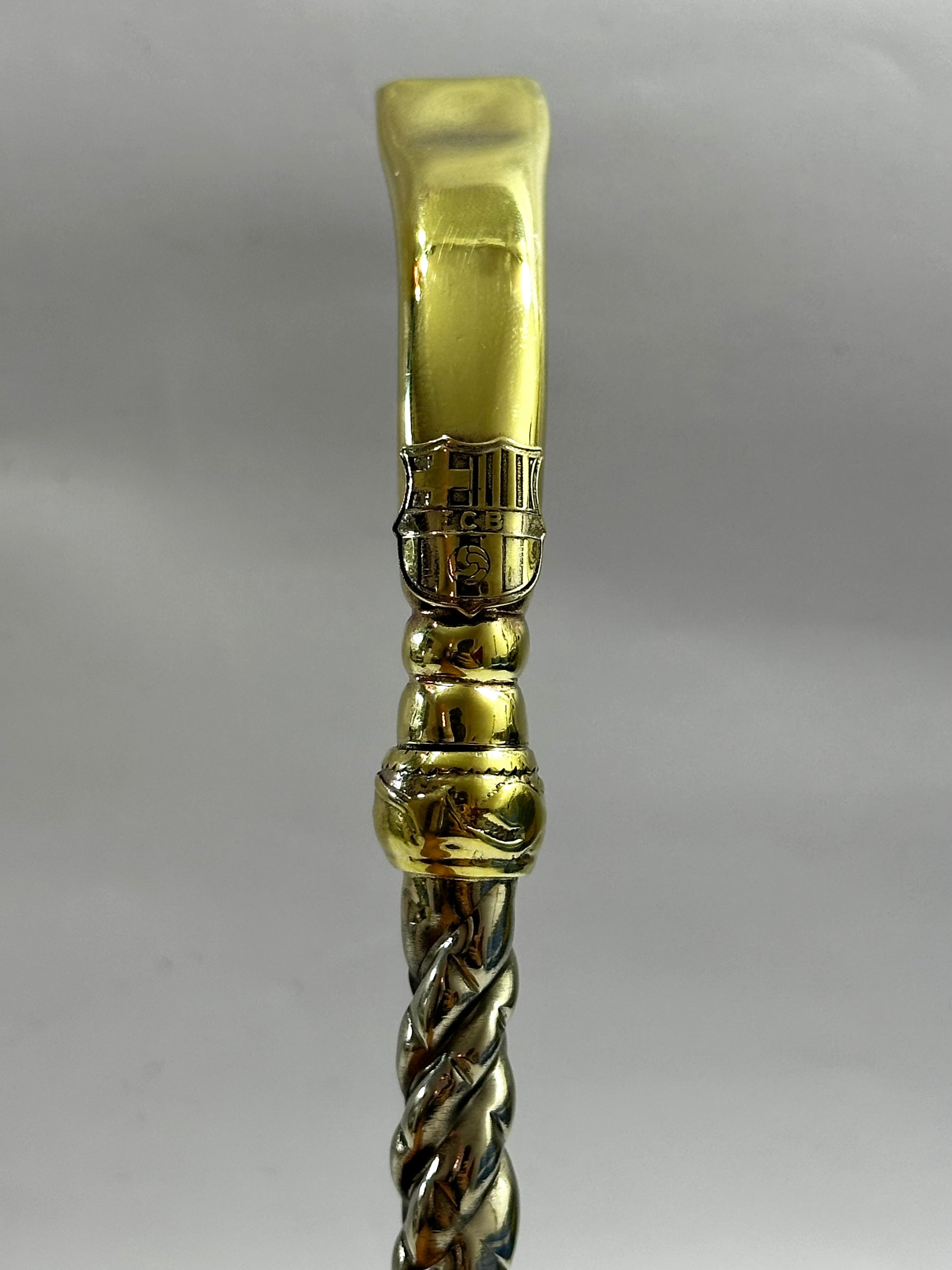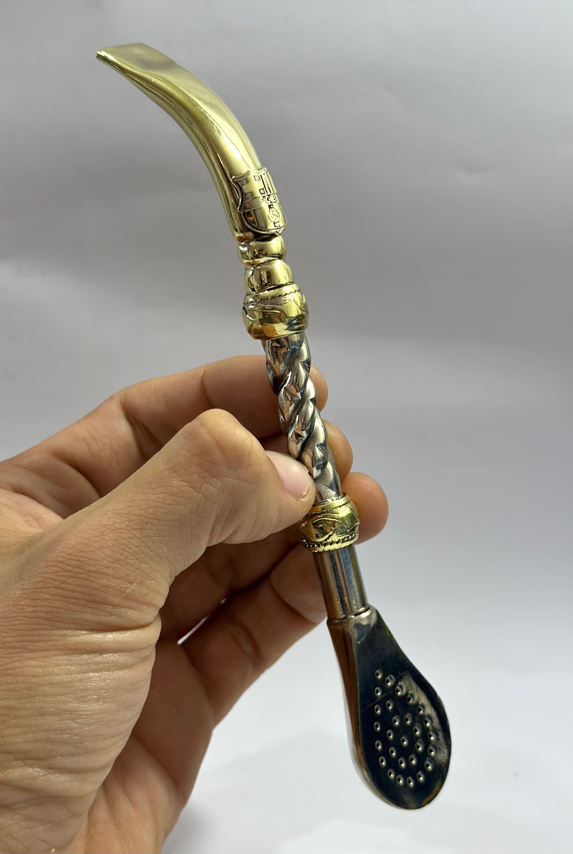 Mate imperial de calabaza con virola de alpaca cincelada, y trabajado en cuero Bi-Color , haciendo referencia a los colores de la institución del Club Barcelona de España , a su vez en el frontis del fleje de alpaca está soldado a su estructura el logo del Club de fútbol, con soldadura de plata en particular para brindar durabilidad y a su vez elegancia a un trabajo tan delicado como este. Este conjunto incluye nuestro bombillon artesanal de alpaca trenzada pico de loro en bronce, también con el logo de la institución.