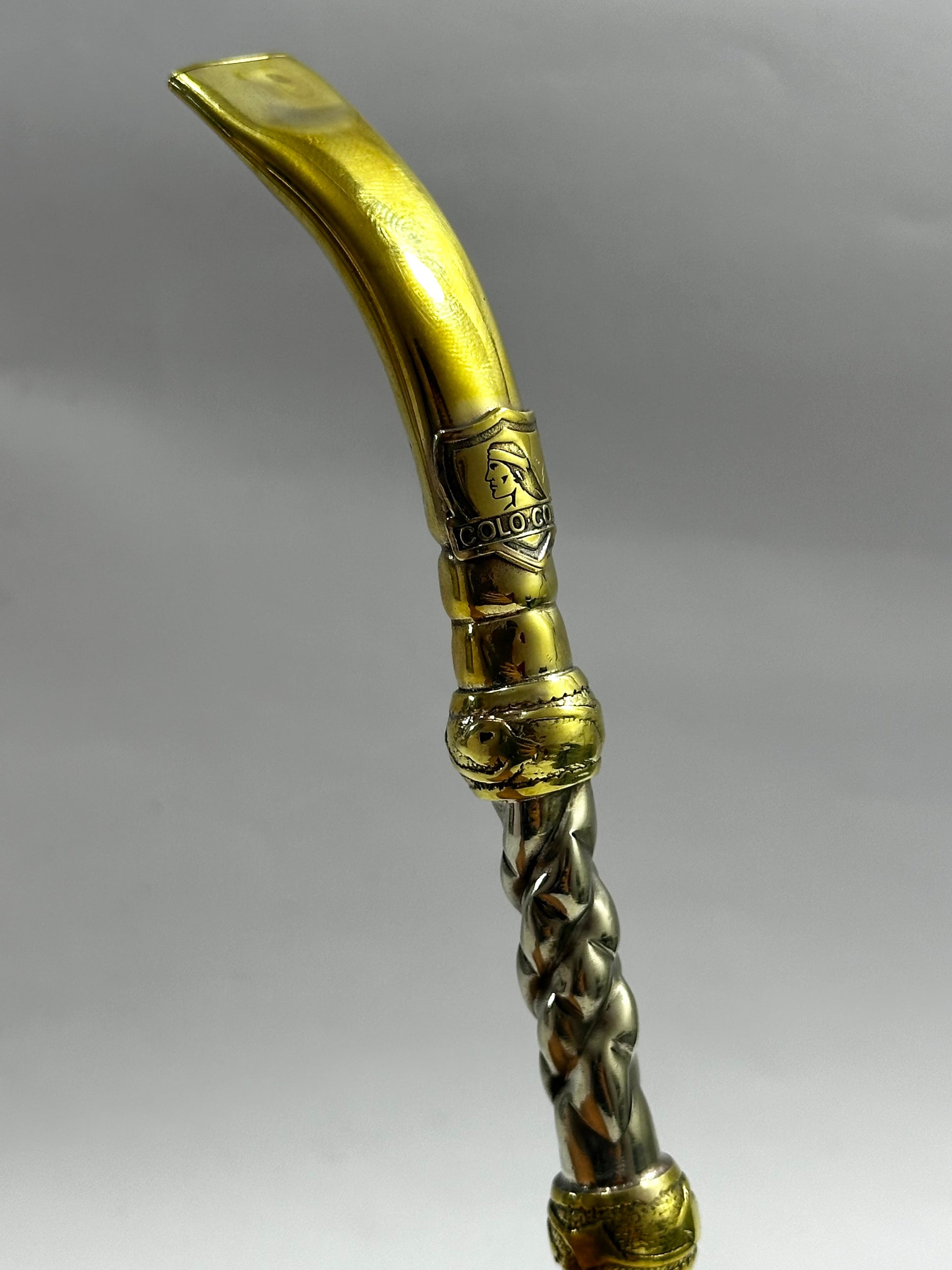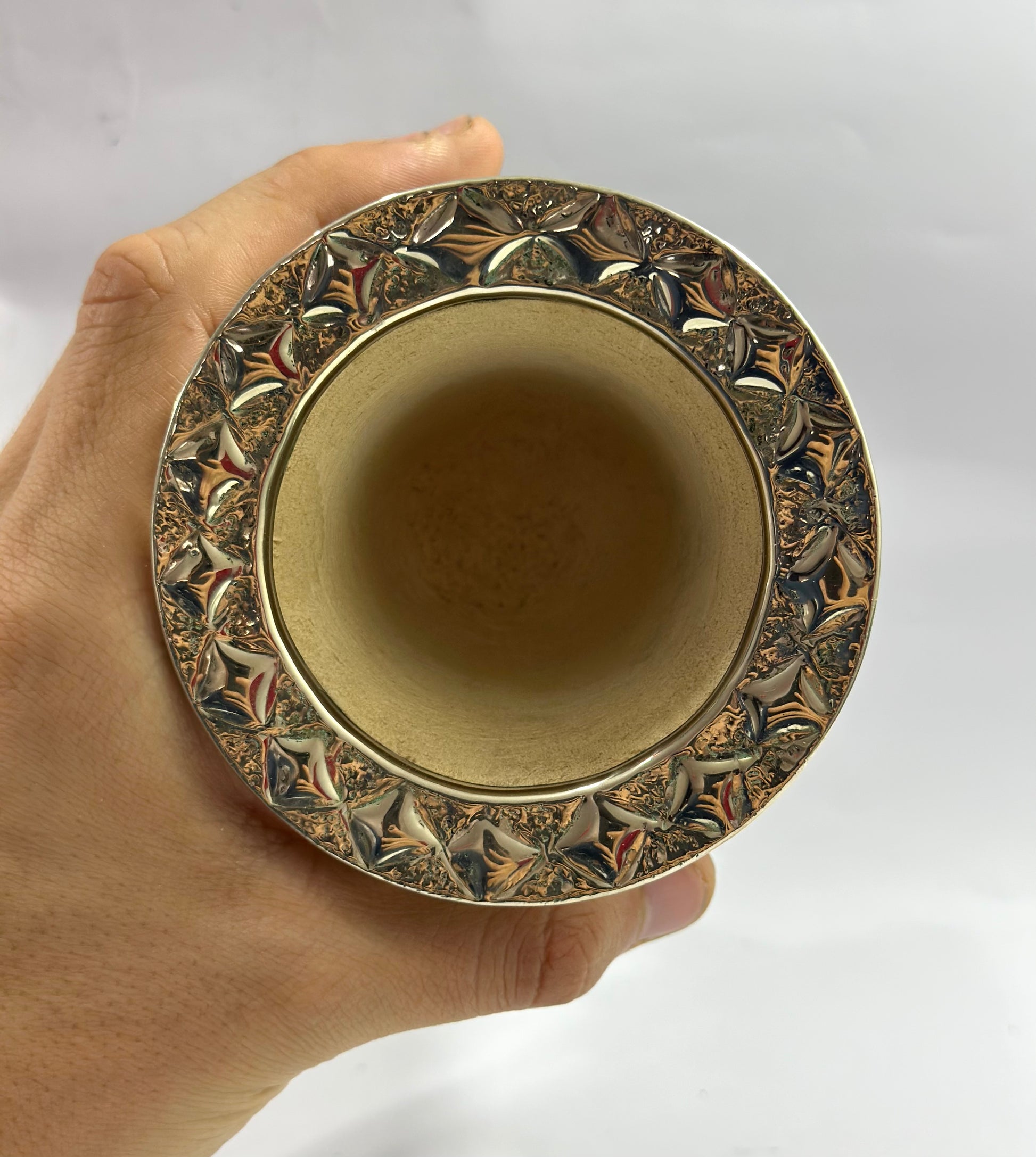 Mate imperial de calabaza con virola de alpaca cincelada, y trabajado en cuero Bi-Color , haciendo referencia a los colores de la institución , a su vez en el frontis del fleje de alpaca está soldado a su estructura el logo del Club de fútbol Colo Colo , con soldadura de plata en particular para brindar durabilidad y a su vez elegancia a un trabajo tan delicado como este. Este conjunto incluye nuestro bombillon artesanal de alpaca trenzada pico de loro en bronce, también con el logo de la institución.