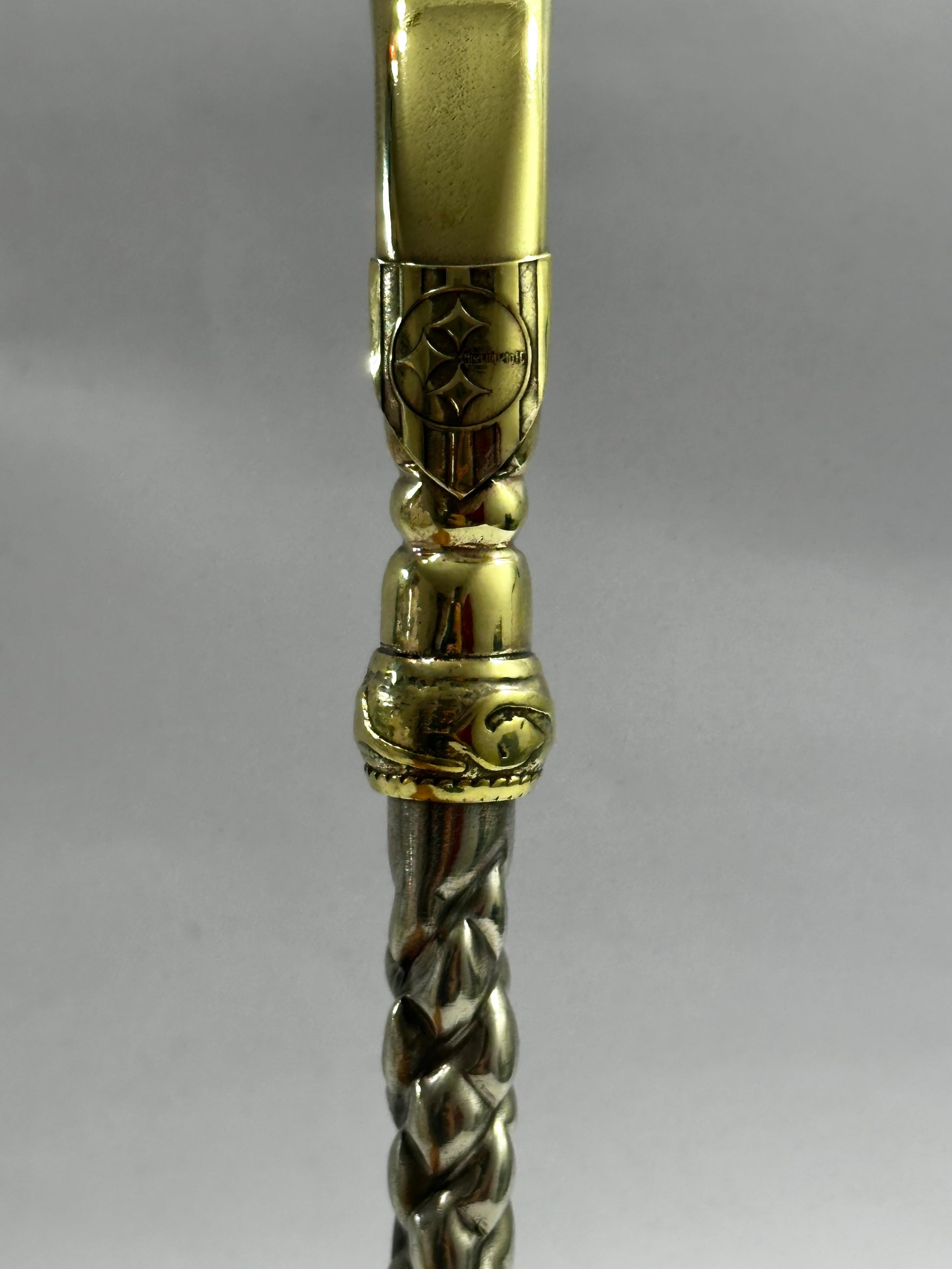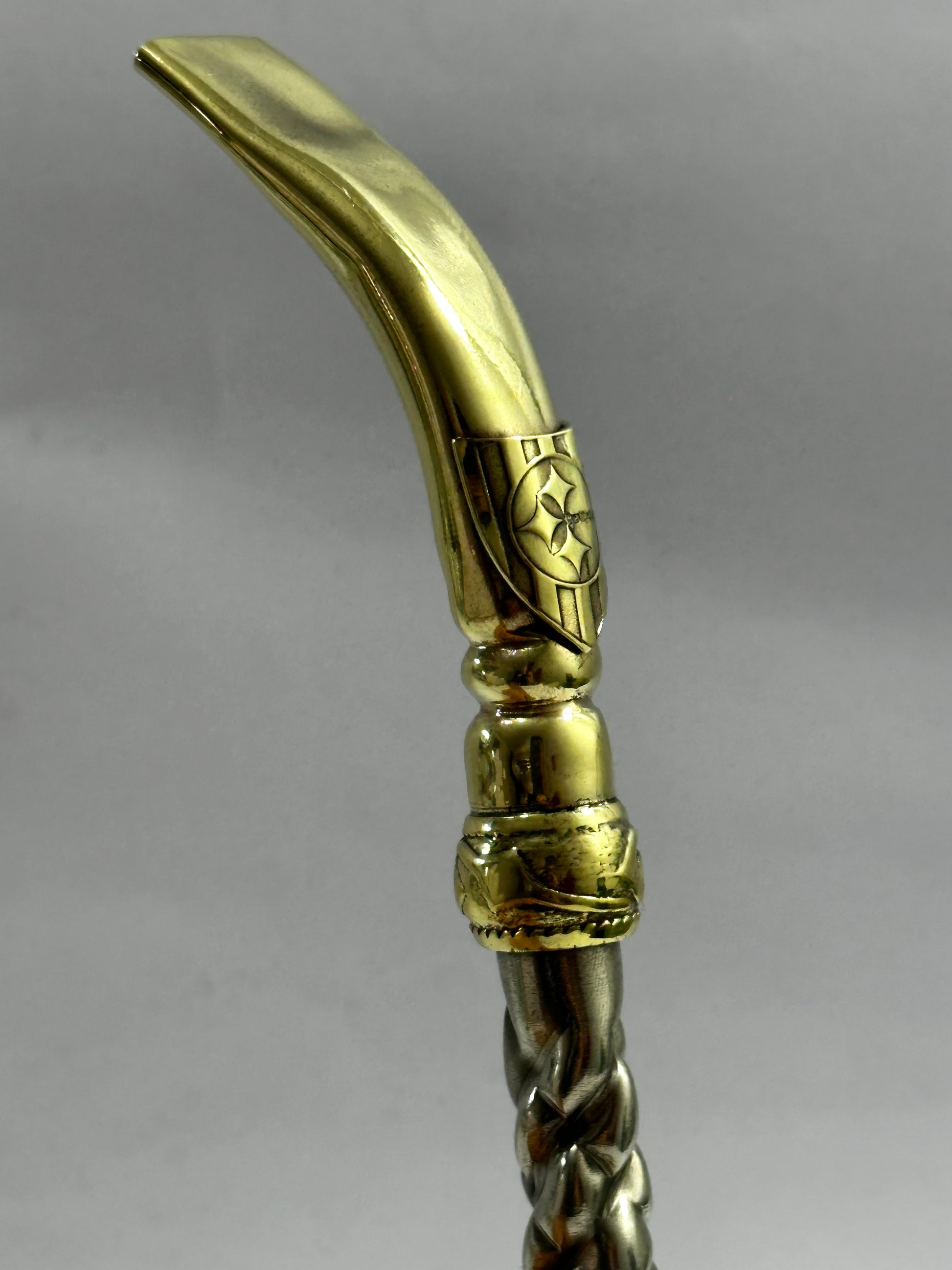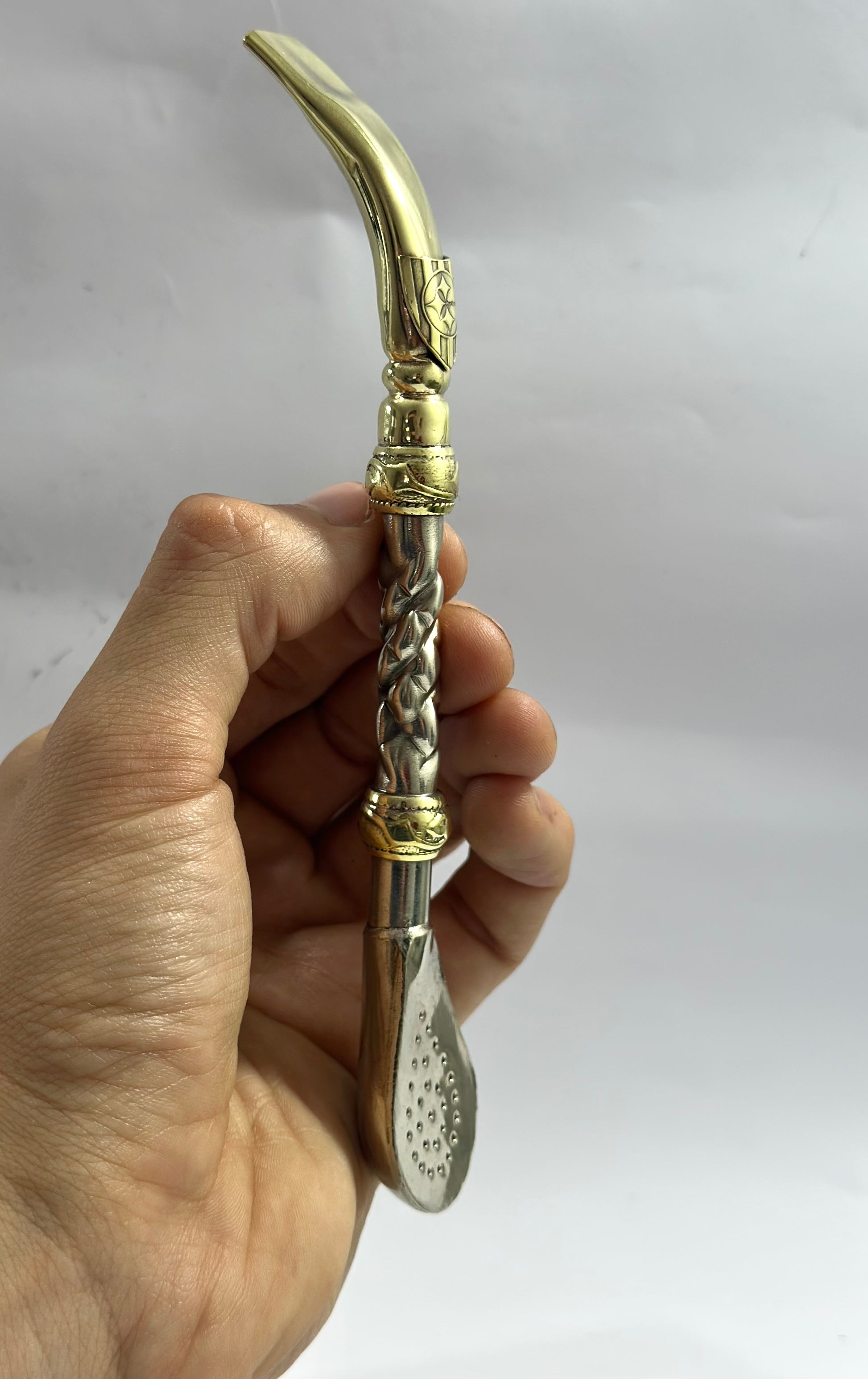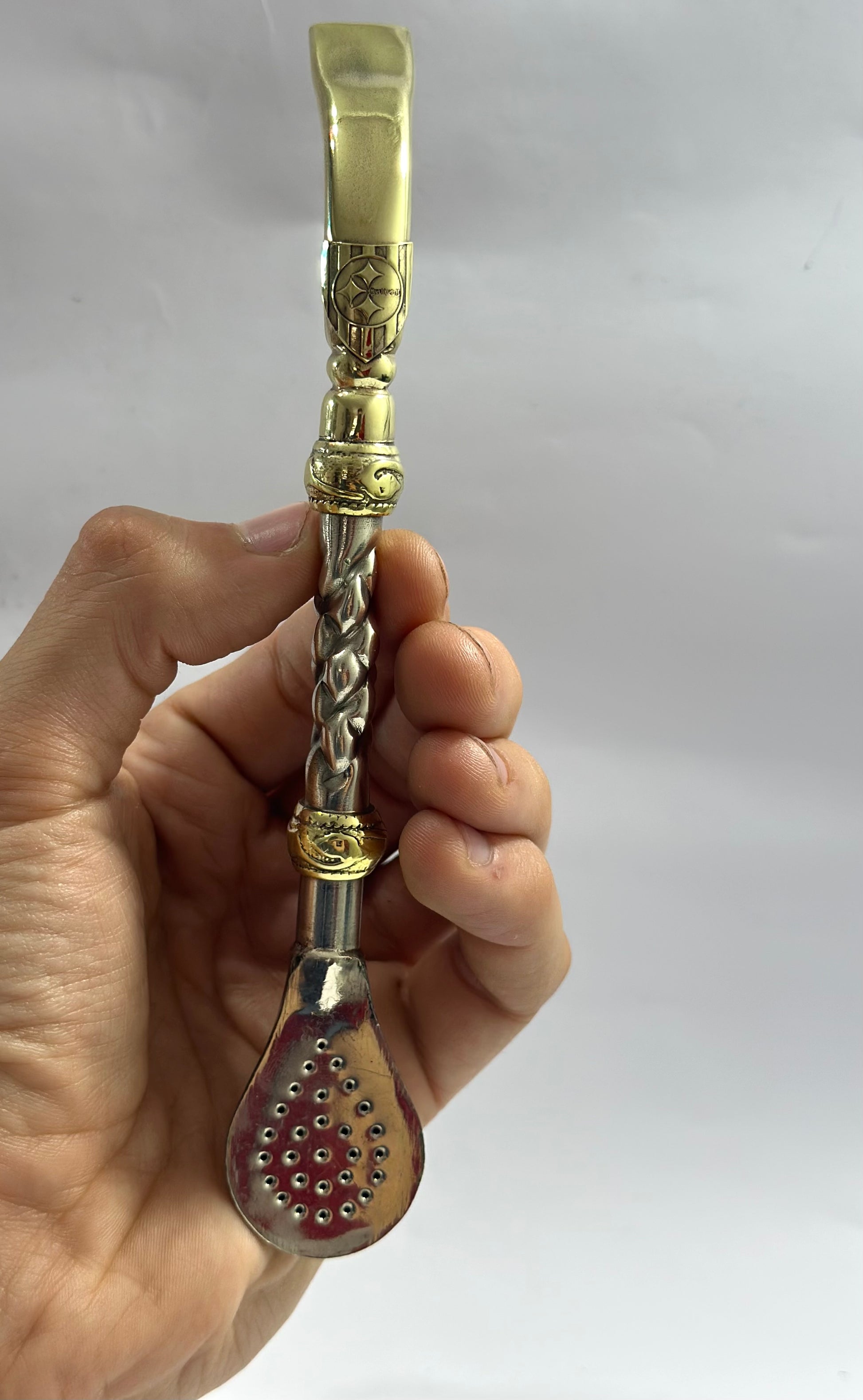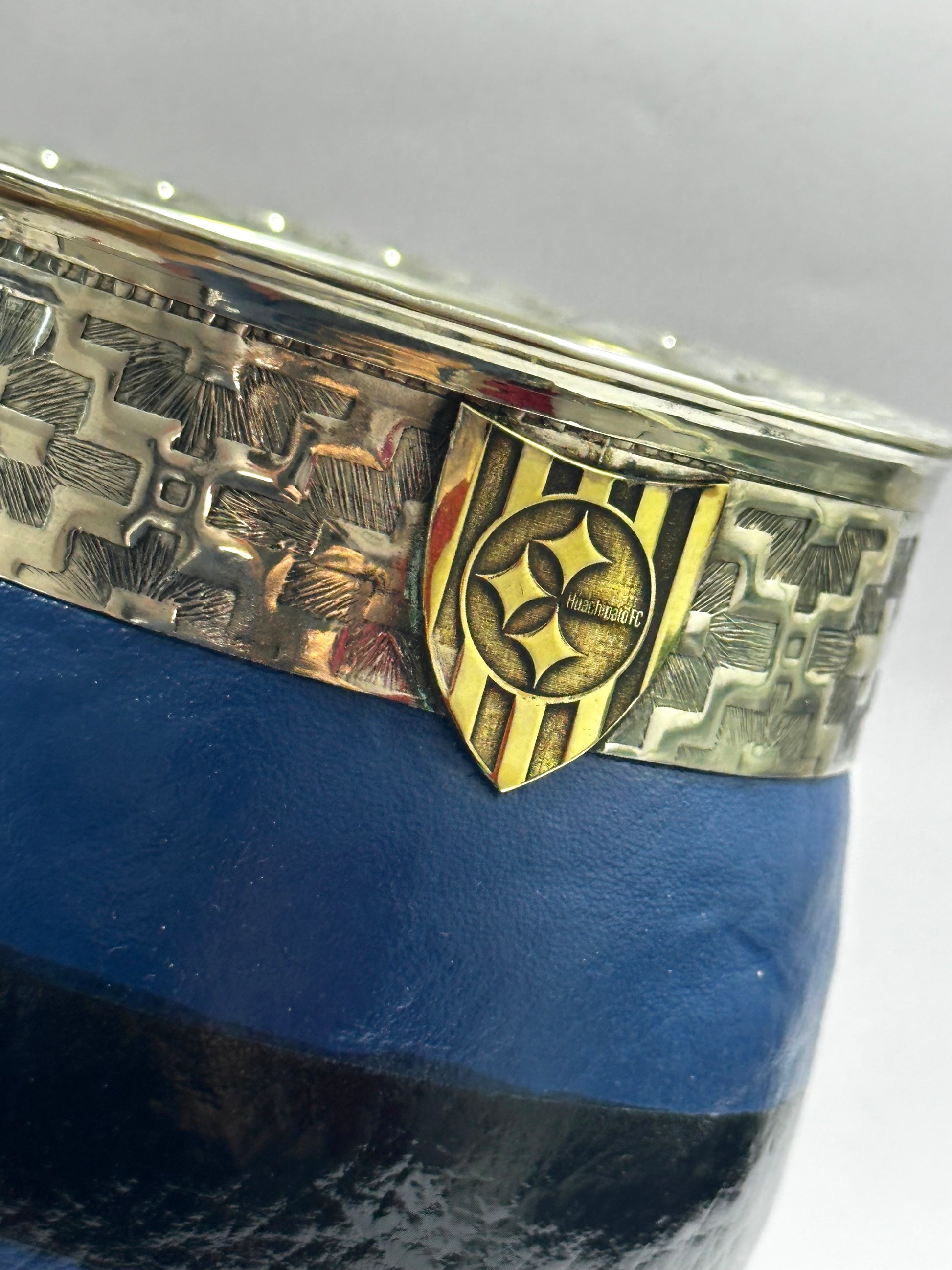 Mate imperial de calabaza con virola de alpaca cincelada, y trabajado en cuero Bi-Color , haciendo referencia a los colores de la institución del Club Huachipato , a su vez en el frontis del fleje de alpaca está soldado a su estructura el logo del Club de fútbol, con soldadura de plata en particular para brindar durabilidad y a su vez elegancia a un trabajo tan delicado como este. Este conjunto incluye nuestro bombillon artesanal de alpaca trenzada pico de loro en bronce, también con el logo de la institución.