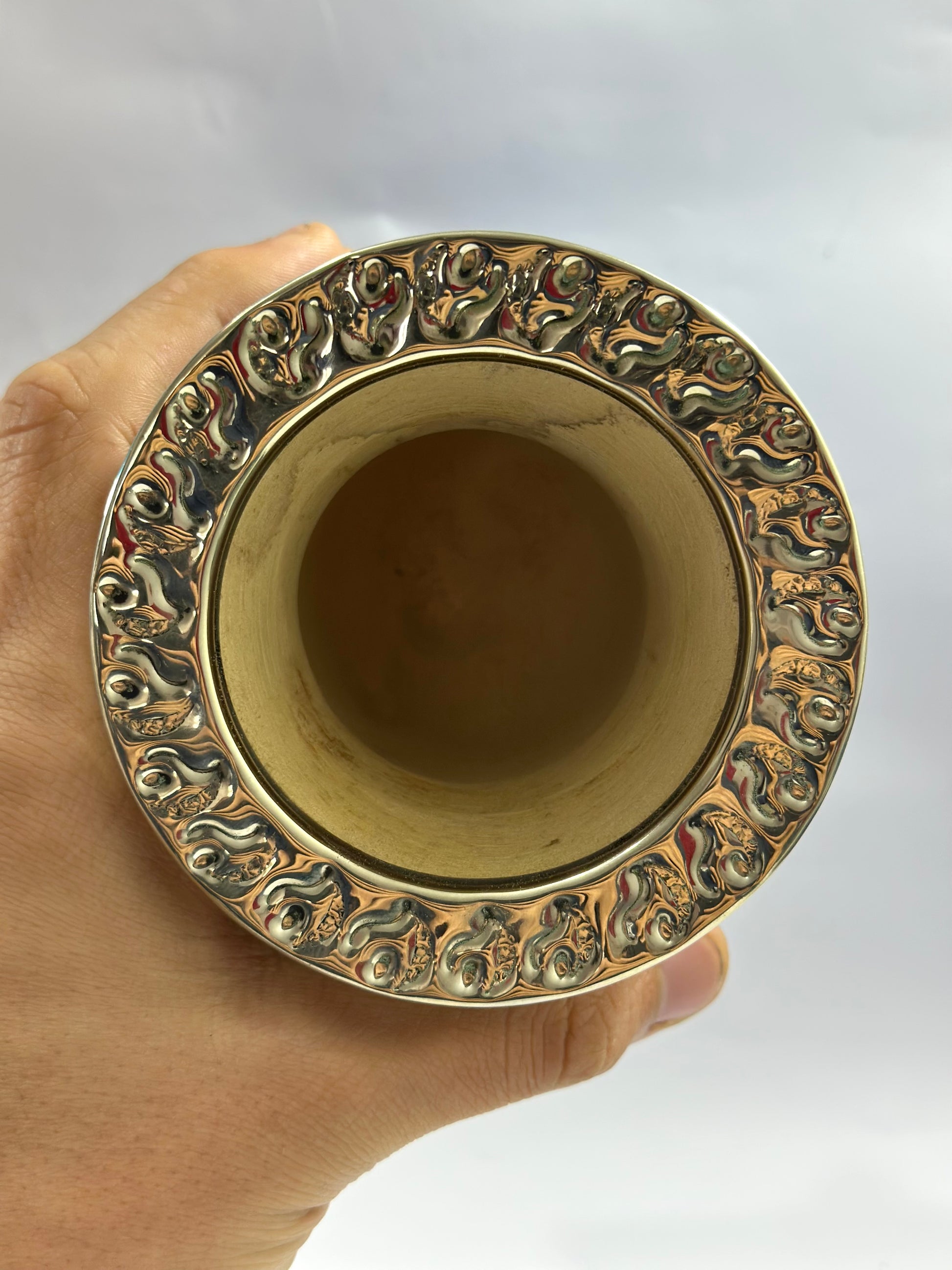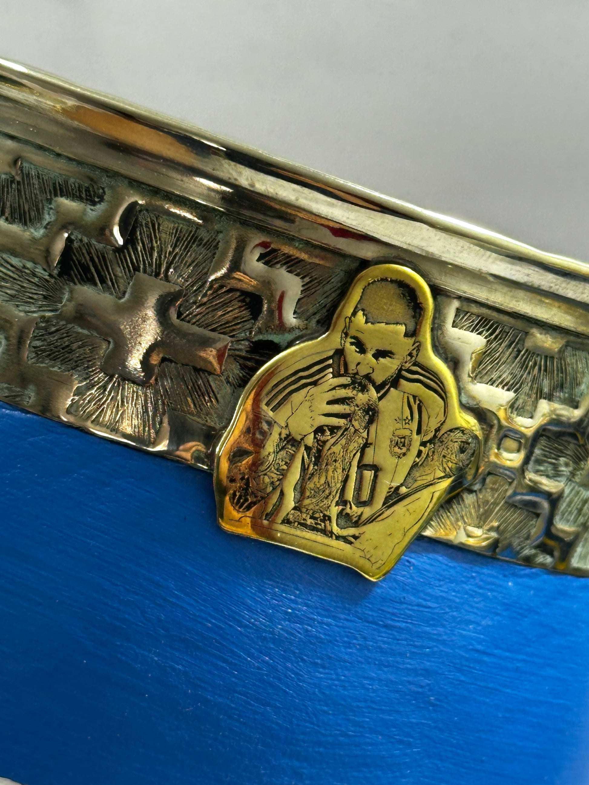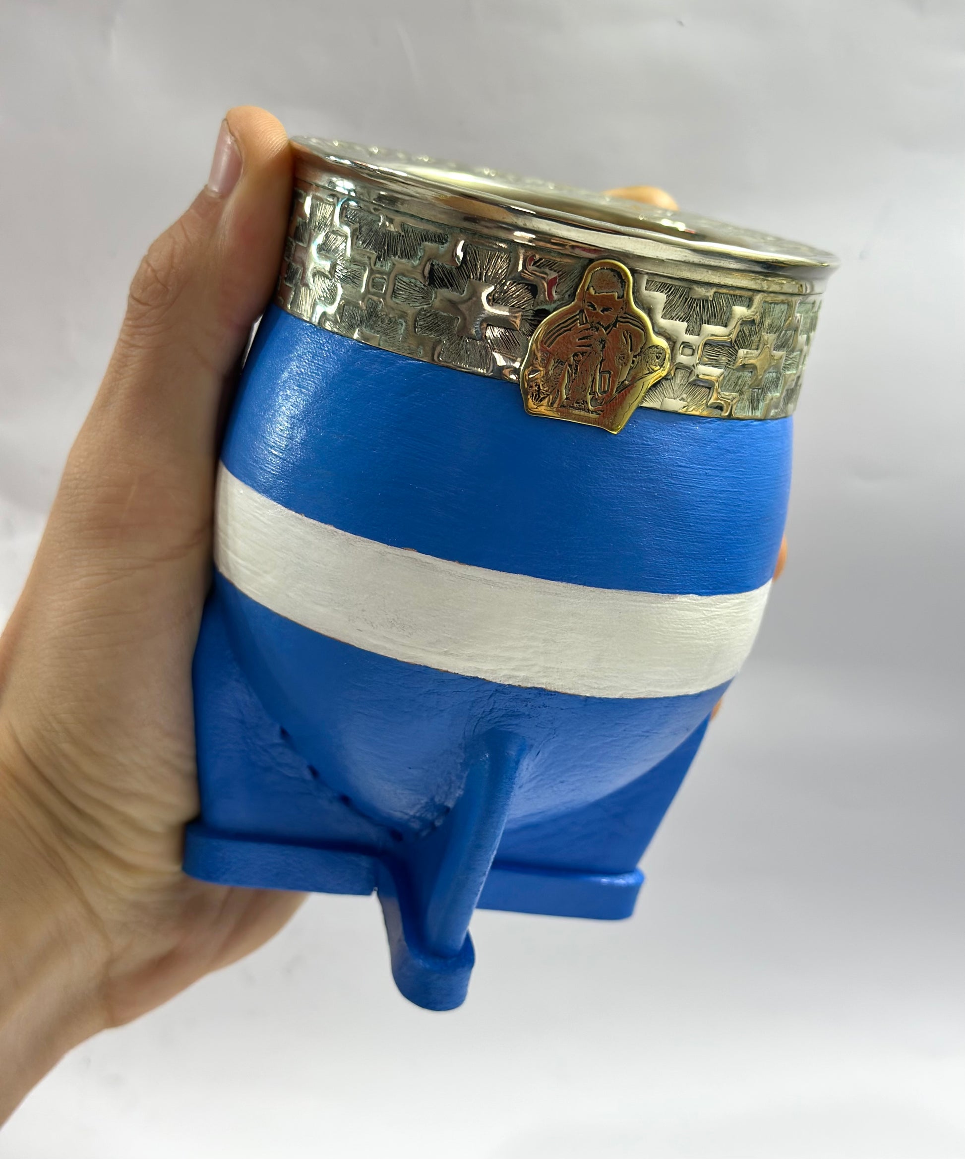 Mate imperial de calabaza con virola de alpaca cincelada, y trabajado en cuero Bi-Color , haciendo referencia a los colores de la bandera argentina , a su vez en el frontis del fleje de alpaca está soldado a su estructura el logo de Messi besando la tan anhelada copa del mundo la cual luchó por años. Está con soldadura de plata en particular para brindar durabilidad y a su vez elegancia a un trabajo tan delicado como este. Este conjunto incluye nuestro bombillon artesanal de alpaca trenzada pico de loro en bronce, también con el logo de Messi en la ceremonia de premiación .