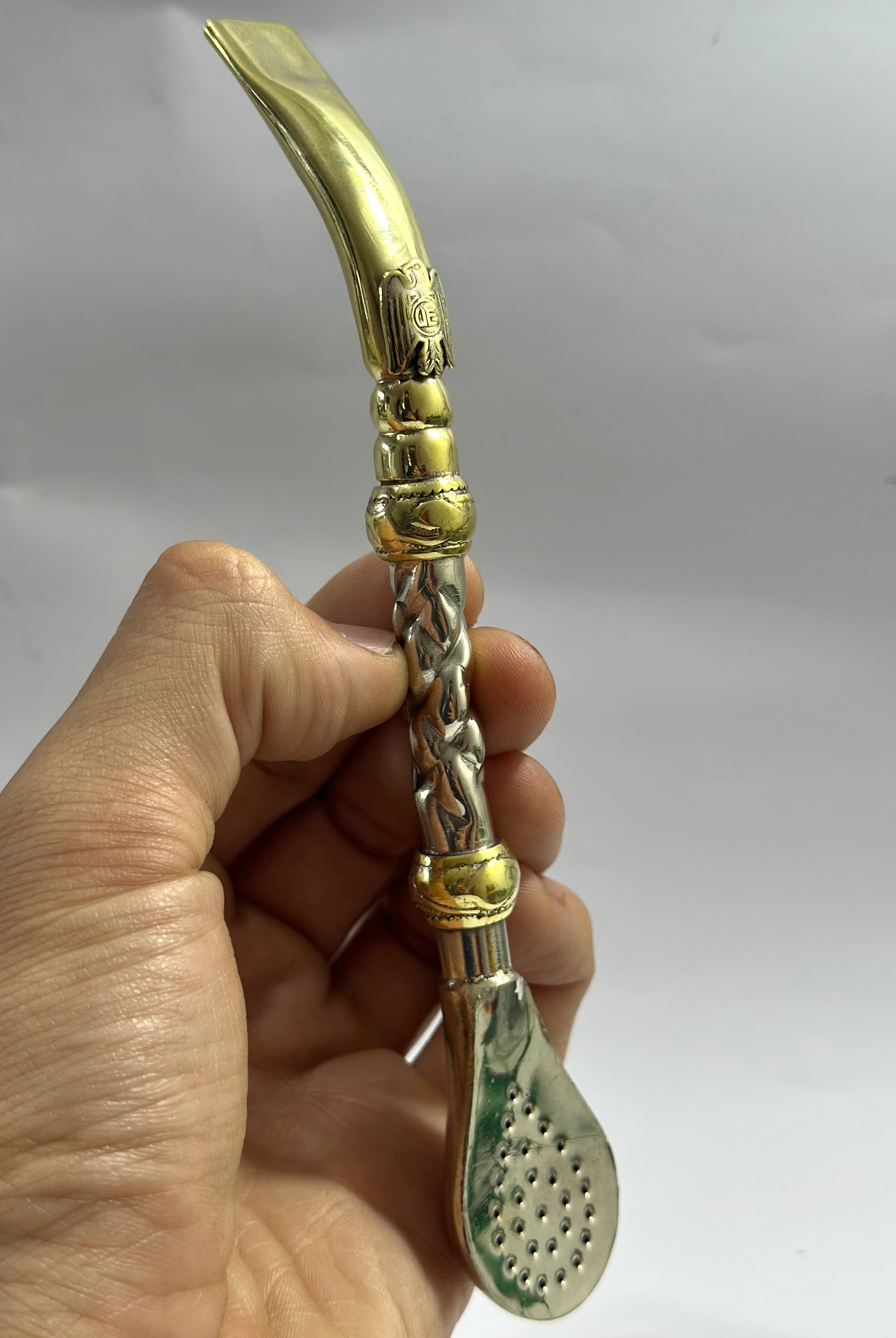 Mate imperial de calabaza con virola de alpaca cincelada, y trabajado en cuero Bi-Color , haciendo referencia a los colores de la institución del Club Unión Española , a su vez en el frontis del fleje de alpaca está soldado a su estructura el logo del Club de fútbol, con soldadura de plata en particular para brindar durabilidad y a su vez elegancia a un trabajo tan delicado como este. Este conjunto incluye nuestro bombillon artesanal de alpaca trenzada pico de loro en bronce, también con el logo de la institución.