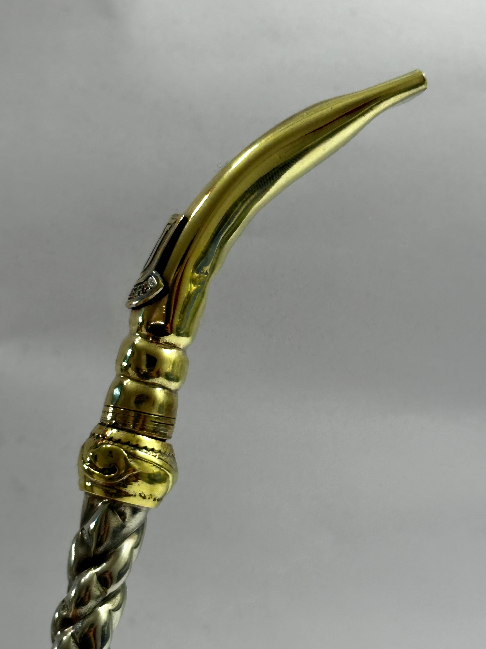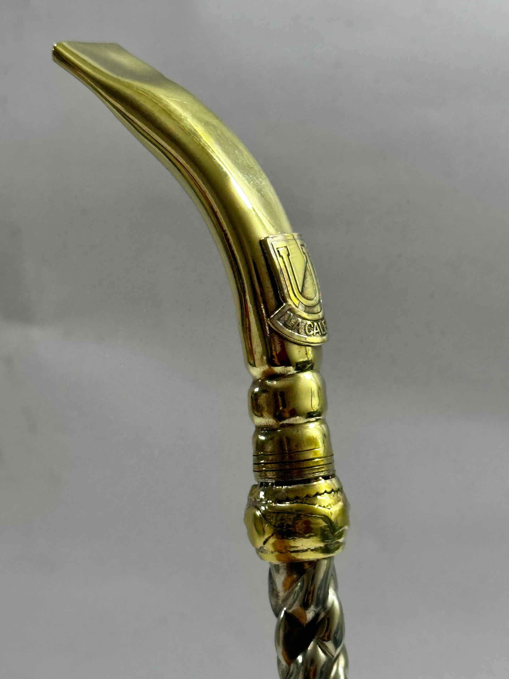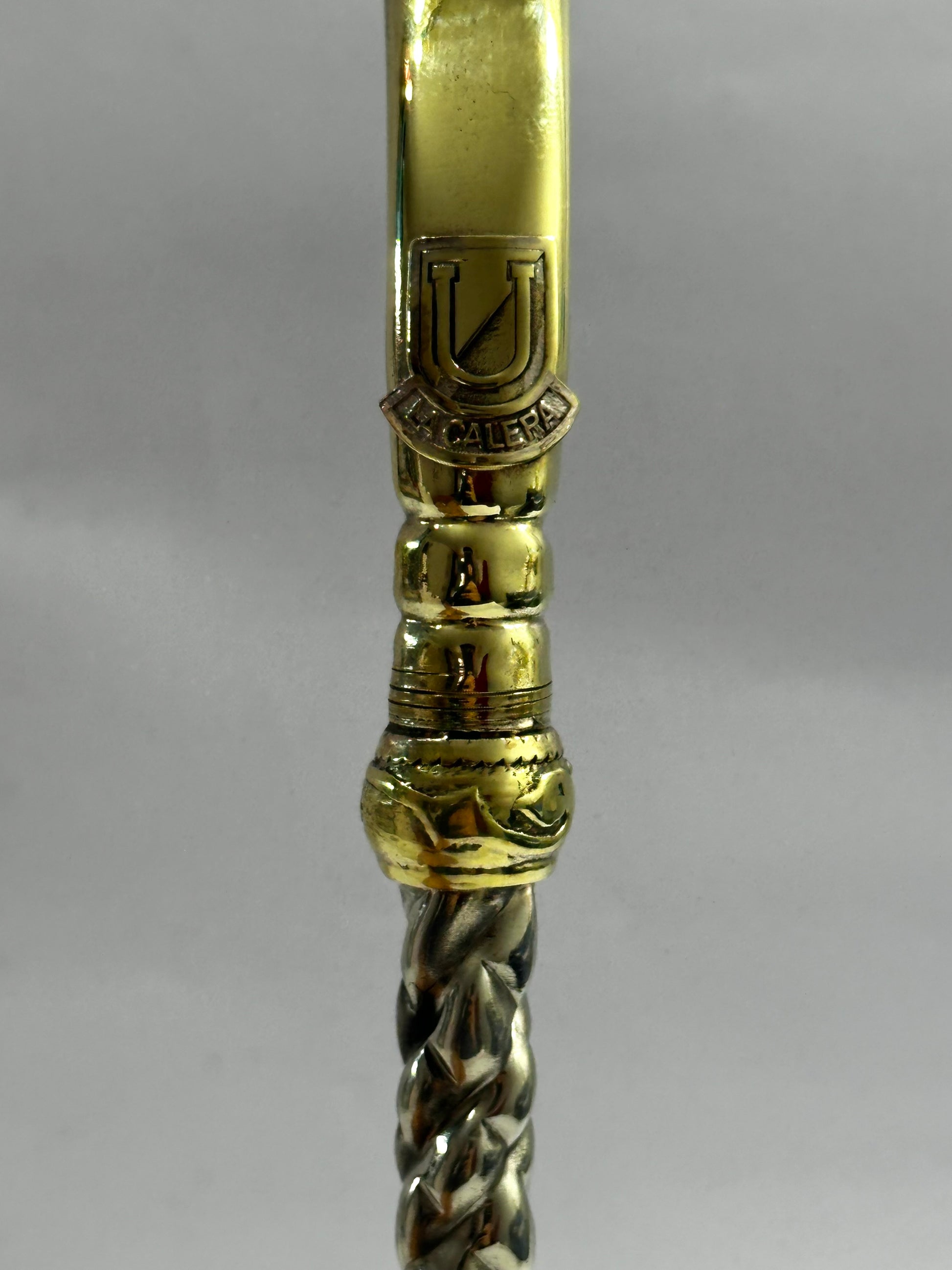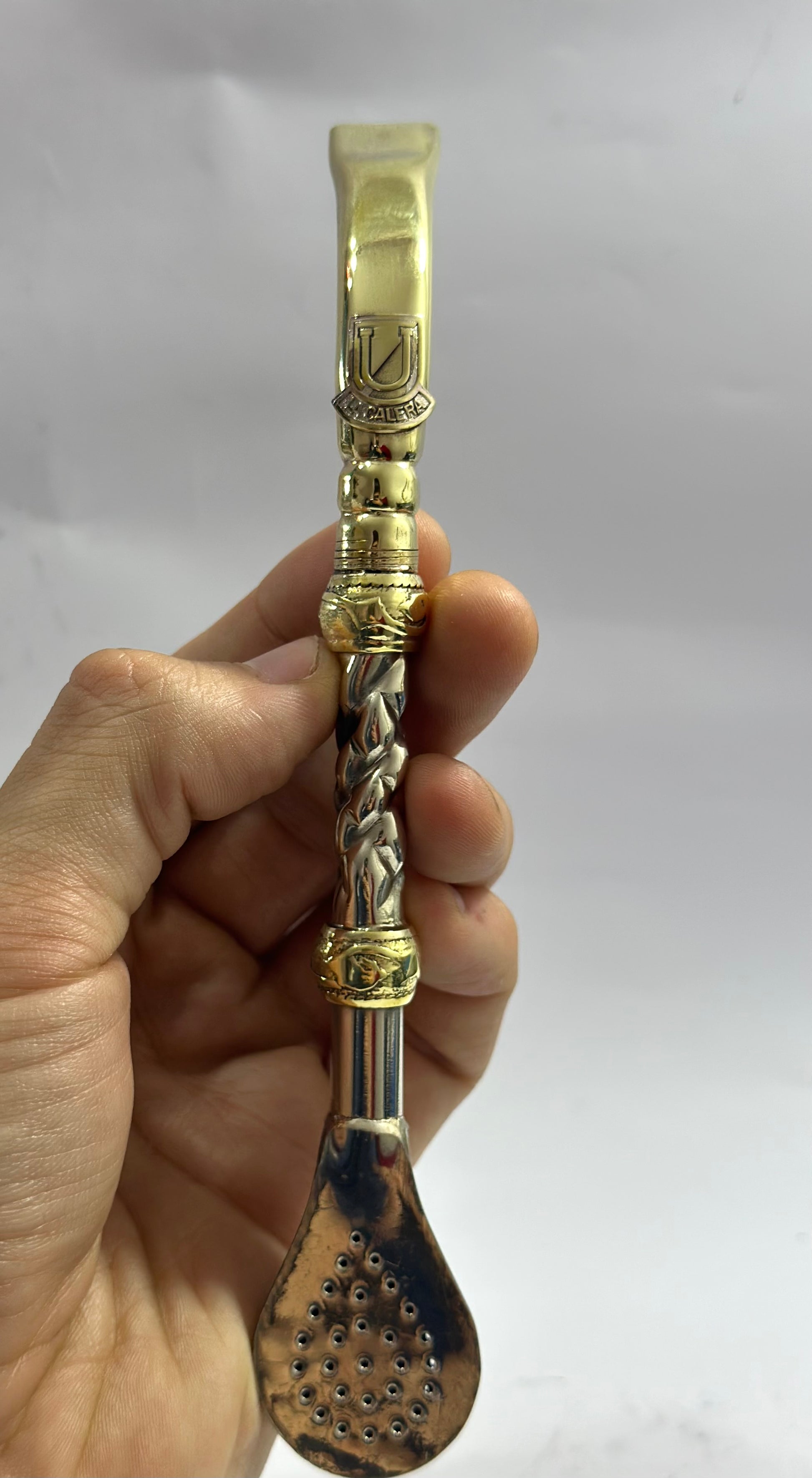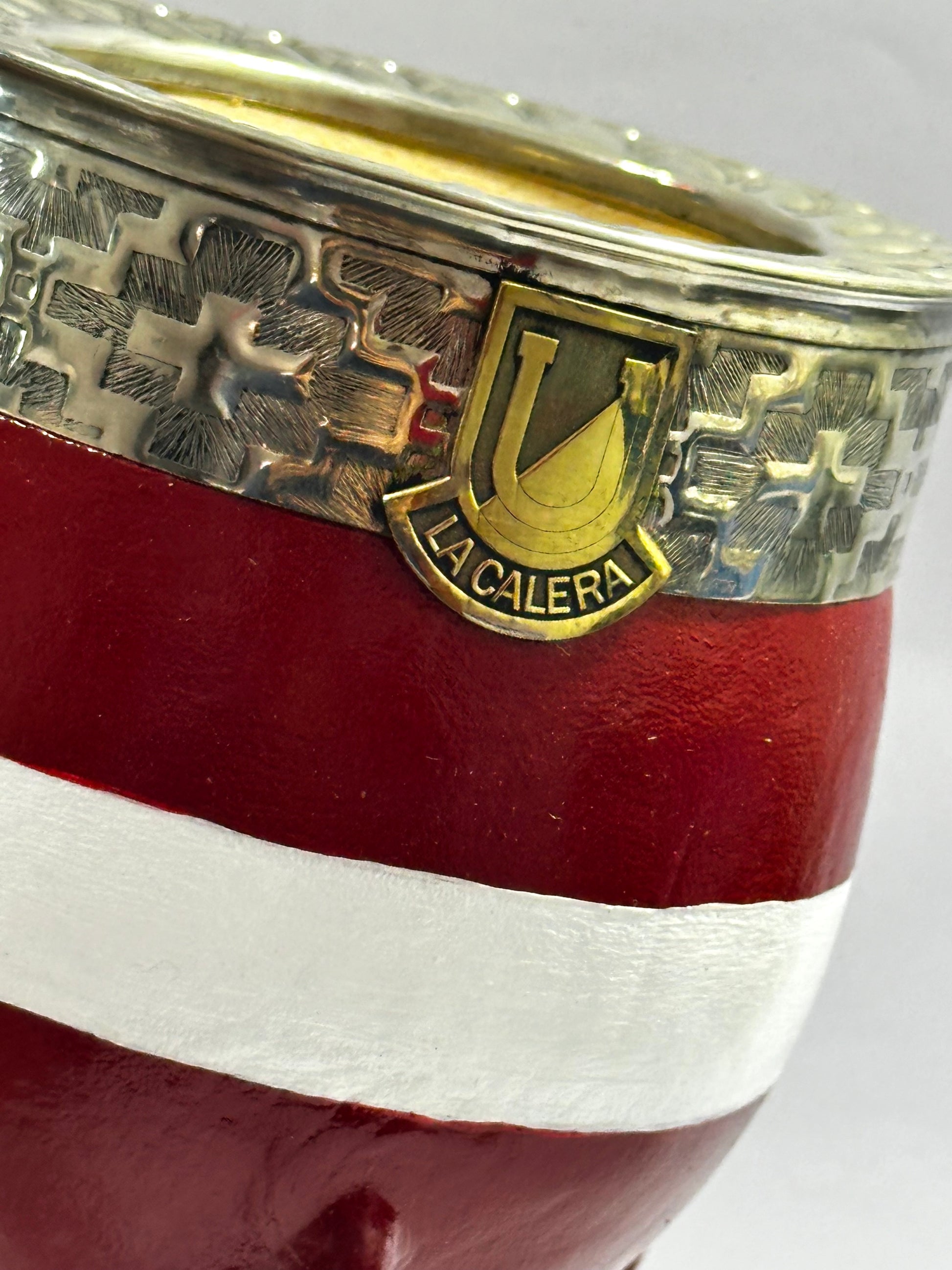 Mate imperial de calabaza con virola de alpaca cincelada, y trabajado en cuero Bi-Color , haciendo referencia a los colores de la institución del Club Unión La Calera , a su vez en el frontis del fleje de alpaca está soldado a su estructura el logo del Club de fútbol, con soldadura de plata en particular para brindar durabilidad y a su vez elegancia a un trabajo tan delicado como este. Este conjunto incluye nuestro bombillon artesanal de alpaca trenzada pico de loro en bronce, también con el logo de la institución.