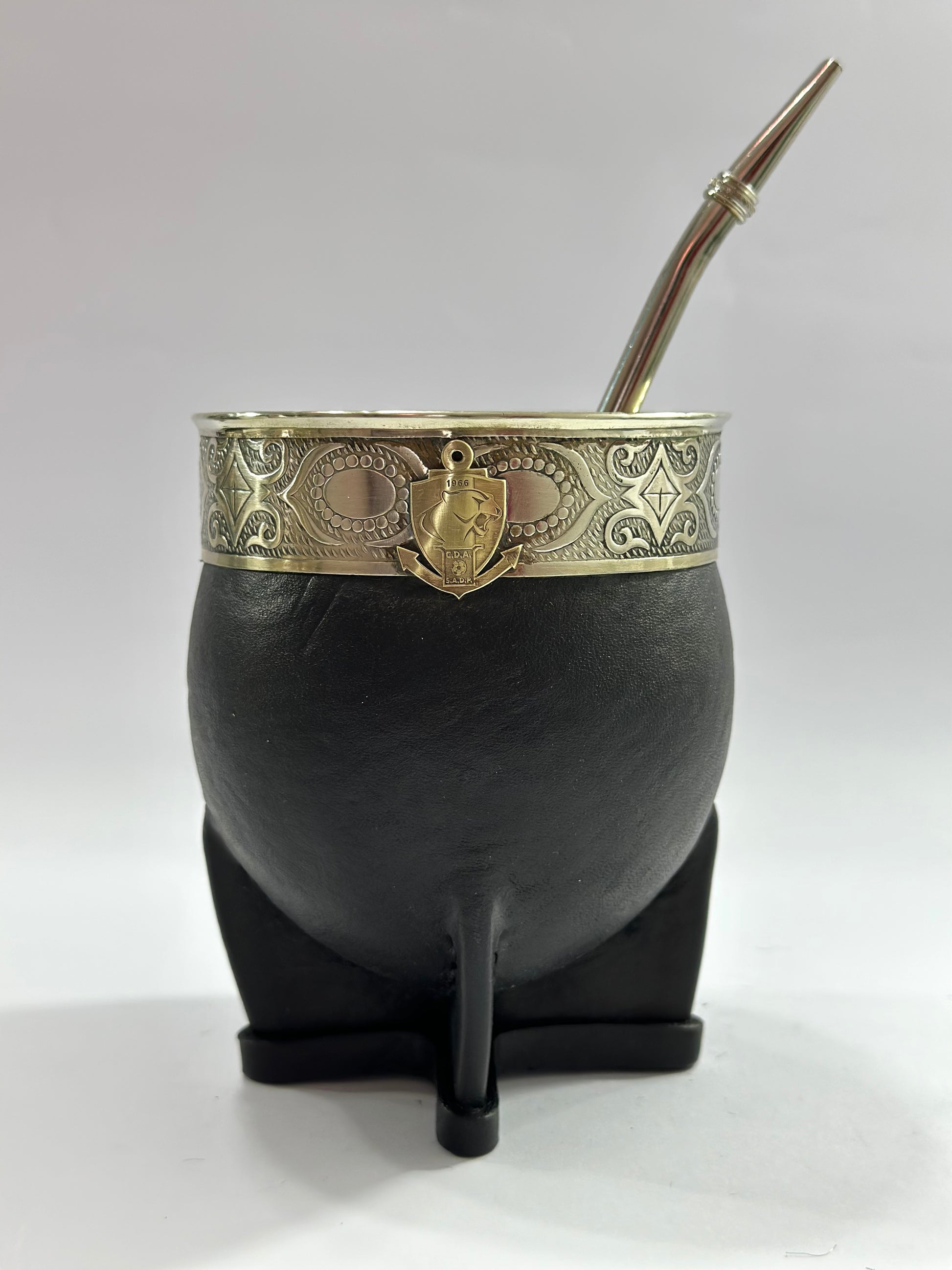 Mate imperial de calabaza con virola de alpaca cincelada trabajado en cuero negro, la particularidad de este diseño es el escudo del club Deportes Antofagasta soldado a su estructura en bronce además viene como bombilla de Acero Inoxidable tradicional.
