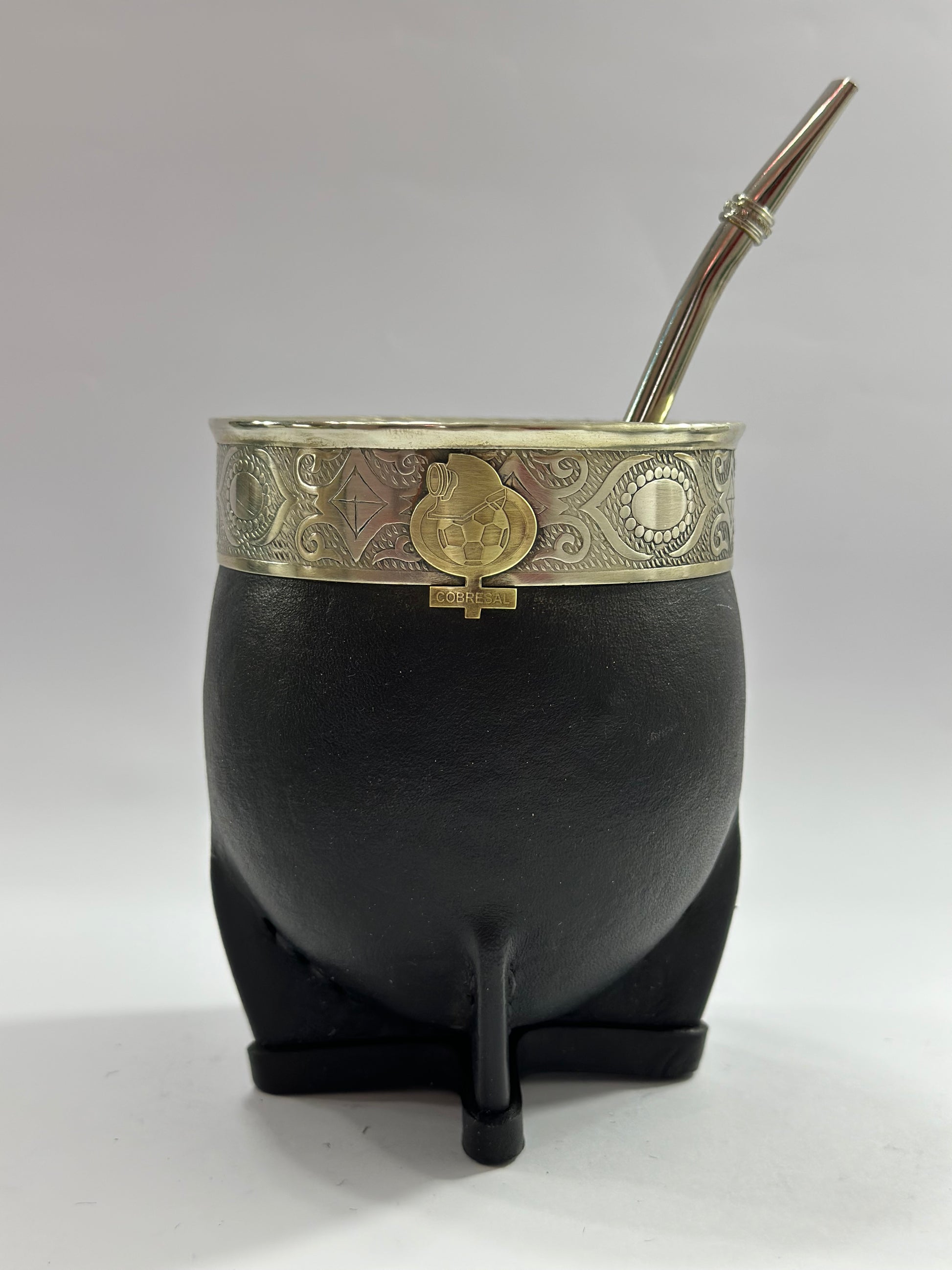 Mate imperial de calabaza con virola de alpaca cincelada trabajado en cuero negro, la particularidad de este diseño es el escudo del Cobresal soldado a su estructura en bronce además viene como bombilla de Acero Inoxidable tradicional.