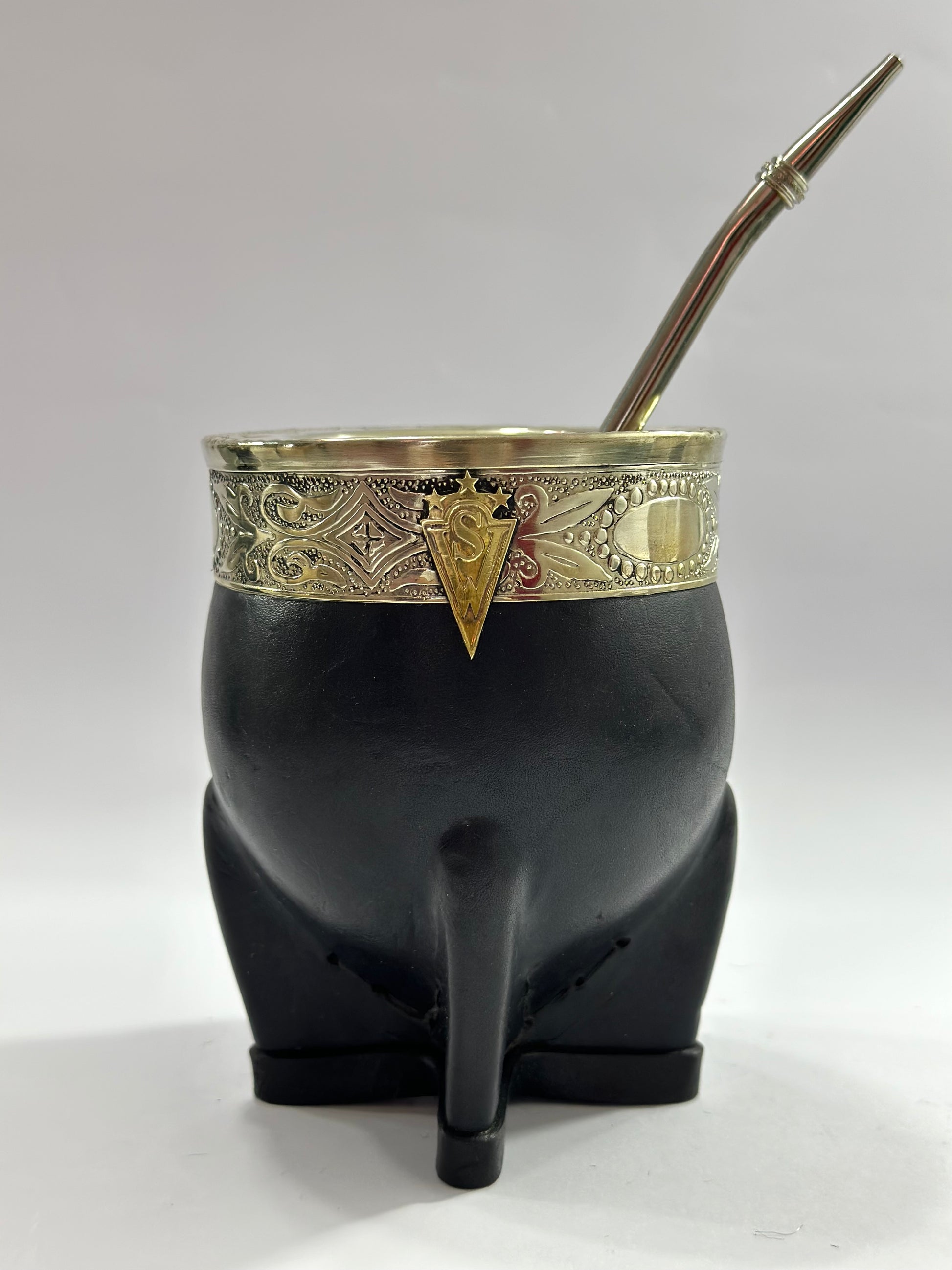 Mate imperial de calabaza con virola de alpaca cincelada trabajado en cuero negro, la particularidad de este diseño es el escudo del club Santiago Wanderers soldado a su estructura en bronce además viene como bombilla de Acero Inoxidable tradicional.