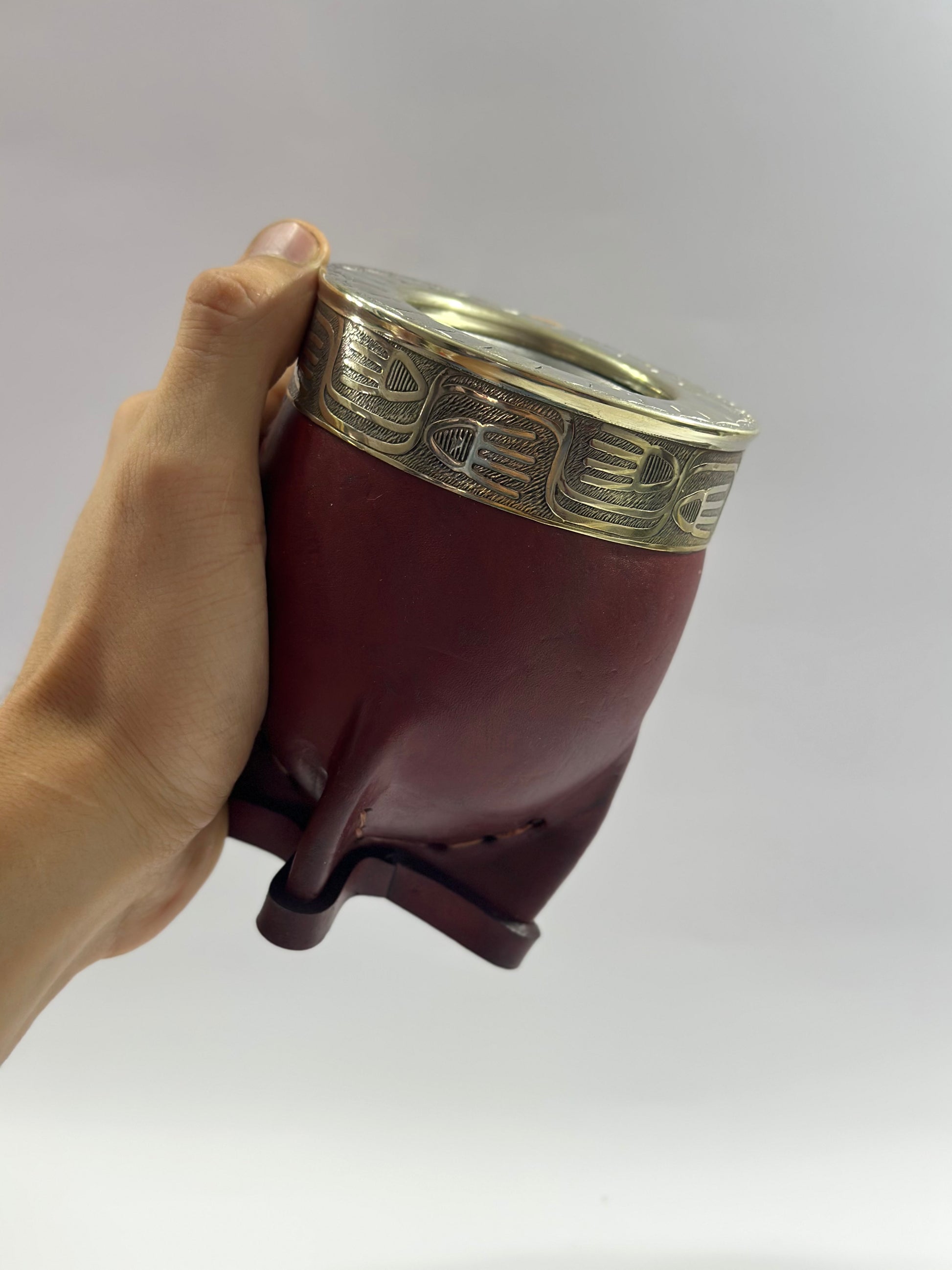 Mate imperial interior de acero con virola de alpaca Cincelada , cuenta con su exterior forrado en cuero , ideal para quienes gustan disfrutar de unos buenos mates sin la preocupación de tener que curar y cuidar en el caso de que fuera interior calabaza. Fácil lavado y práctico.