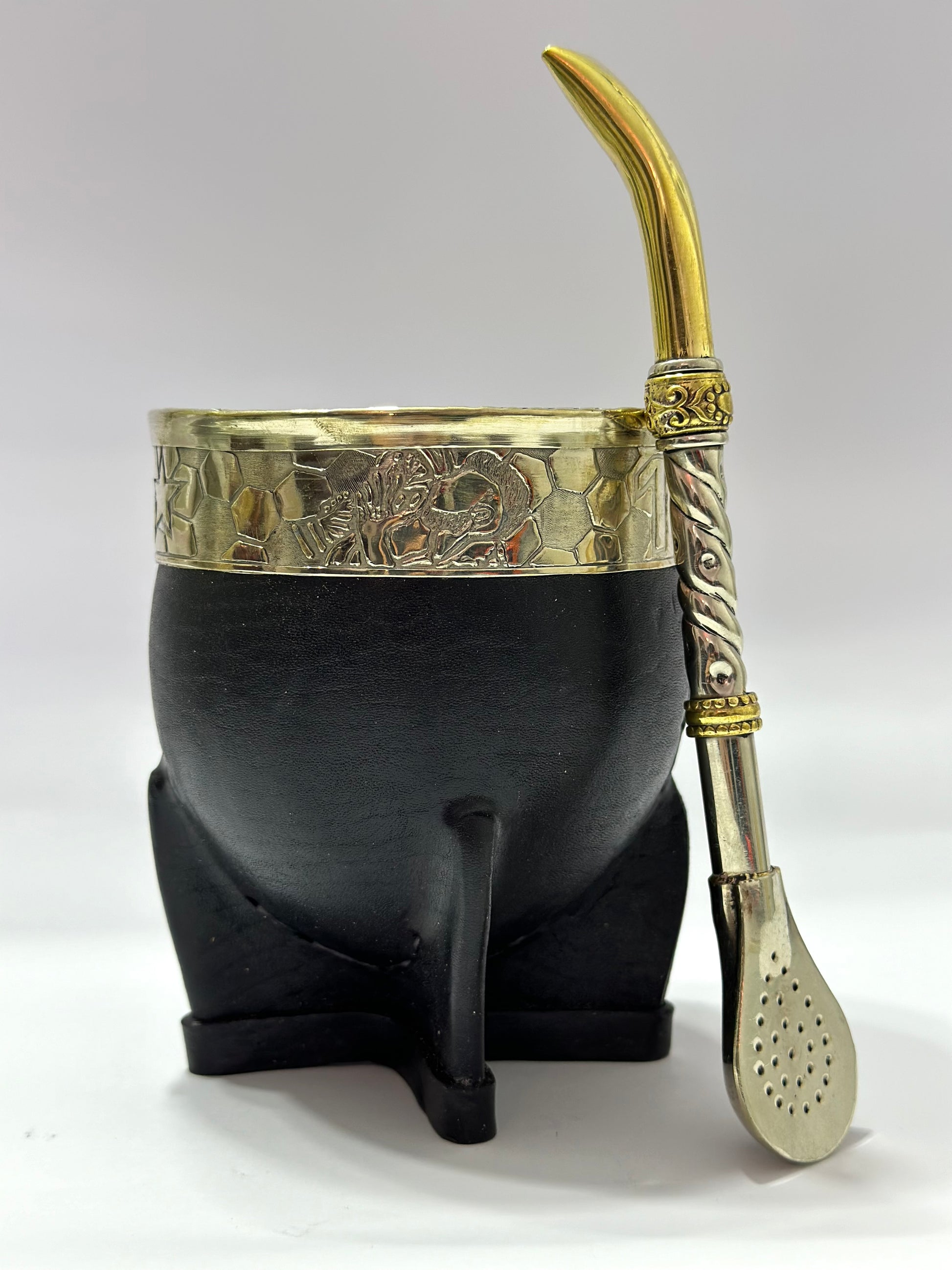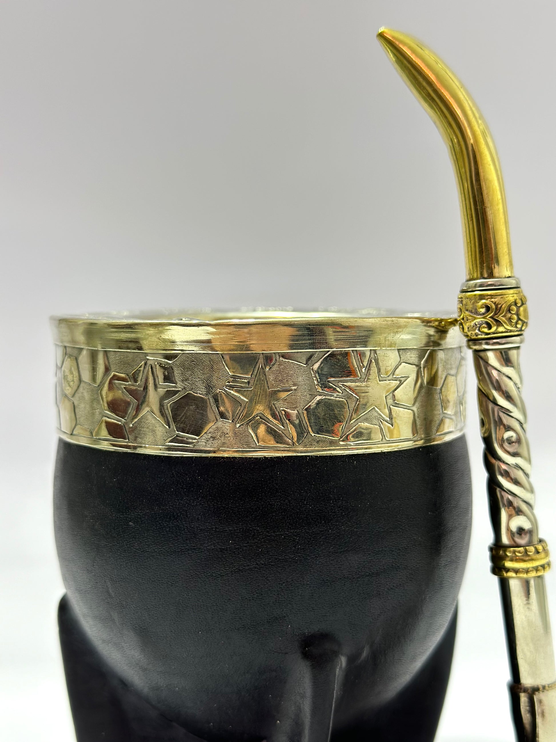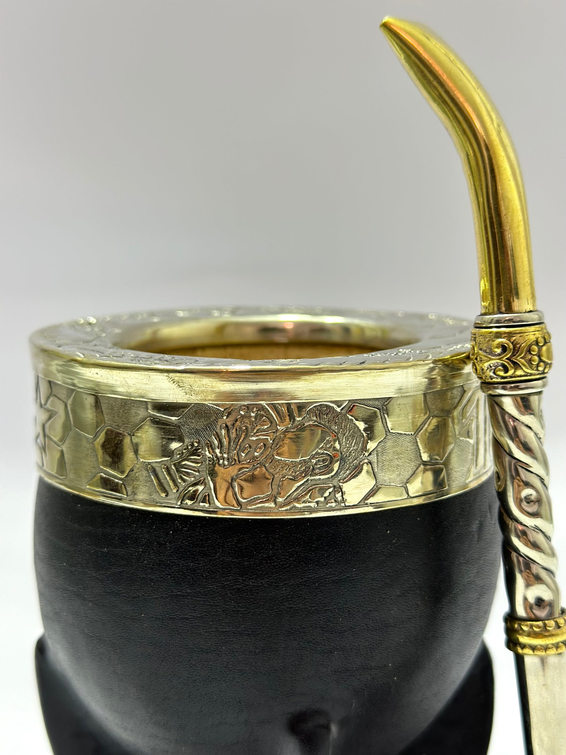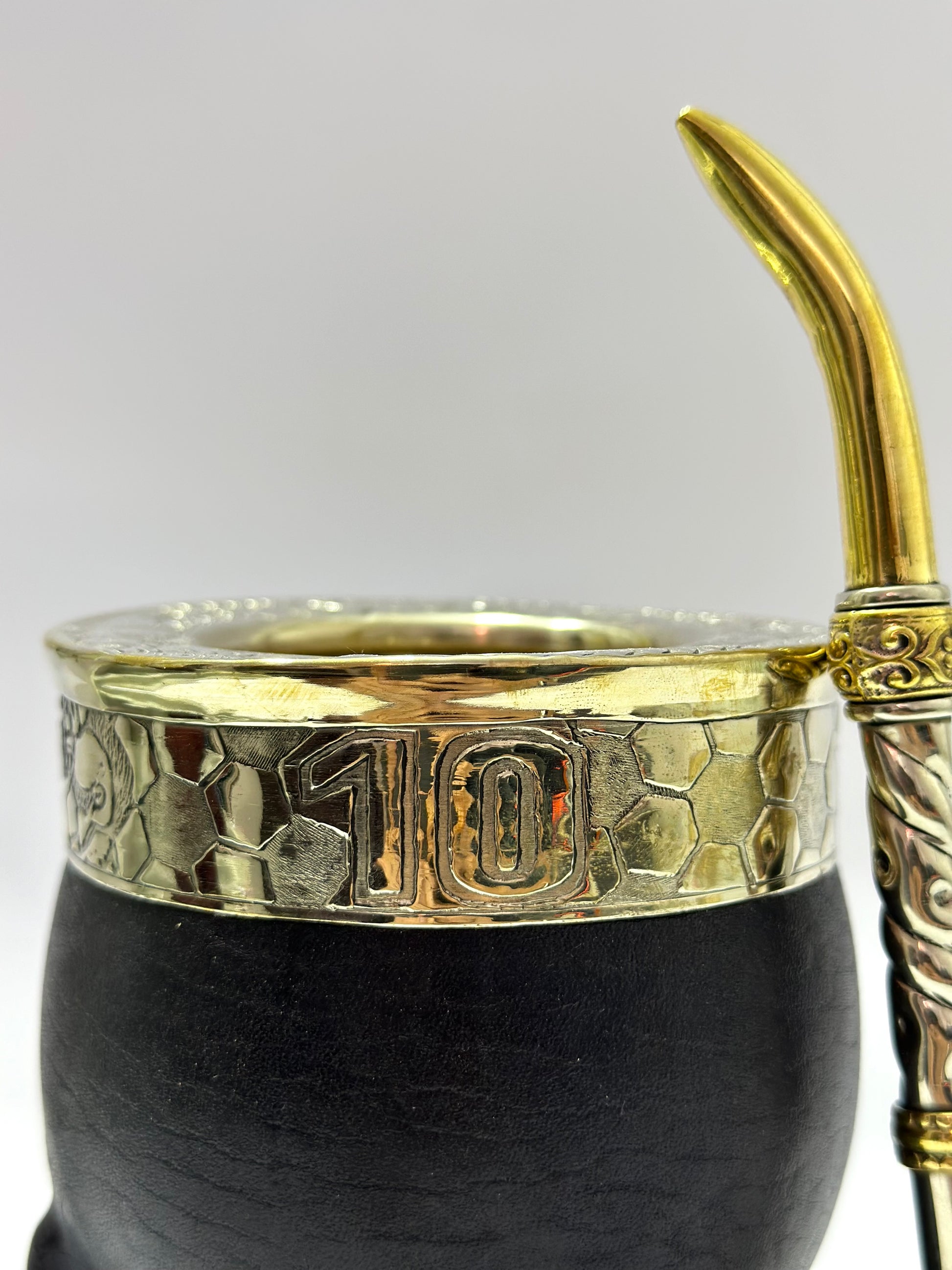 Mate imperial de calabaza con virola de alpaca Lisa personalizado con cinta en homenaje a Lionel Messi , donde se graban las tres estrellas de los mundiales , el número 10 y la Copa del mundo en sus manos, en su exterior está forrado en cuero negro.