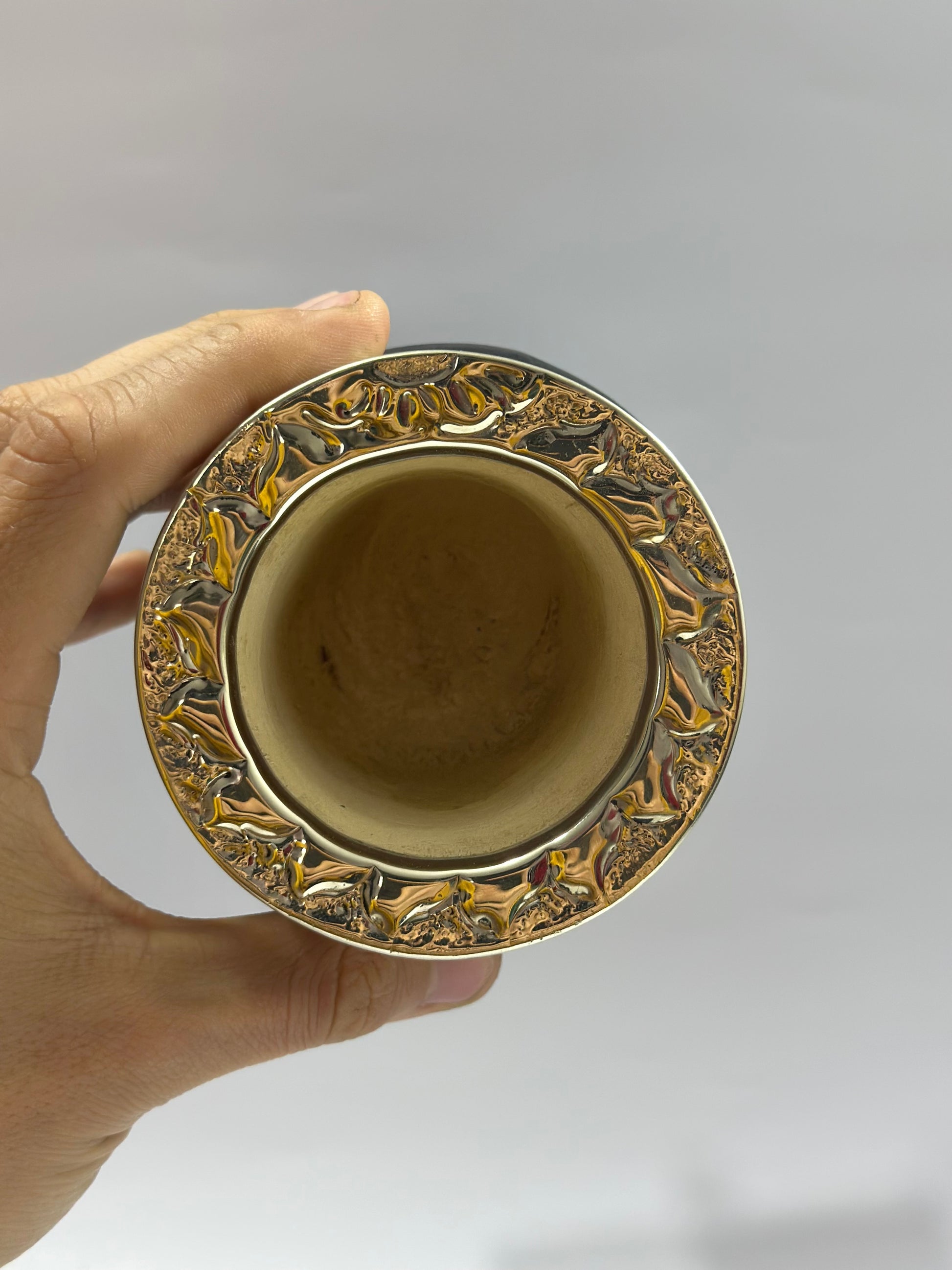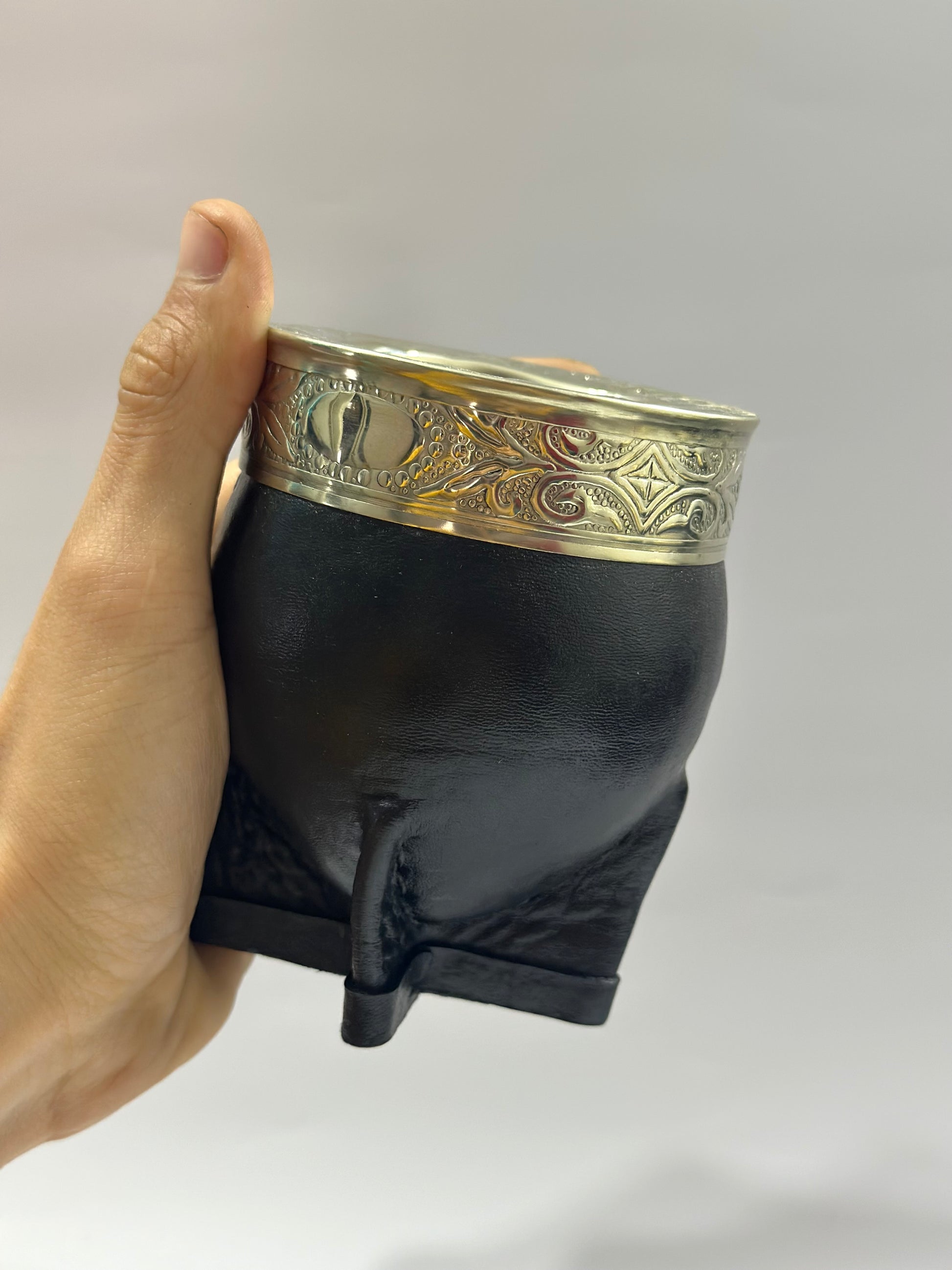 Mate imperial de calabaza virola de alpaca cincelada forrado en cuero negro.