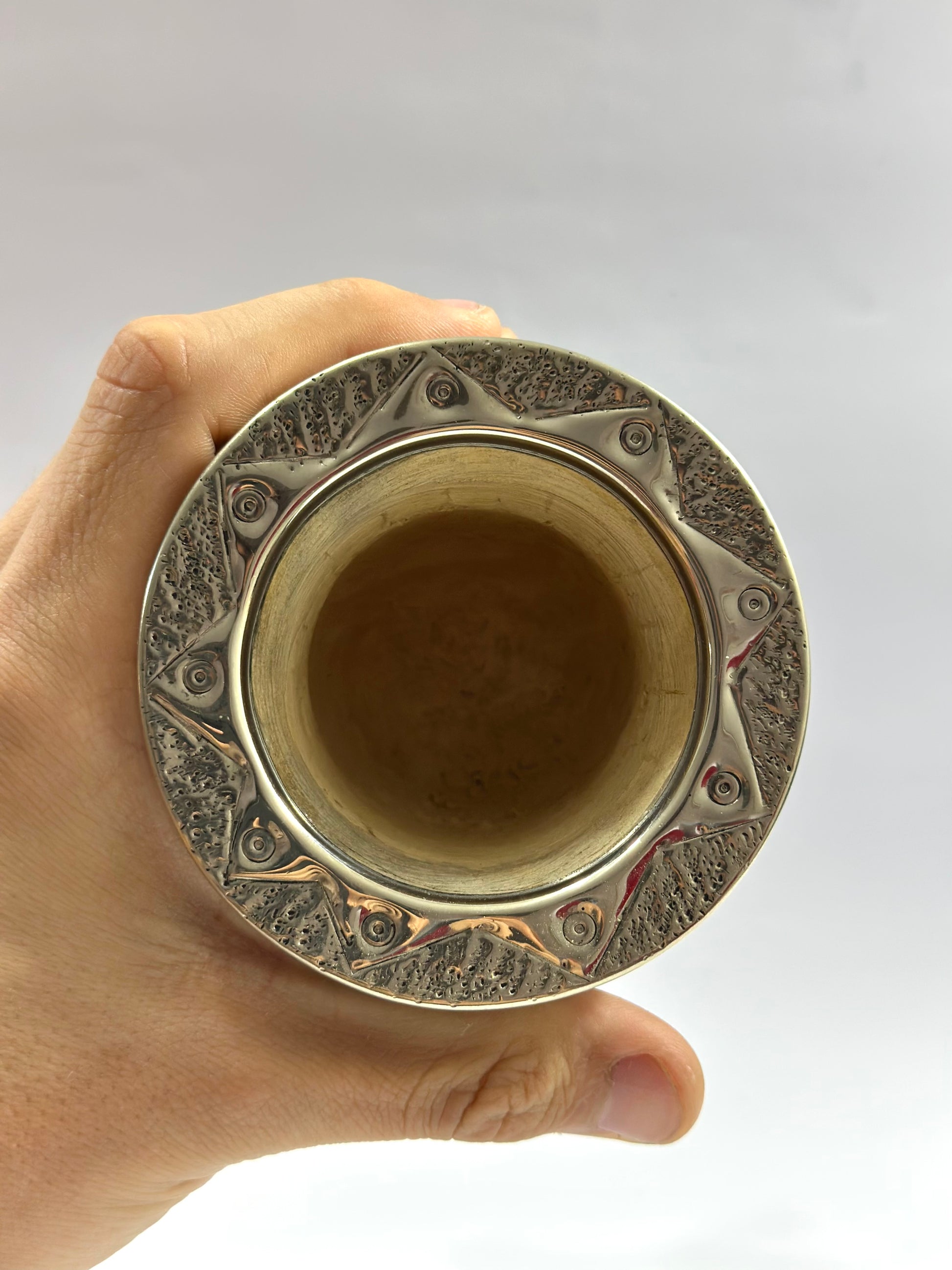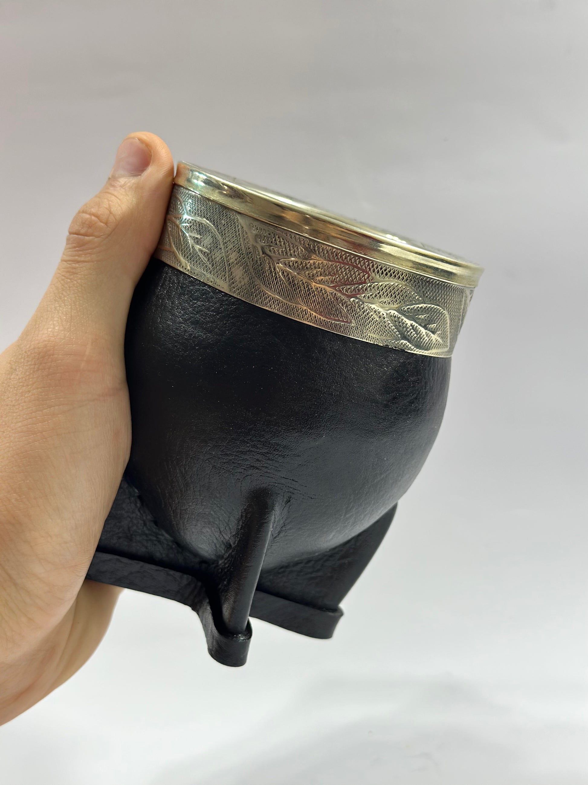 Mate imperial de calabaza con virola de alpaca cincelada, interior de calabaza argentina forrado en cuero negro liso.