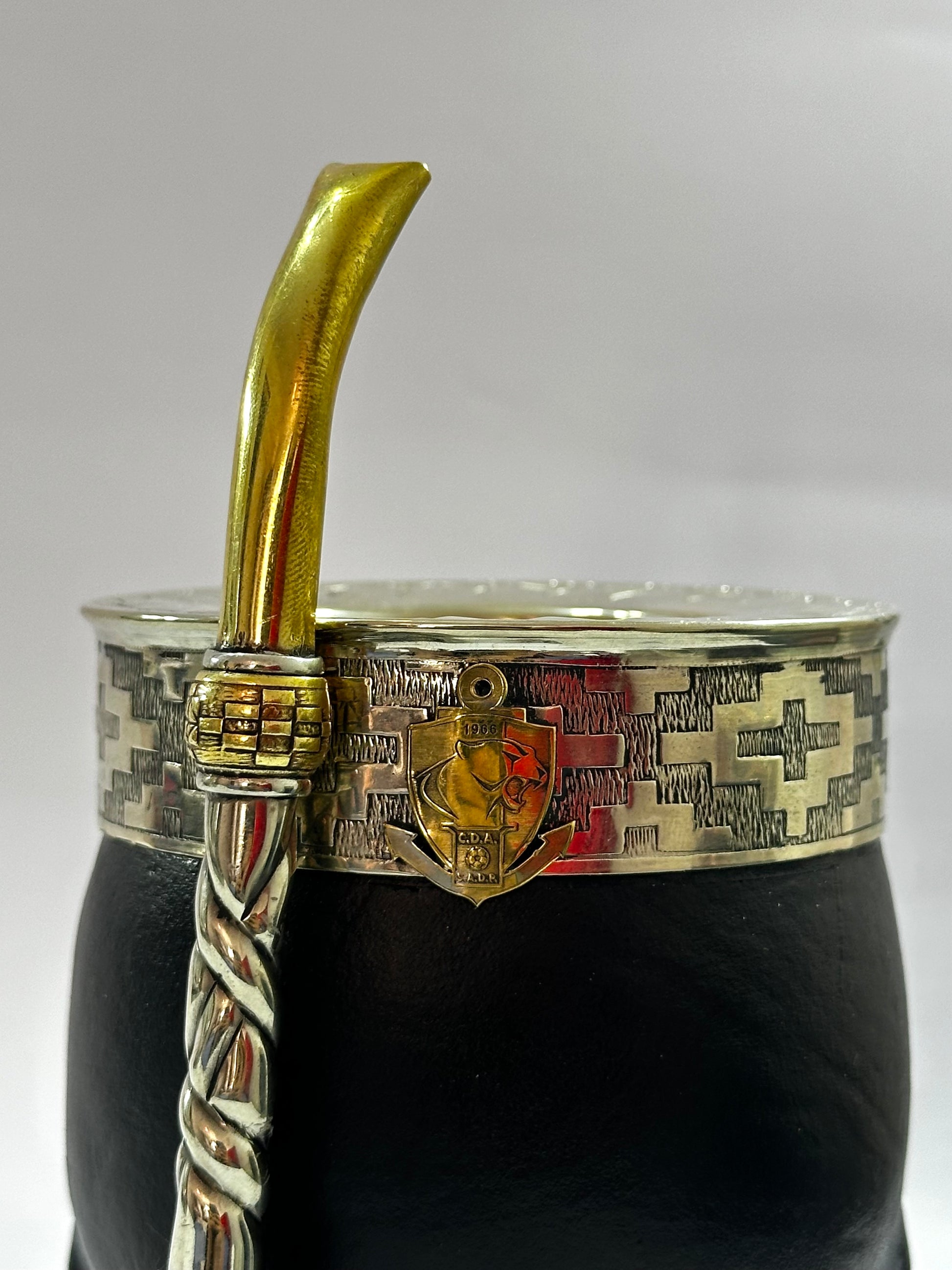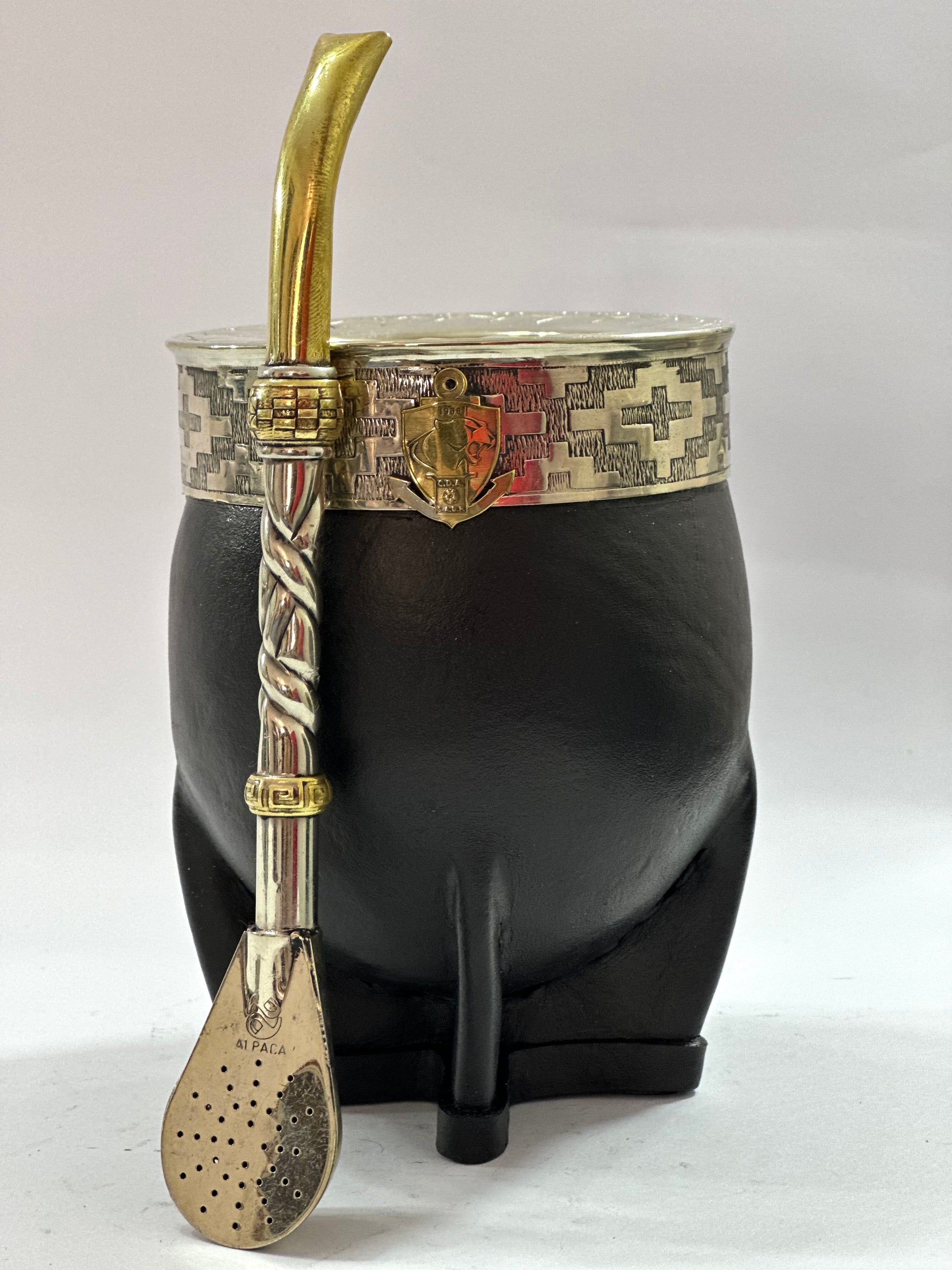 Mate imperial de calabaza con virola de Alpaca Cincelada, trabajado en cuero color negro. En su fleje de alpaca está soldado el logo del club de fútbol chileno Antofagasta y la base que posee el mate está revestida en una franja de cuero.