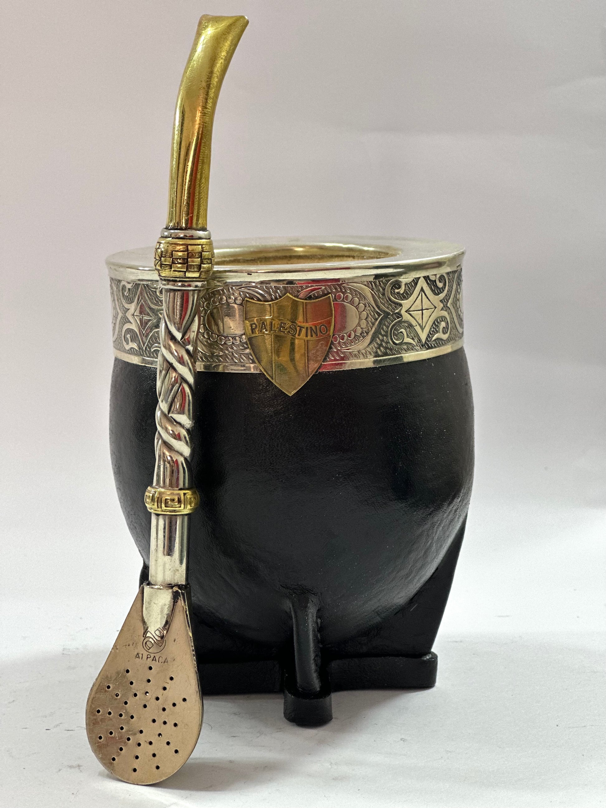 Mate imperial de calabaza con virola de alpaca cincelada, cuenta con un personalizado en bronce del escudo de palestino , en su exterior está forrado en cuero liso negro.