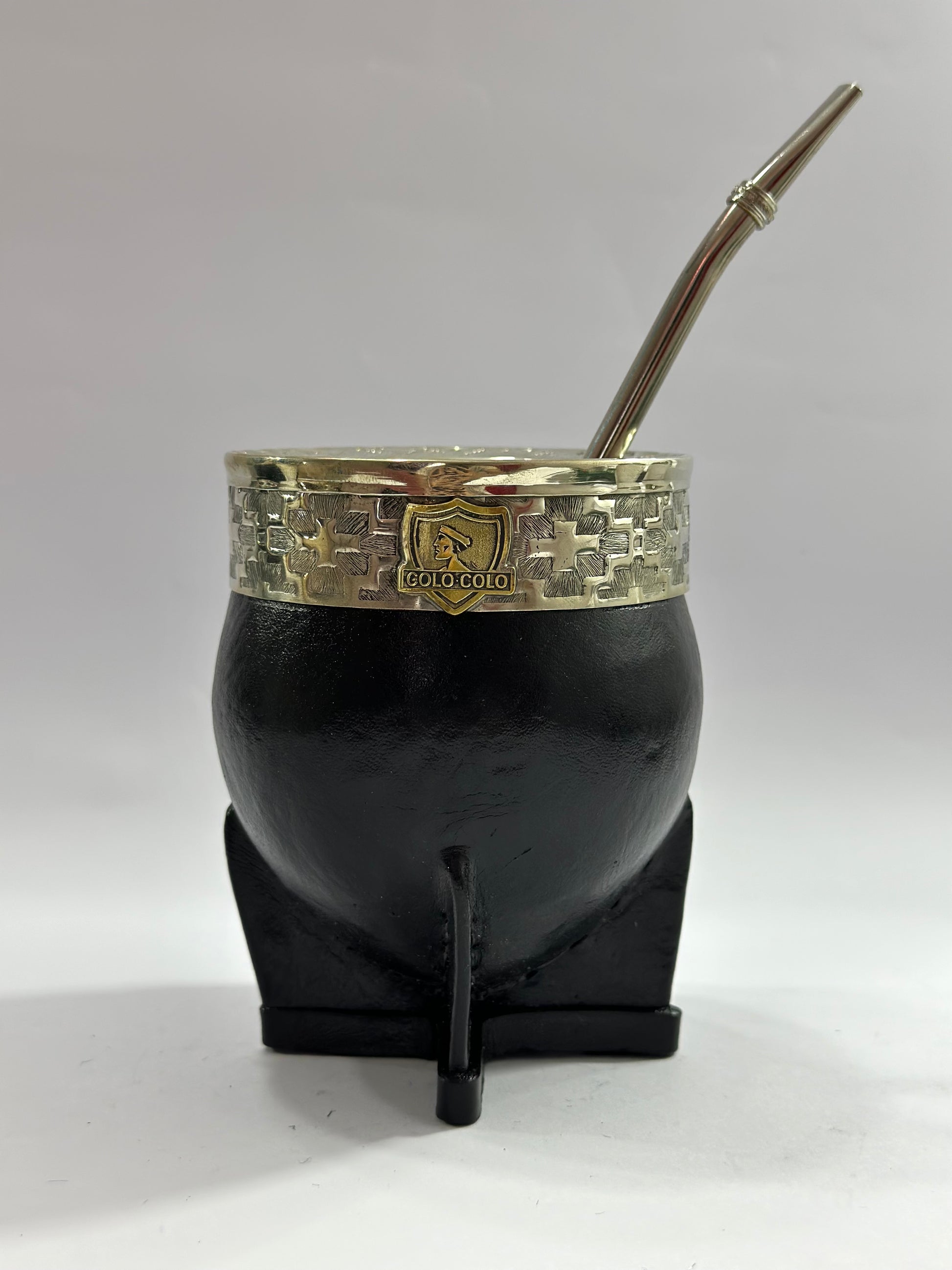 Mate imperial de calabaza con virola de alpaca cincelada trabajado en cuero negro, la particularidad de este diseño es el escudo del club Colo-Colo soldado a su estructura en bronce además viene como bombilla de Acero Inoxidable tradicional.