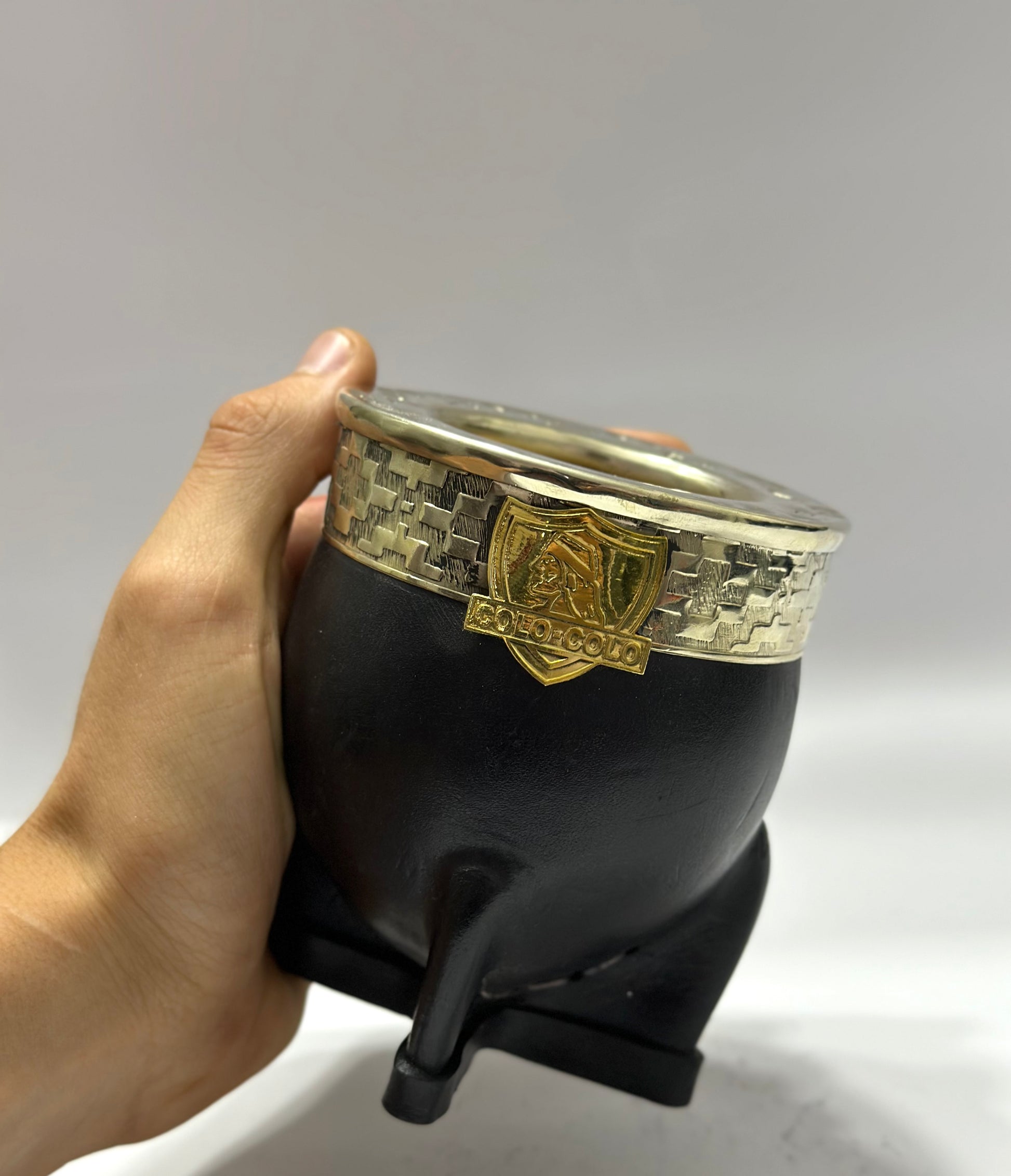Mate imperial de calabaza con virola de Alpaca Cincelada, trabajado en cuero color negro. En su fleje de alpaca está soldado el logo del club de fútbol chileno Colo-Colo y la base que posee el mate está revestida en una franja de cuero.