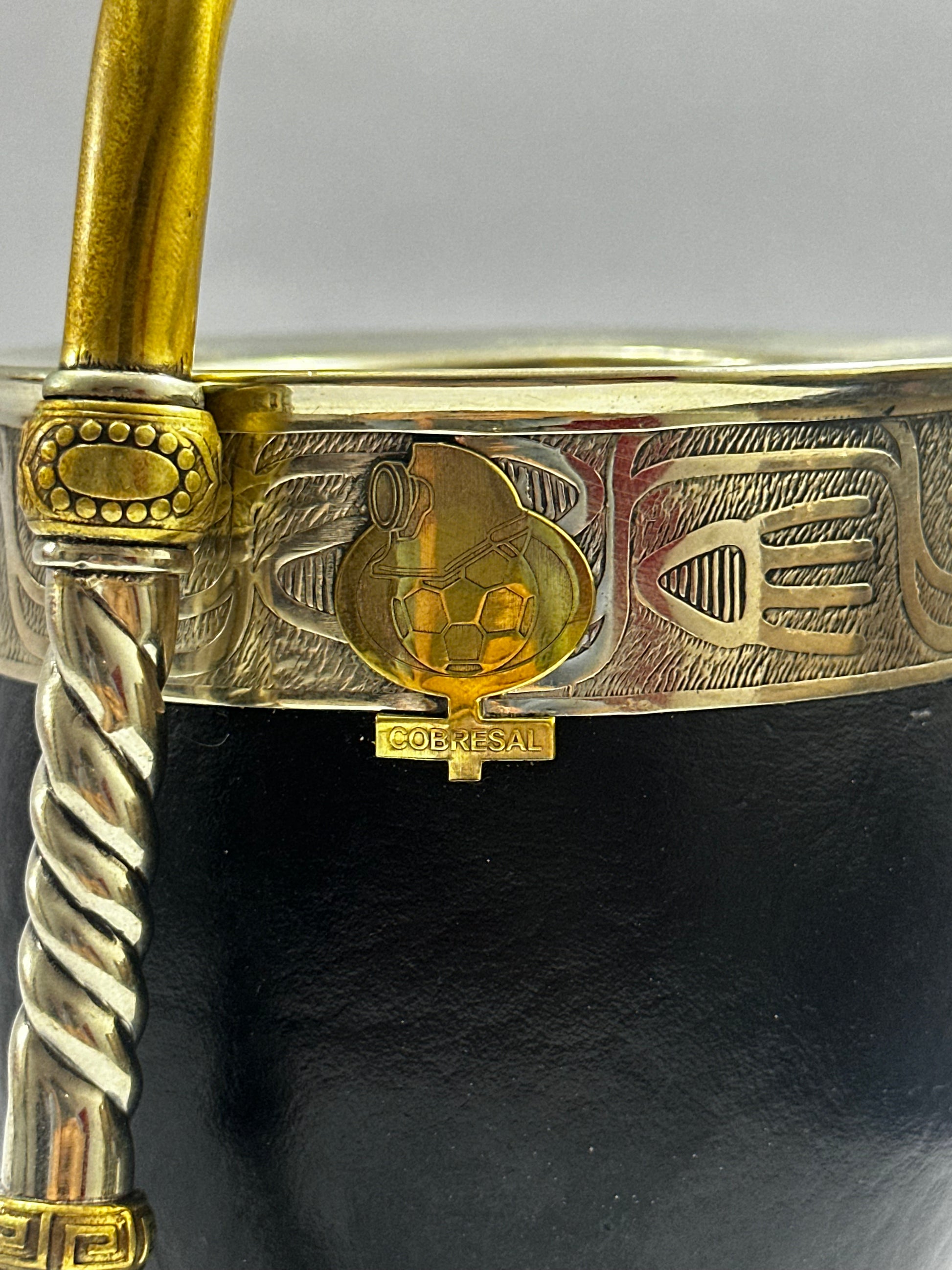Mate imperial Premium trabajado en cuero negro con virola de alpaca cincelada, este modelo se destaca por su base completa reforzada en alpaca y esferas en bronce. Además cuenta con un personalizado del escudo del club de Fútbol Cobresal .
