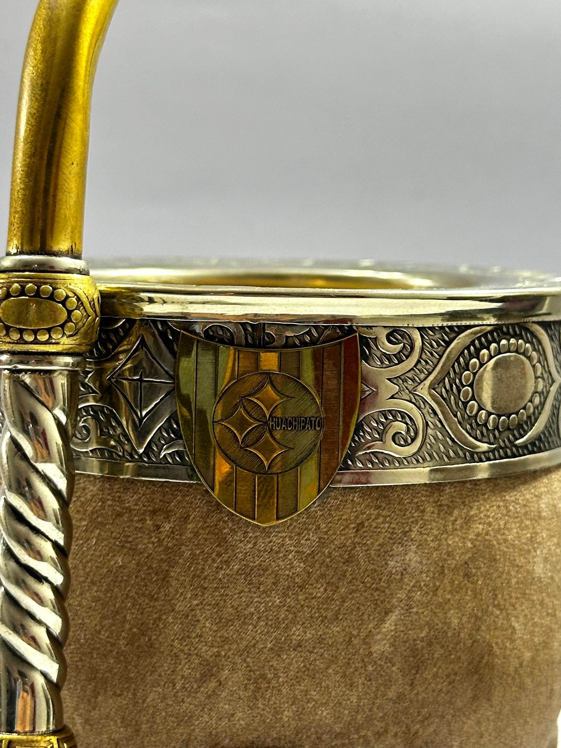 Mate imperial Premium trabajado en cuero crudo con virola de alpaca cincelada, este modelo se destaca por su base completa reforzada en alpaca y esferas en bronce. Además cuenta con un personalizado del escudo del club de Fútbol Huachipato.