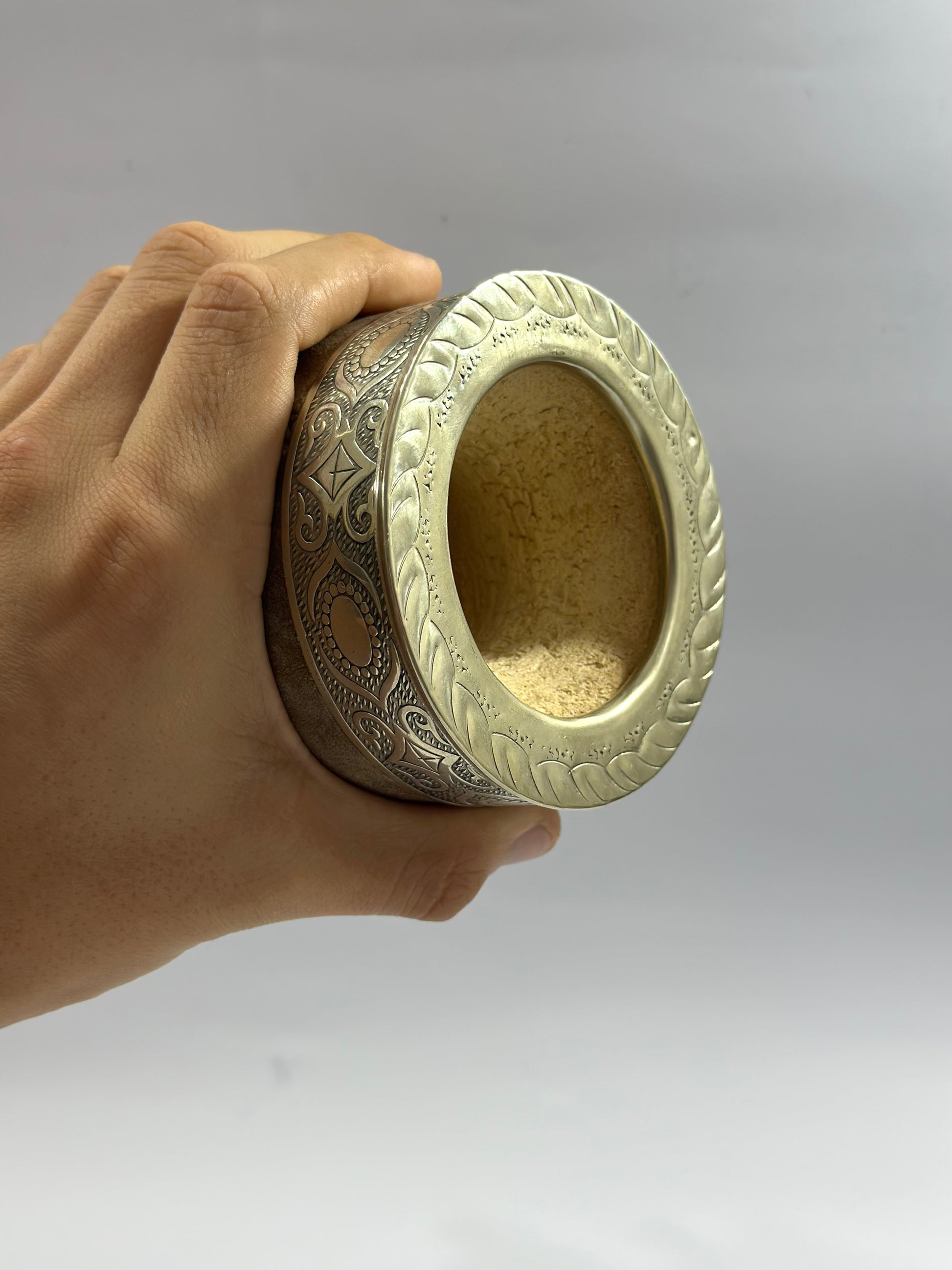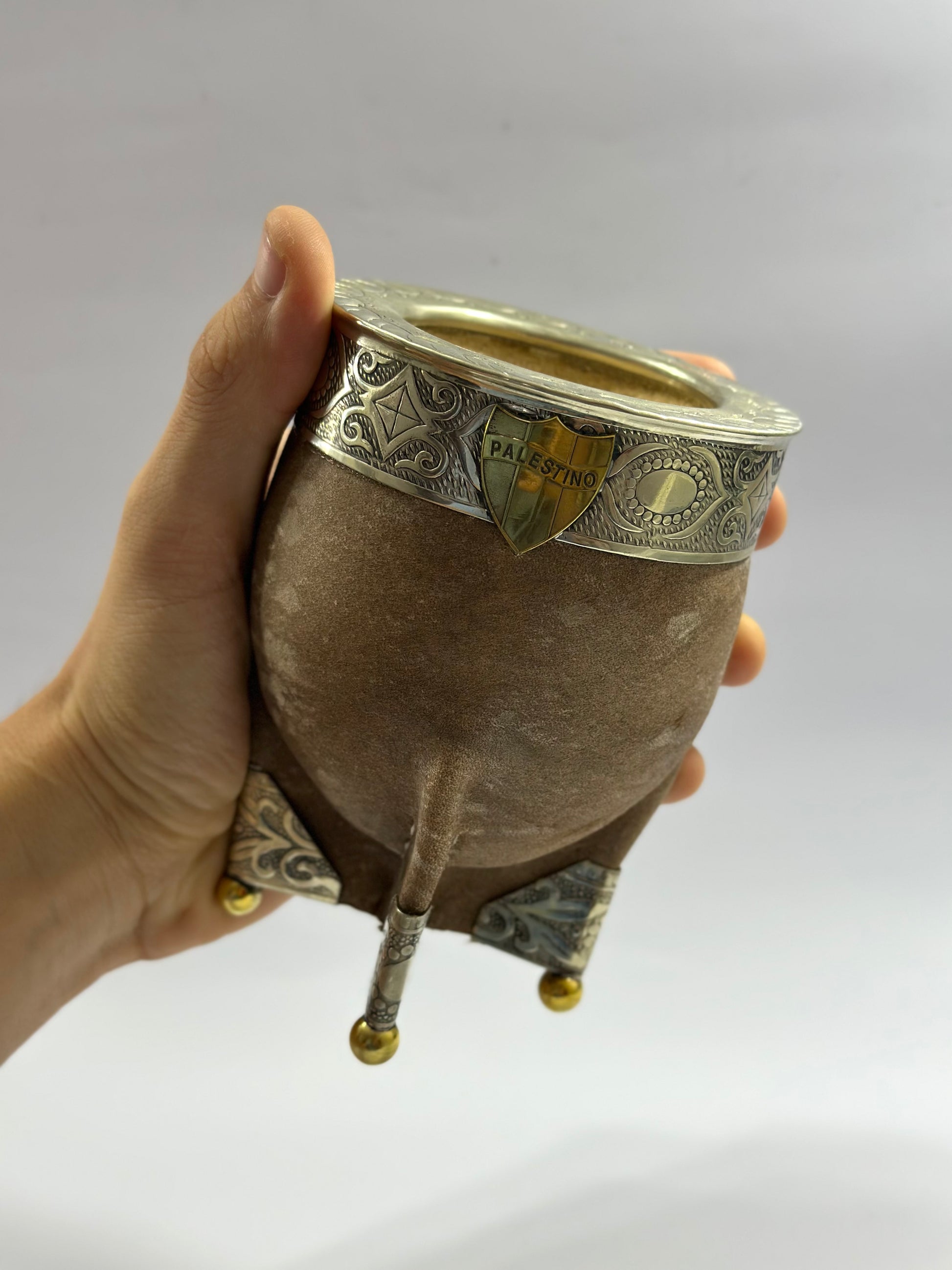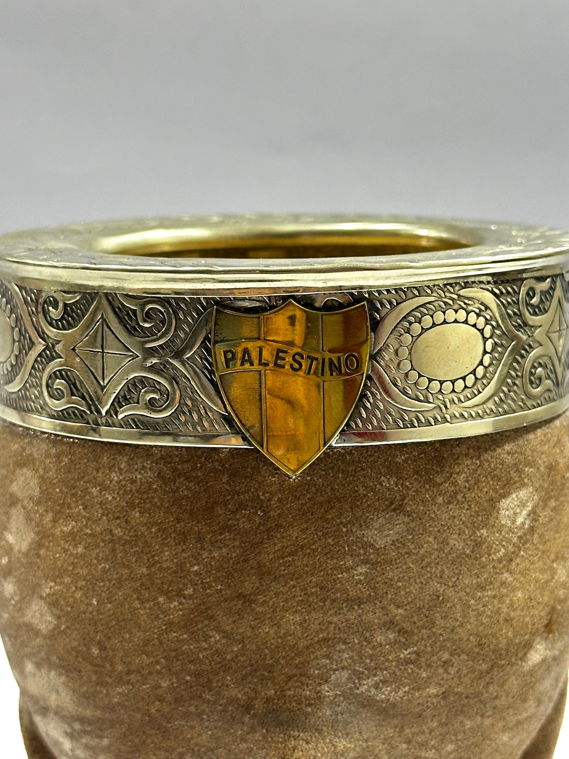 Mate imperial Premium trabajado en cuero crudo con virola de alpaca cincelada, este modelo se destaca por su base completa reforzada en alpaca y esferas en bronce. Además cuenta con un personalizado del escudo del club de Fútbol Palestino.