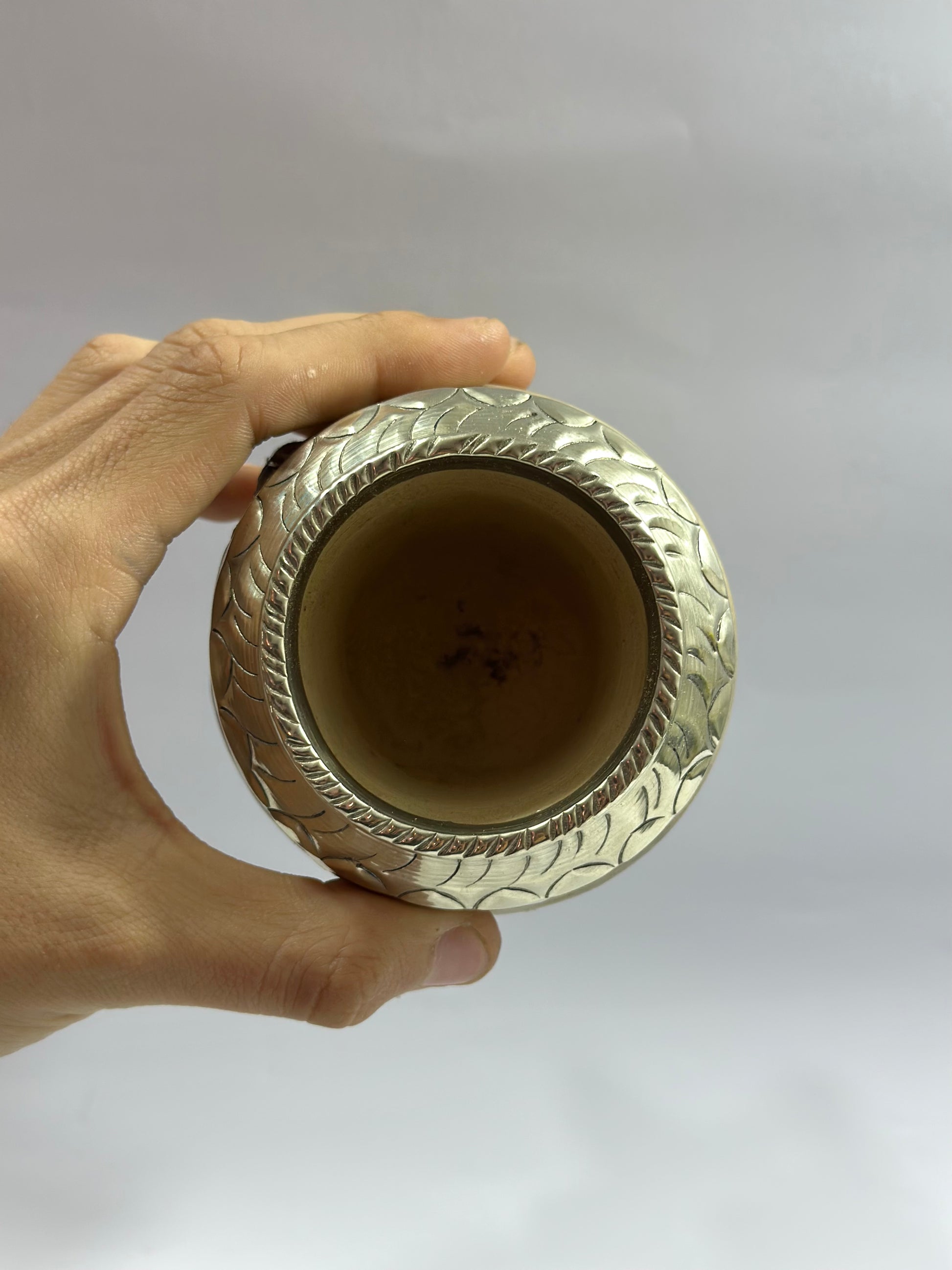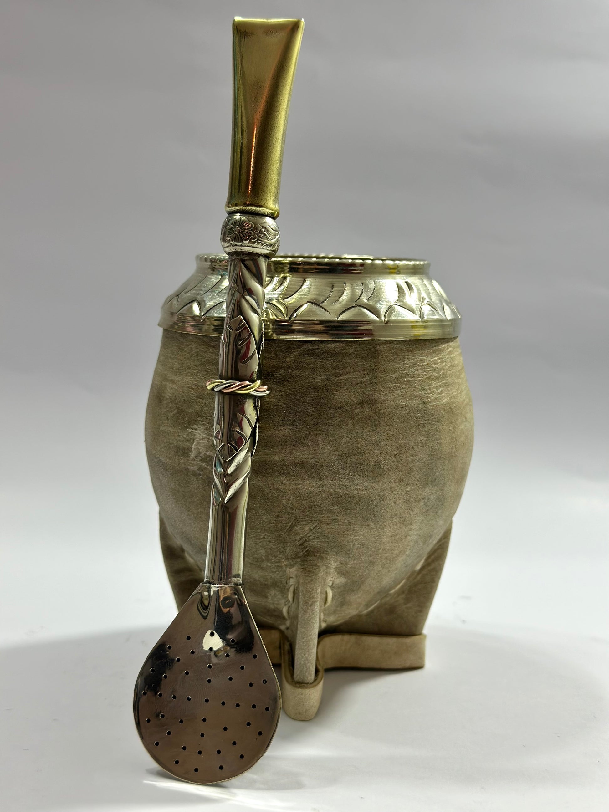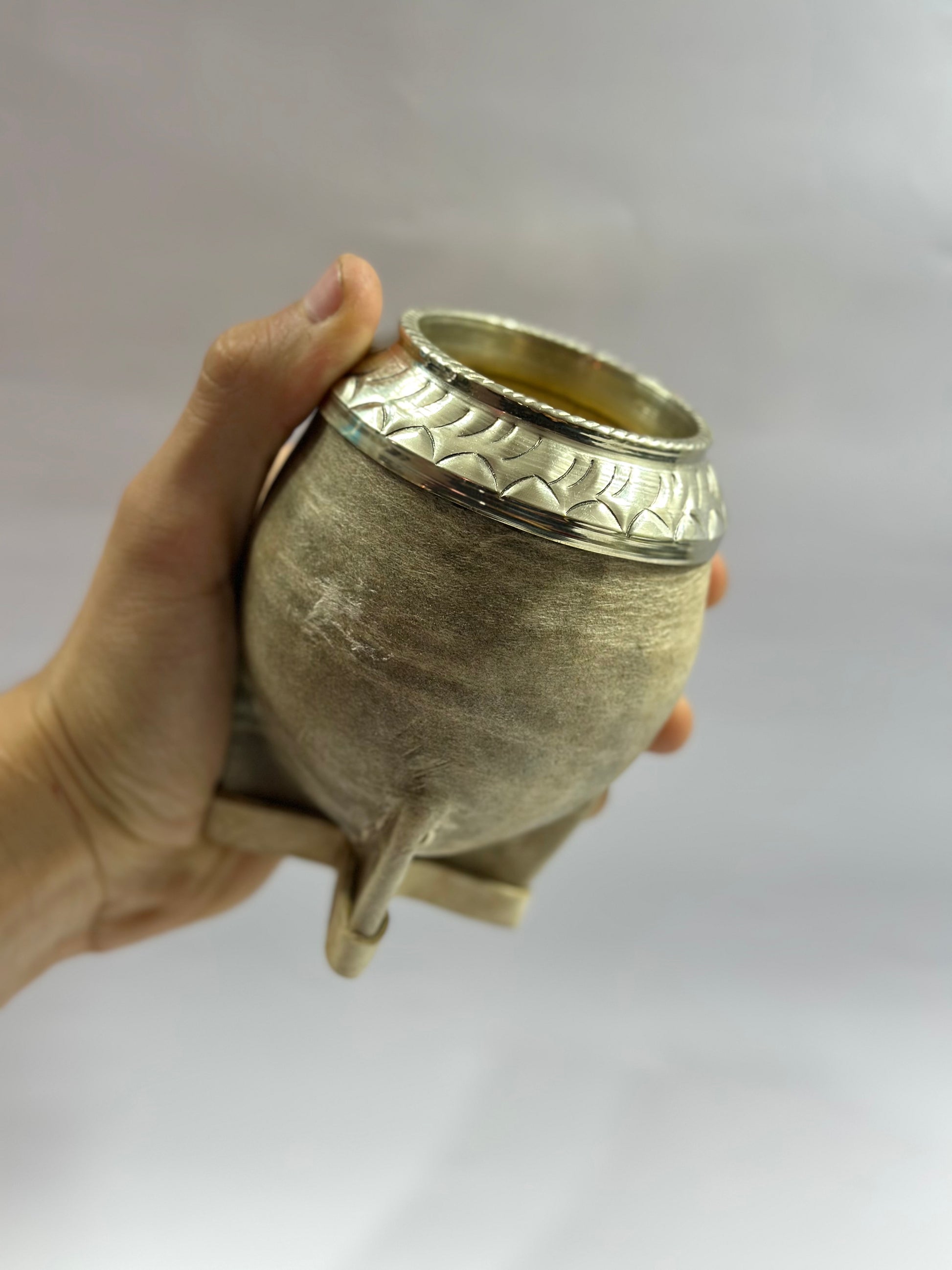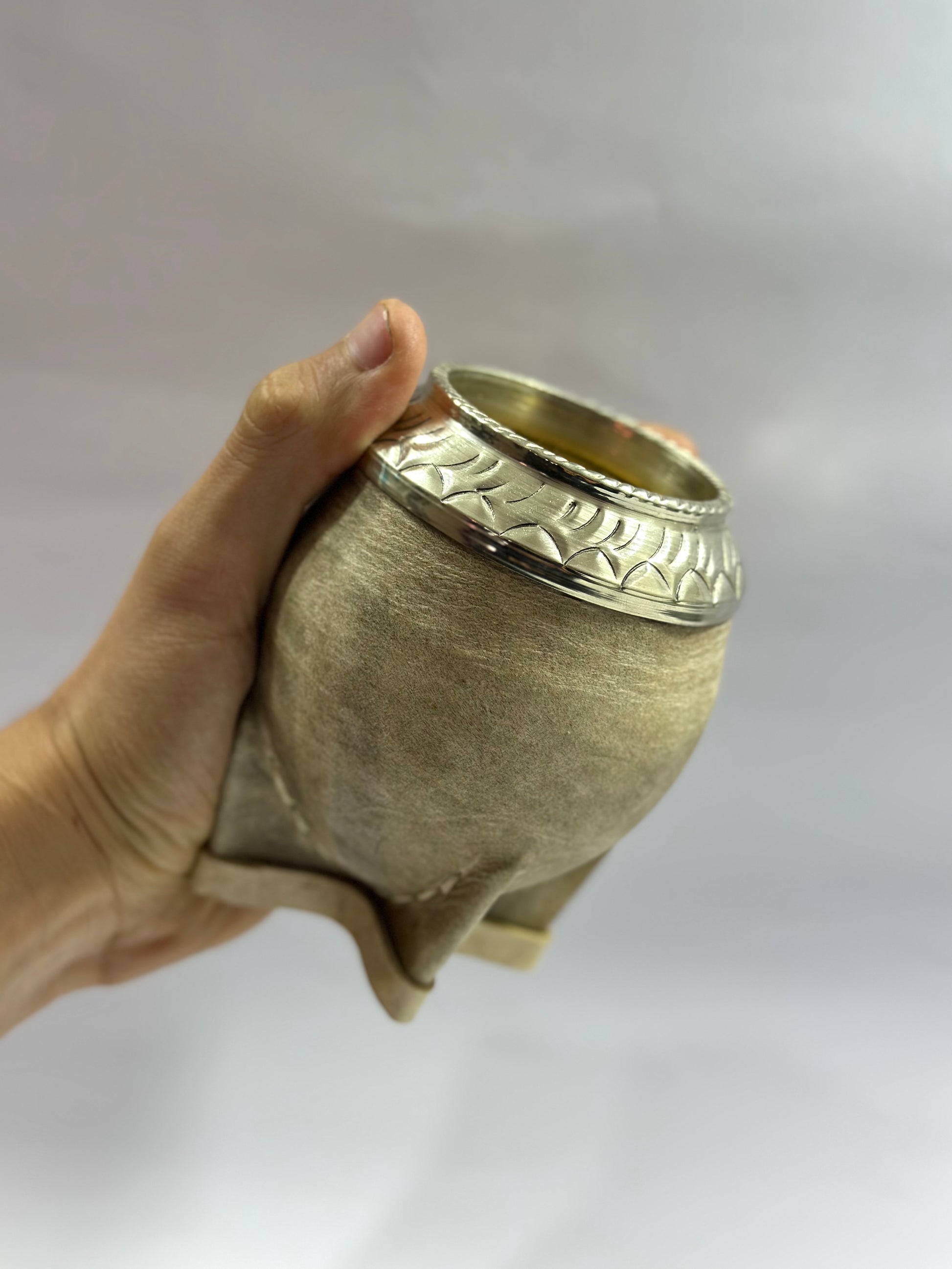Mate torpedo de calabaza con virola de alpaca cincelada, trabajado en cuero crudo, producto 100% Artesanal en el sogado del cuero crudo al sol para posterior ser trabajado.