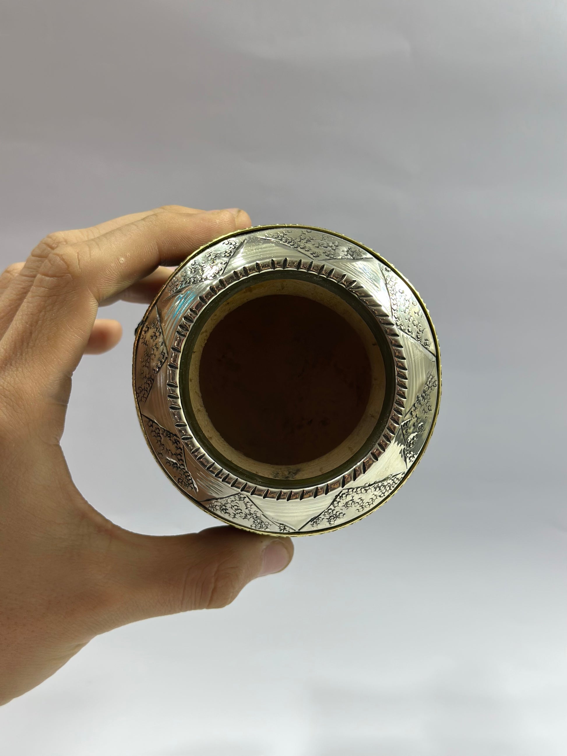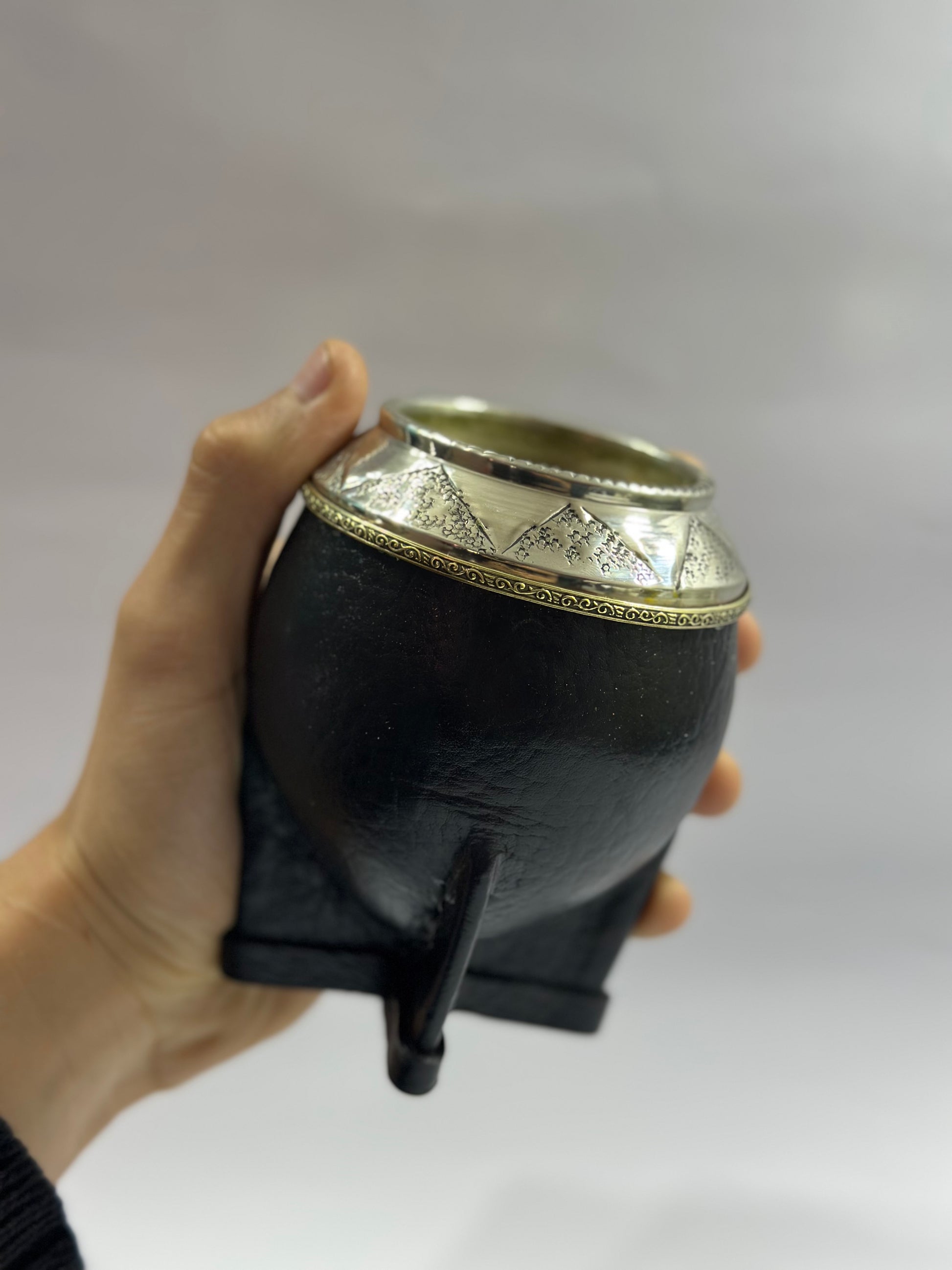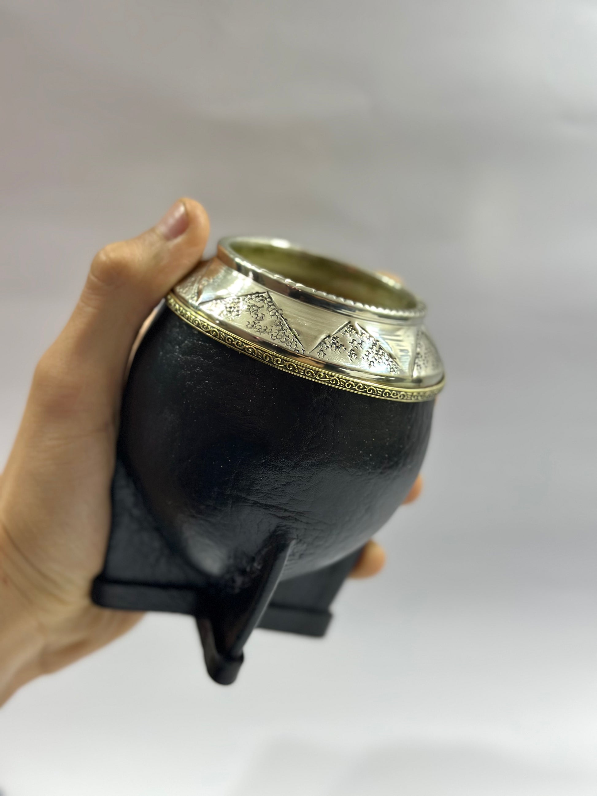 Mate torpedo de calabaza, trabajado en cuero color negro. La particularidad de este diseño en comparación al modelo tradicional. Es el fleje de bronce o corona de bronce que rodea la virola de alpaca cincelada , siendo este, soldado a su estructura.