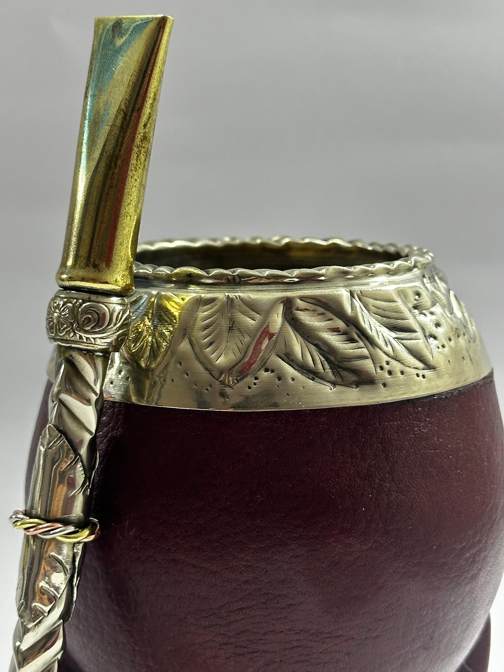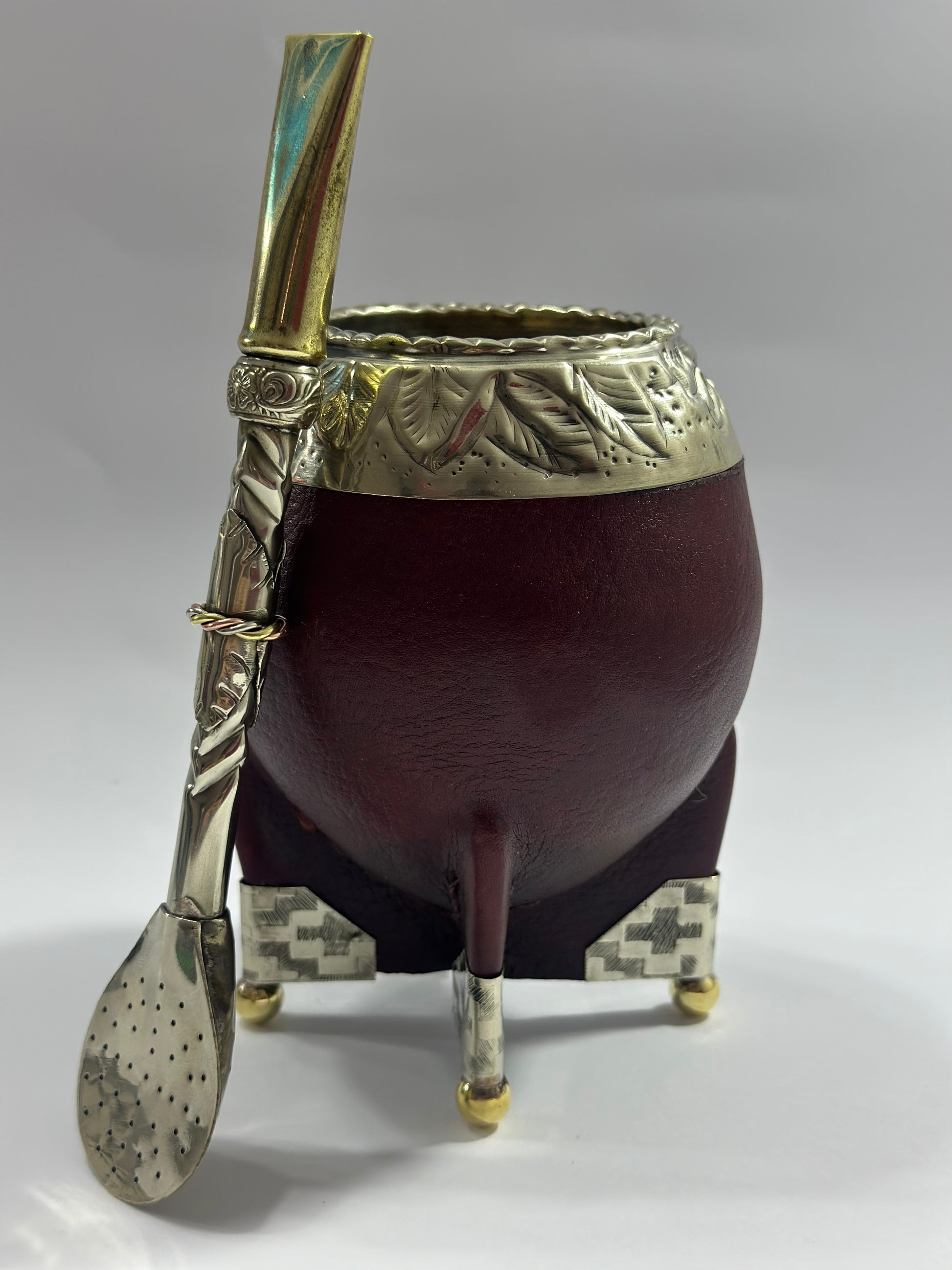 Mate torpedo de calabaza, la particularidad de este diseño en comparación a los modelos argentinos , es el tipo de virola que se utiliza y también el tamaño proporcional a la mano. La virola Uruguaya está trabajada en Lacre, el cual es un arte trabajada por artesanos a base de cincelado fino en zonas particulares de la virola , según el diseño que guste dar. Además viene con refuerzo en la base para hacerlo aún más estable con esferas de bronce y base Alpaca.