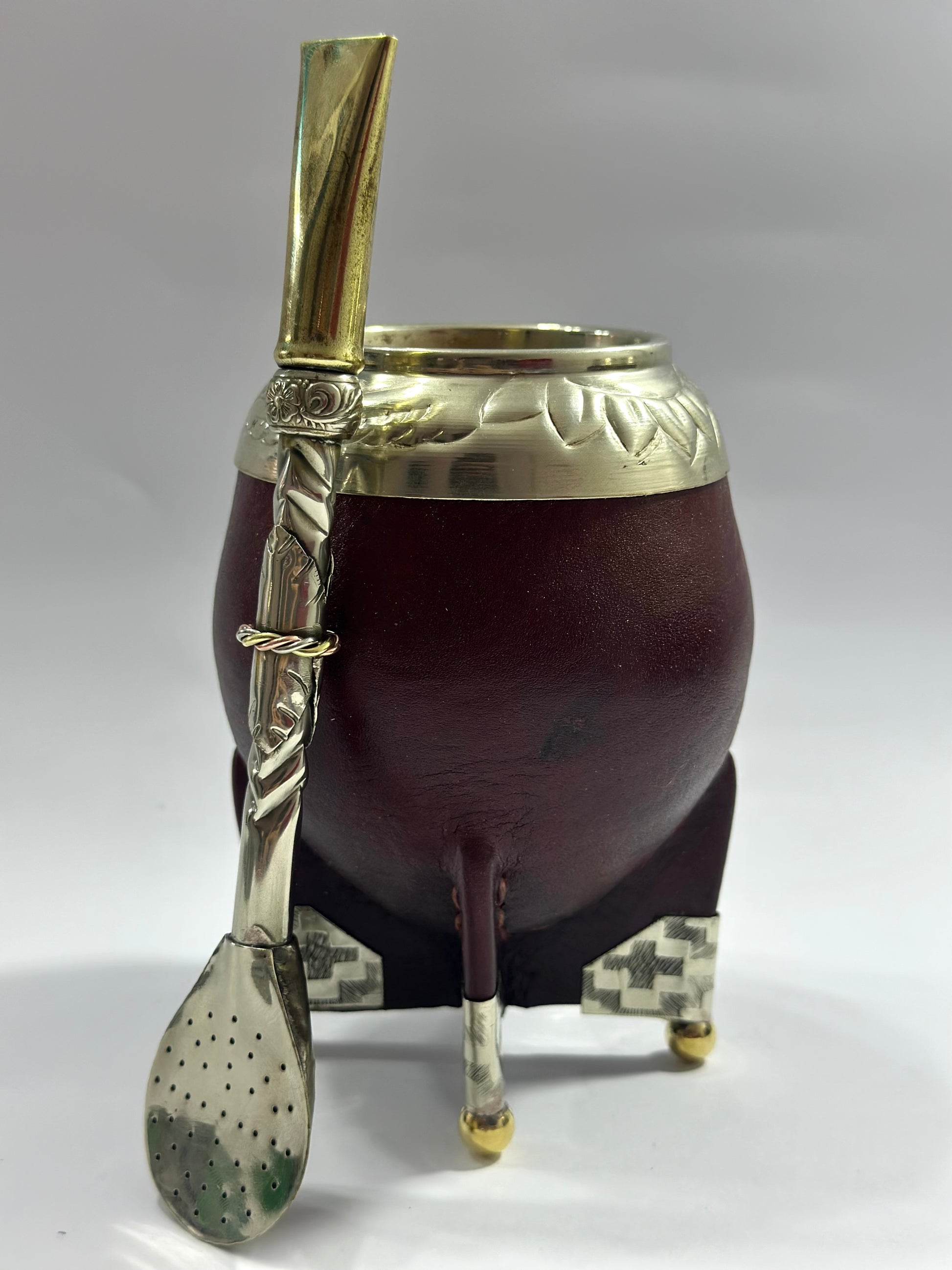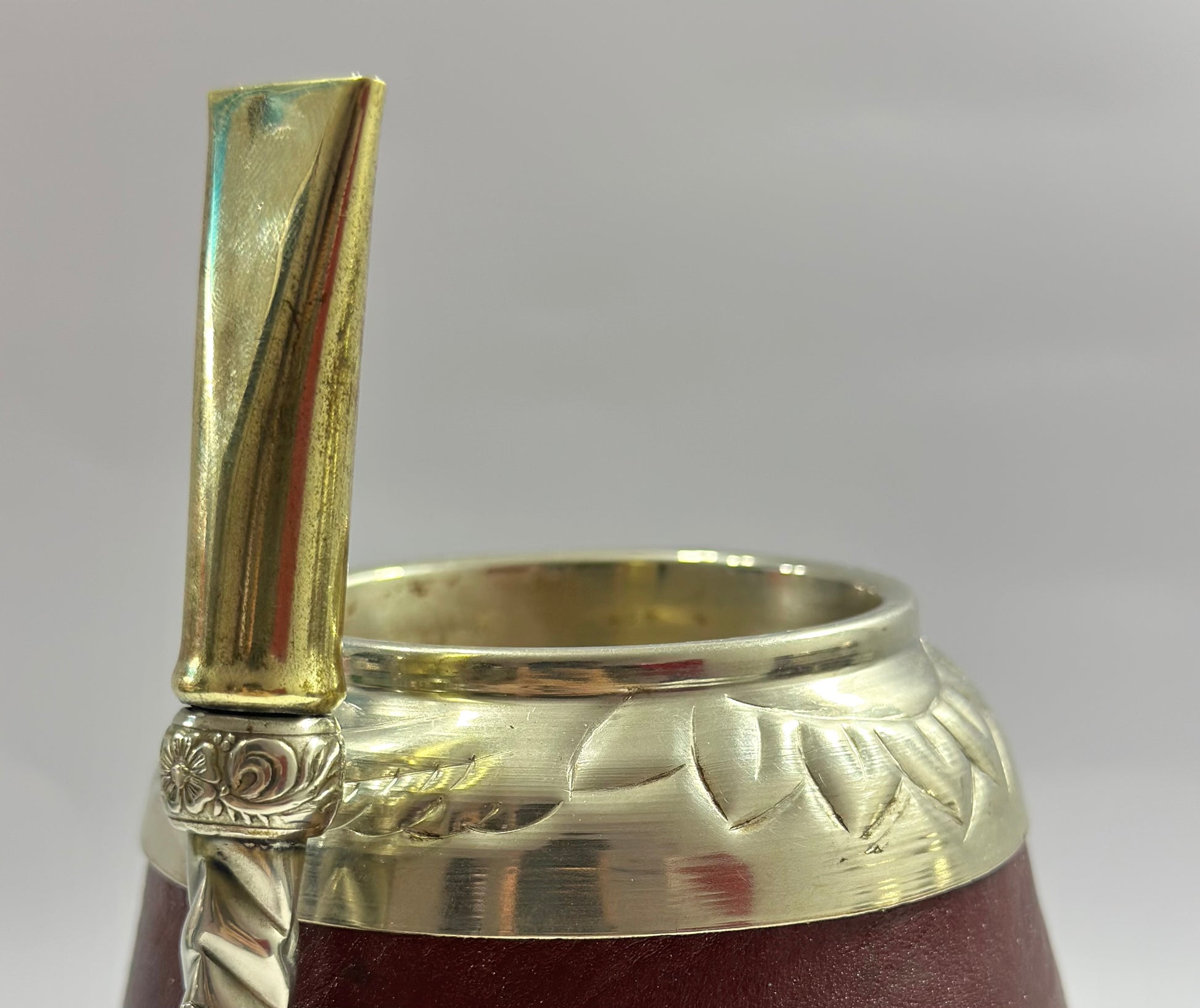 Mate torpedo de calabaza, la particularidad de este diseño en comparación a los modelos argentinos , es el tipo de virola que se utiliza y también el tamaño proporcional a la mano. La virola Uruguaya está trabajada en Lacre, el cual es un arte trabajada por artesanos a base de cincelado fino en zonas particulares de la virola , según el diseño que guste dar. Además viene con refuerzo en la base para hacerlo aún más estable con esferas de bronce y base Alpaca.