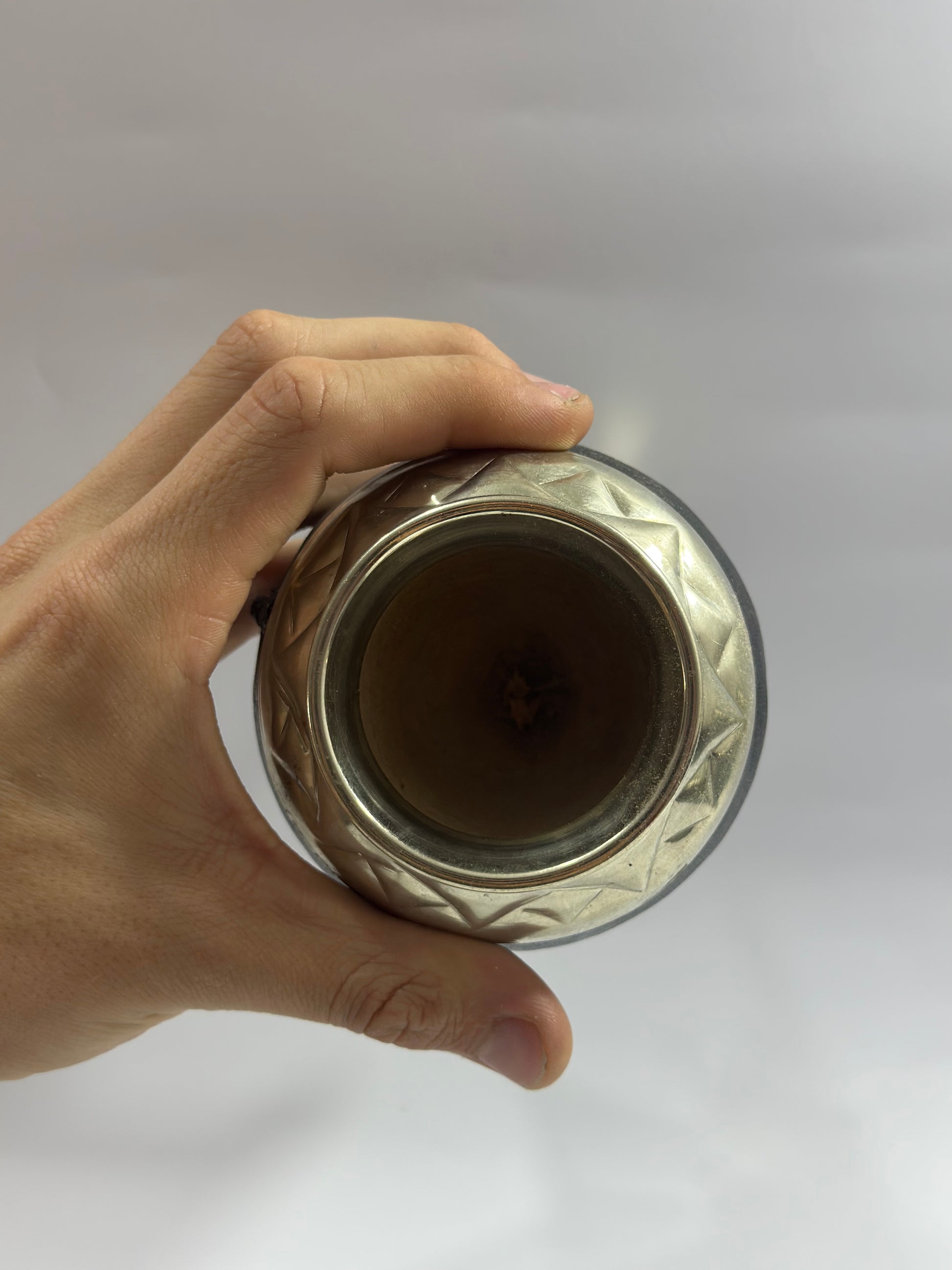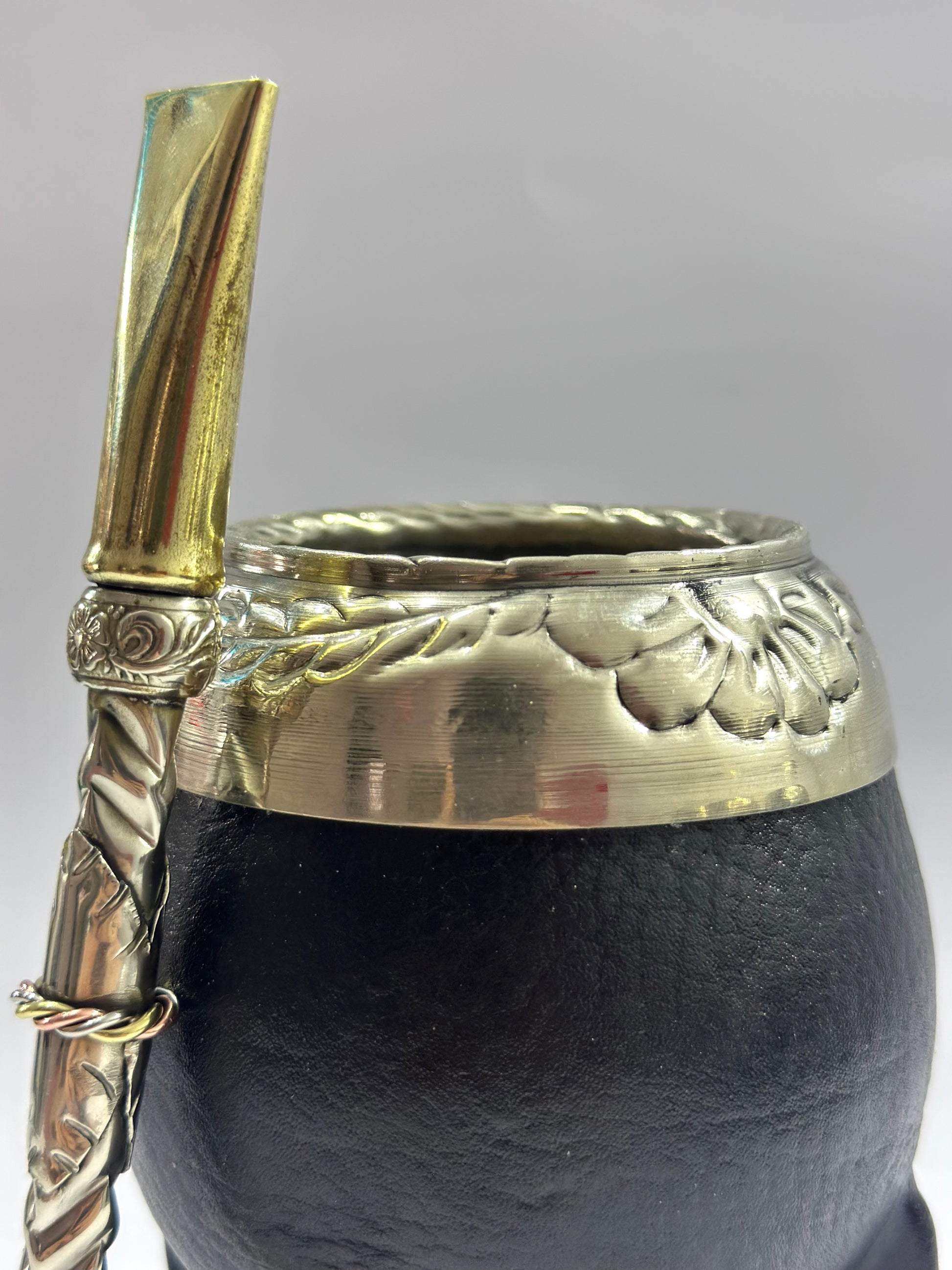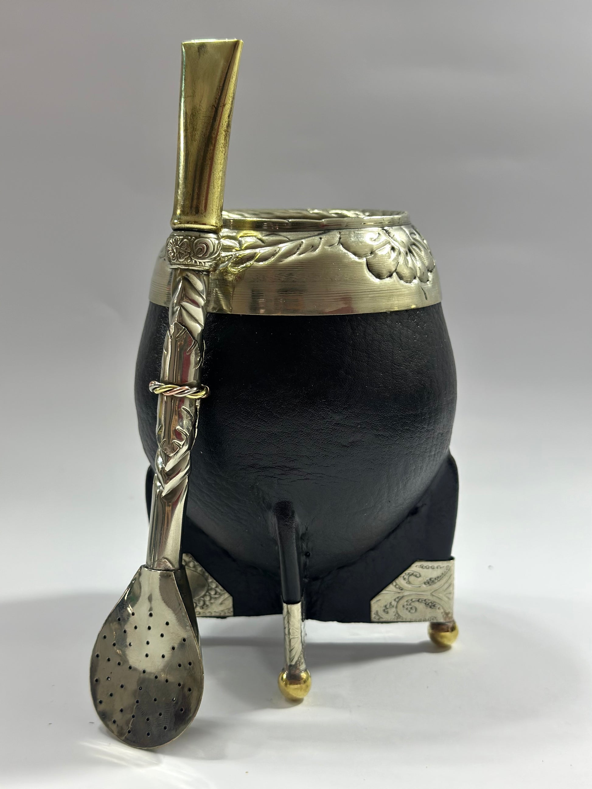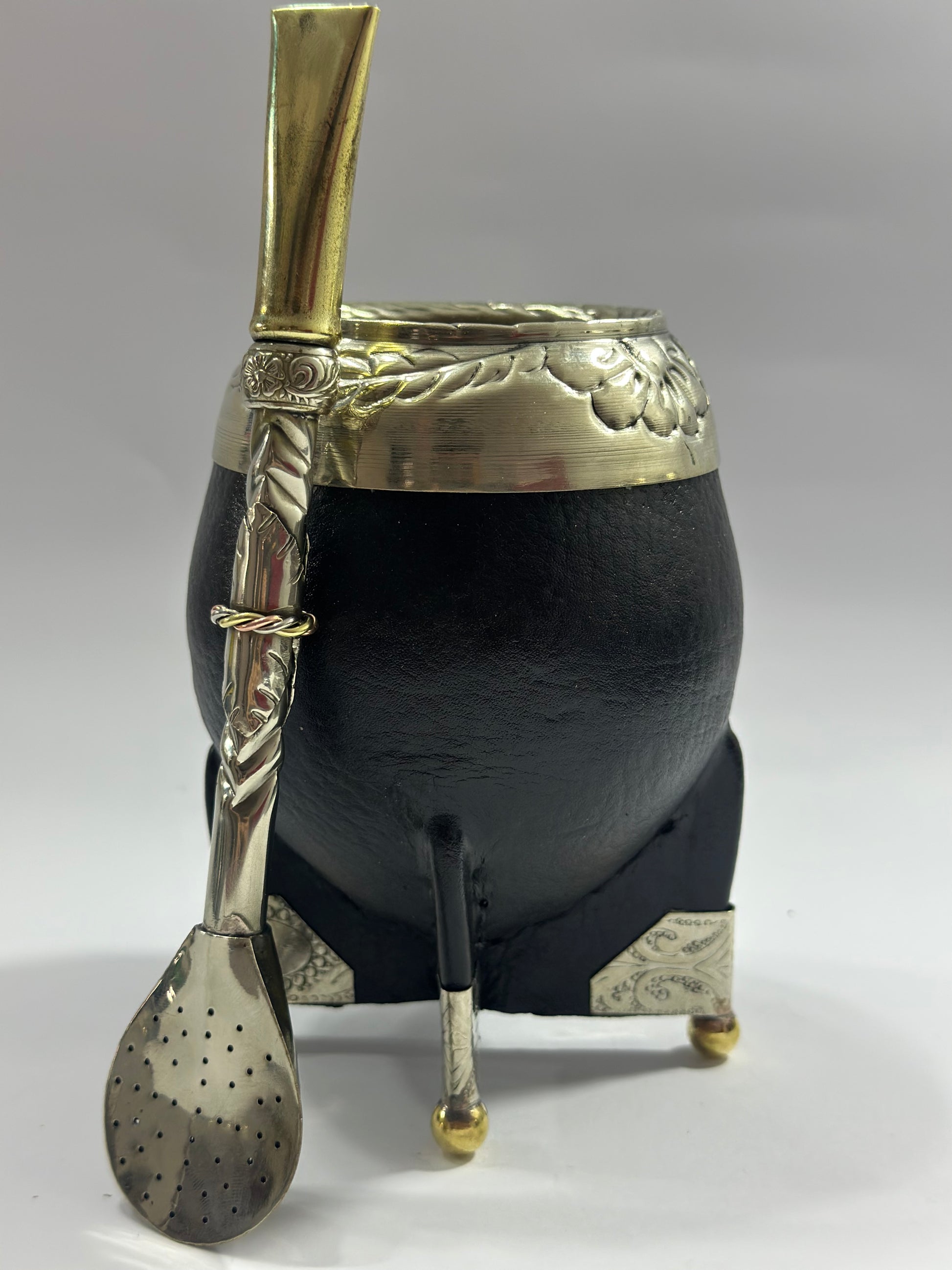 Mate torpedo de calabaza, la particularidad de este diseño en comparación a los modelos argentinos , es el tipo de virola que se utiliza y también el tamaño proporcional a la mano. La virola Uruguaya está trabajada en Lacre, el cual es un arte trabajada por artesanos a base de cincelado fino en zonas particulares de la virola , según el diseño que guste dar. Además viene con refuerzo en la base para hacerlo aún más estable con esferas de bronce y base Alpaca.