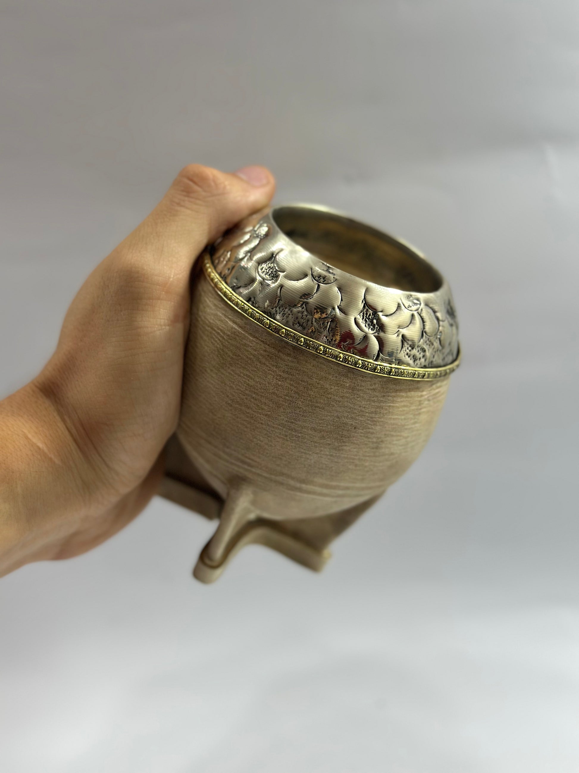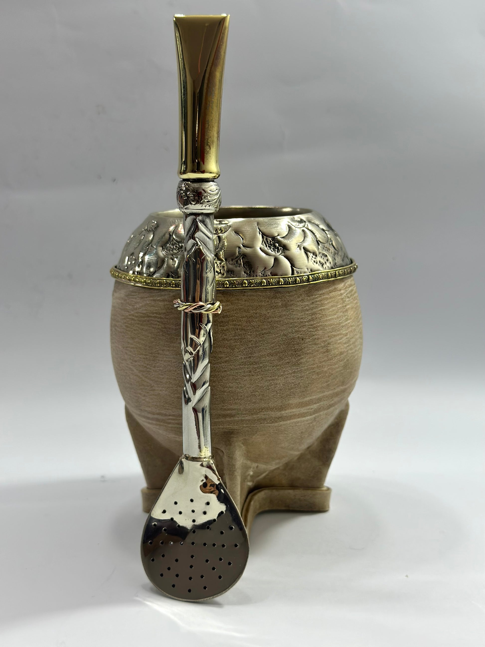 Torpedo de calabaza trabajado en todo su exterior con cuero crudo de selección. Además su virola es de origen uruguaya la cual suele ser más grande a la tradicional, siendo así, compacta a su estructura para luego trabajar el cincelado en lacre por sobre el molde , en esta ocasión es un cincelado con diseño de flor y hojas, en la parte superior lleva soldado una hebra de bronce , para así brindar un plus estético y elegante a diferencia de otros modelos tradicionales.